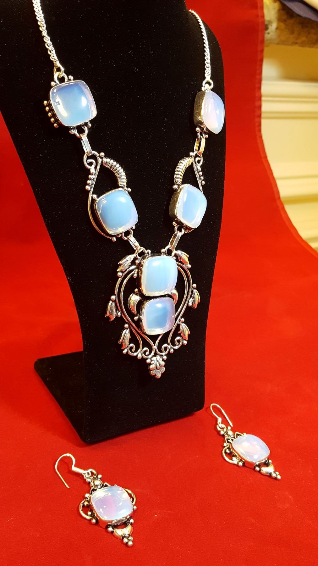 Stunning luimicent 330ctw opalite necklace and earring set. Mounted in .925 sterling silver. 18" long. This necklace set just bursts out with a full spectrum of color play. Absolutely beautiful.