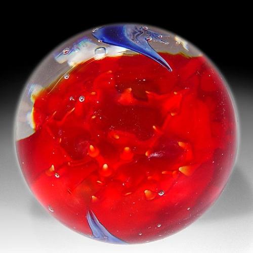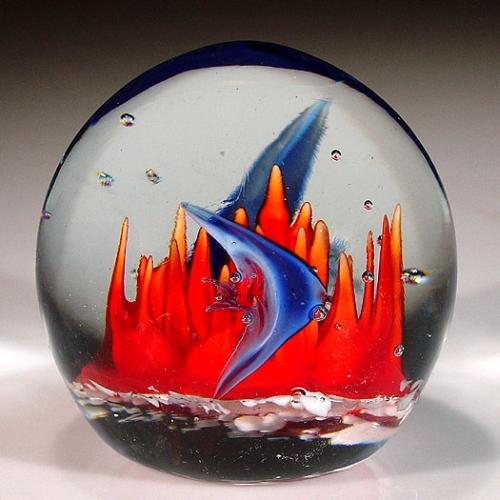 Miscellaneous angelfish paperweight, with two blue angelfish, swimming past spikes of bright red coral, over speckled white ground. Diameter 2 3/4". NO RESERVE