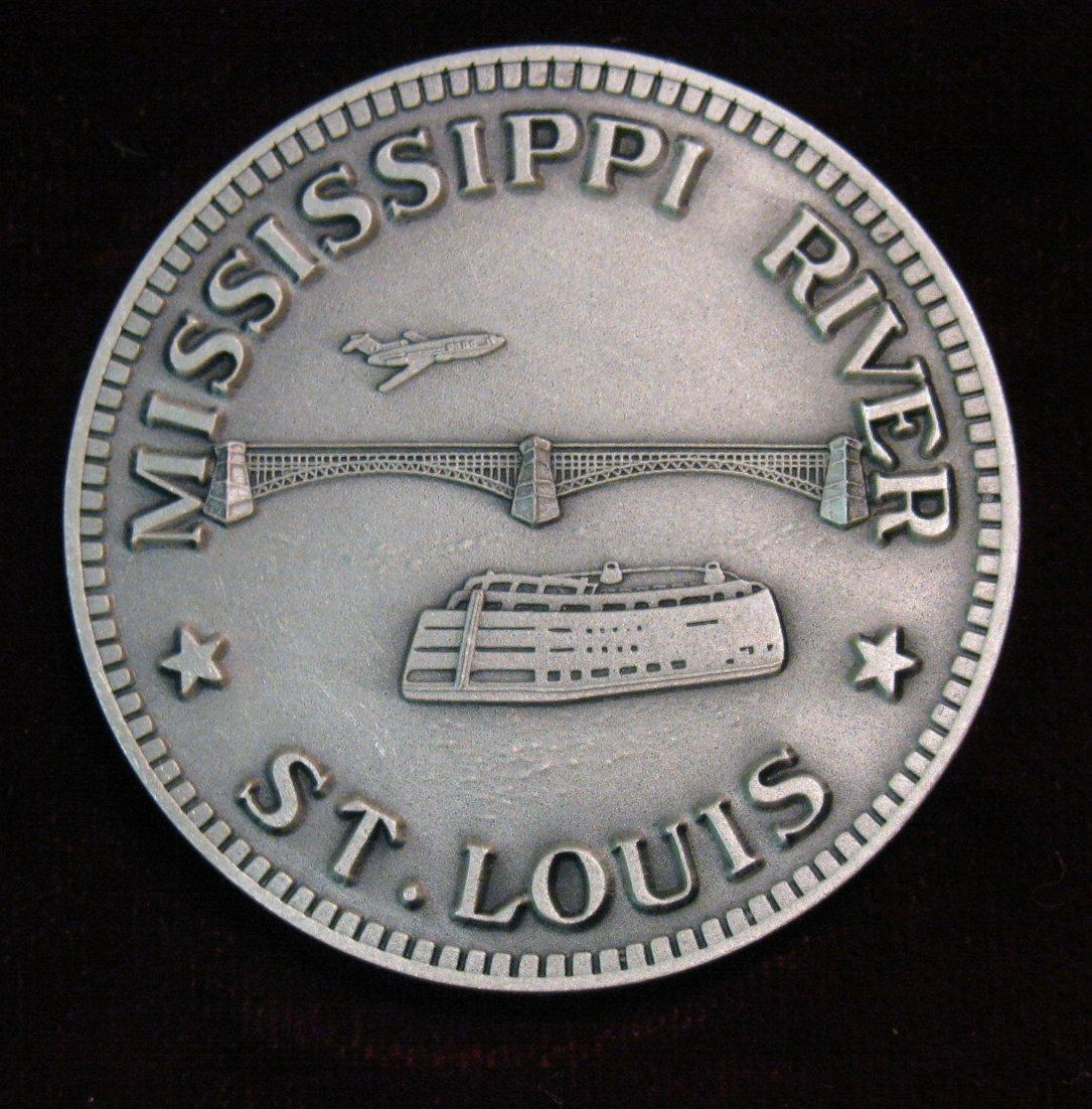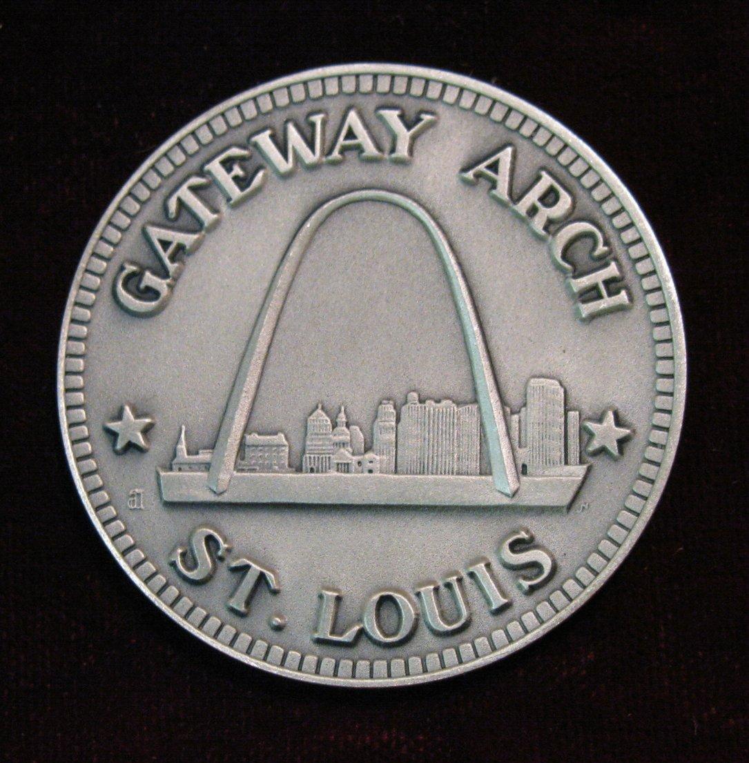 331. "Gateway Arch/St. Louis", "Mississippi River/St. Louis" Contains 1.1130 ozs. .999 Fine Silver. First Edition American Mint Association. Matte finish. 39mm.