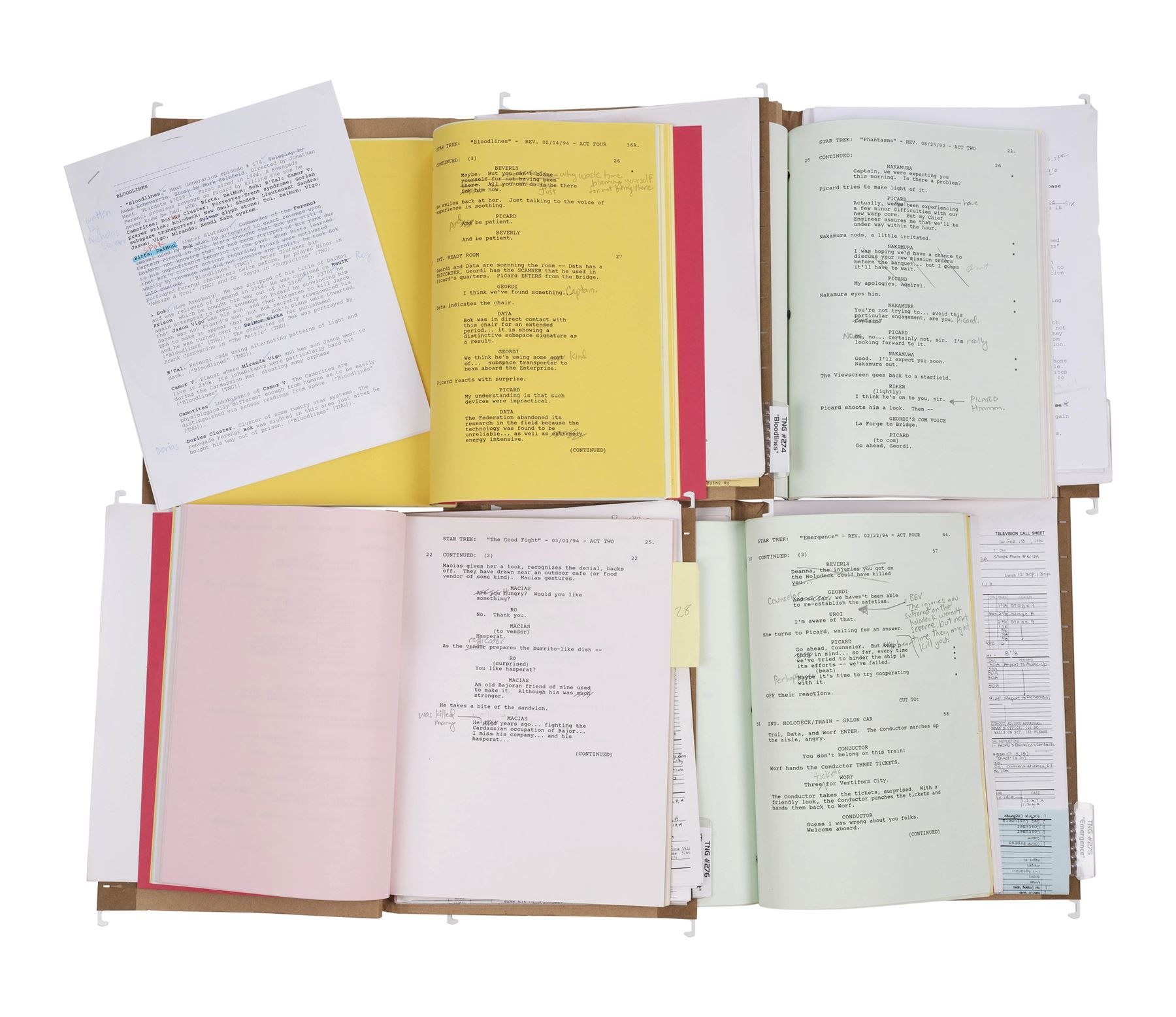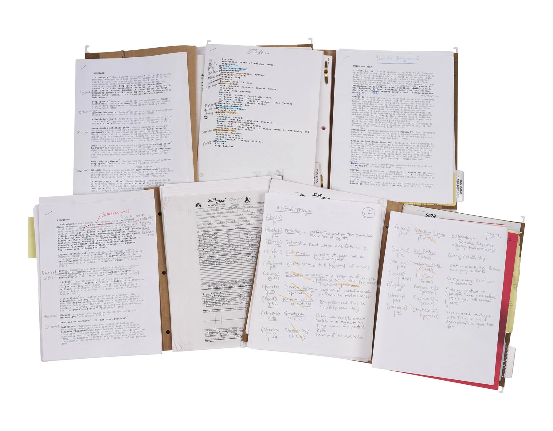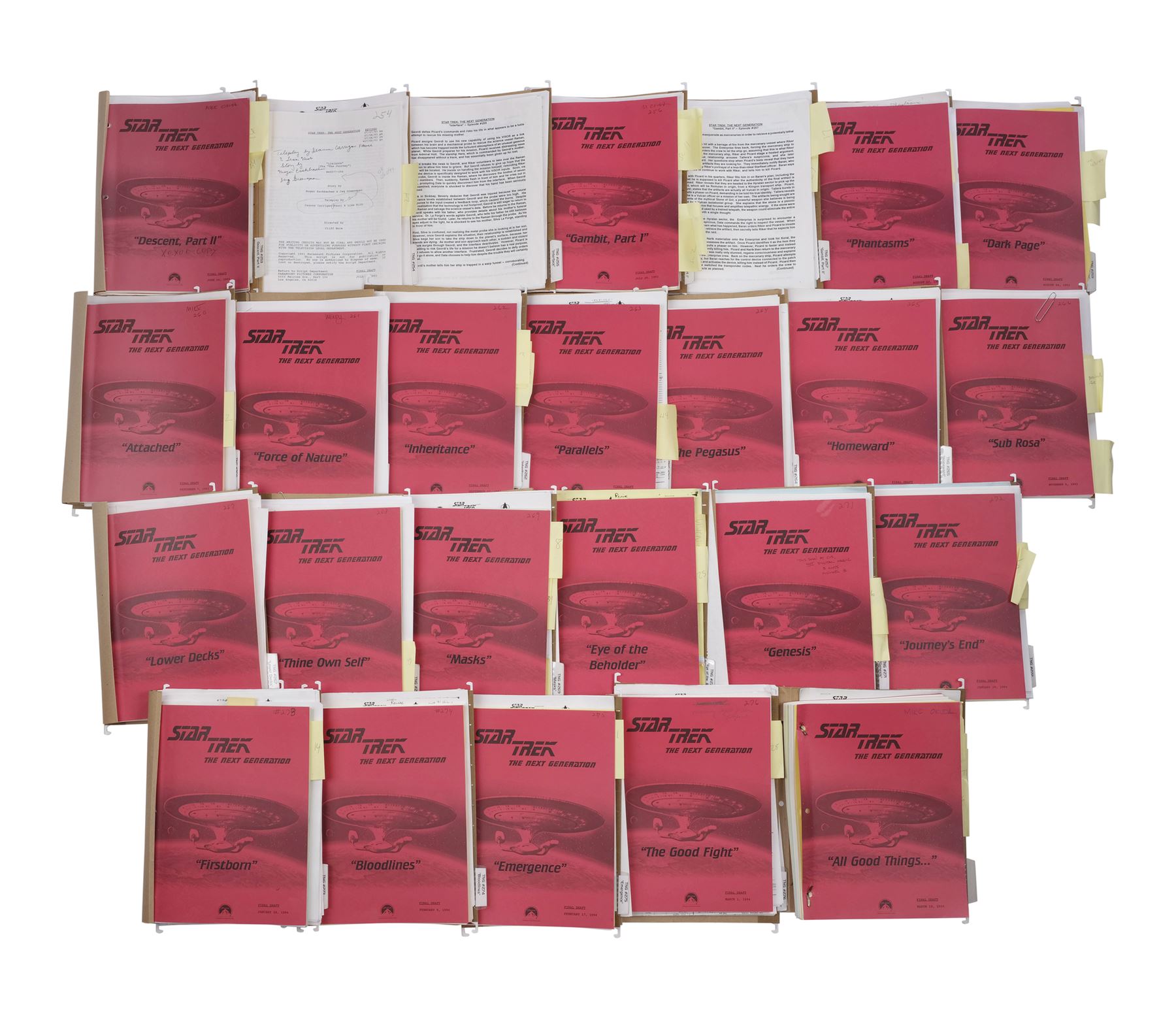 This lot comes from the collection of celebrated Star Trek franchise artists and advisors Michael and Denise Okuda. It consists of 26 scripts, one for each episode of the season, each in labeled hanging folders with hand-annotated color-coded revision pages as well as call sheets and other production ephemera. The script for the two-part finale, "All Good Things..," is both scripts combined into one. The script "The Good Fight" is for the episode that was later titled "Preemptive Strike." The paper exhibits minor wear from use and age, including edge wear. Dimensions: (grouped) 13" x 11" x 16" (33.25 cm x 28 cm x 41 cm)Though their long and celebrated careers in the Star Trek world began in features, Michael and Denise Okuda established themselves as franchise legends while working on Star Trek: The Next Generation. Michael became art supervisor on TNG, while Denise came on as a scenic artist during Deep Space Nine, roles they would continue to perform through Voyager, Enterprise, and the Next Generation films. Married in 1993, the Okudas are known as the driving forces behind the development of many of the now-iconic 24th-century technologies seen throughout the series, including the famous "Okudagrams" they created for the LCARS (Library Computer Access and Retrieval System) interfaces . Propstore is proud to present a selection of key memorabilia from the personal collection of one of the franchise's most important creative teams to the public for the first time.
