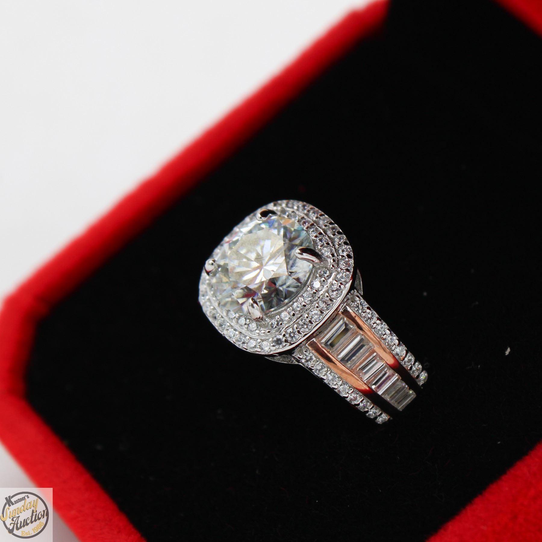 CUT MOISSANITE STONE VVS D COLOR SET IN CENTER WITH 88 ROUND BRILLIANT CUT CUBIC ZIRCONIA SET IN DUAL ROWS WITH MORE IN SHANKS WITH 12 BAGUETTE CZ’S SET IN CENTER OF SHANKS AND SET IN 925 SILVER RING SIZE 6 RETAIL VALUE $1,075.00 **ALL ITEMS MUST BE REMOVED BY 5PM SATURDAY, OCTOBER 11TH 2025. ALL REMAINING ITEMS WILL BE SUBJECT TO A $6.00 PER DAY STORAGE CHARGE. ANY ITEMS REMAINING AFTER MONDAY, NOVEMBER 3RD 2025 WILL BE CONSIDERED FORFEITED. NO REFUNDS WILL BE ISSUED FOR FORFEITED ITEMS. TO SCHEDULE A PICK UP APPOINTMENT CLICK HERE