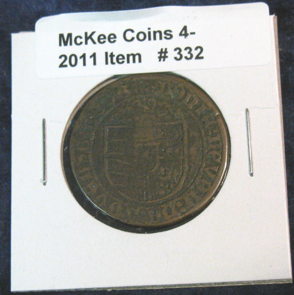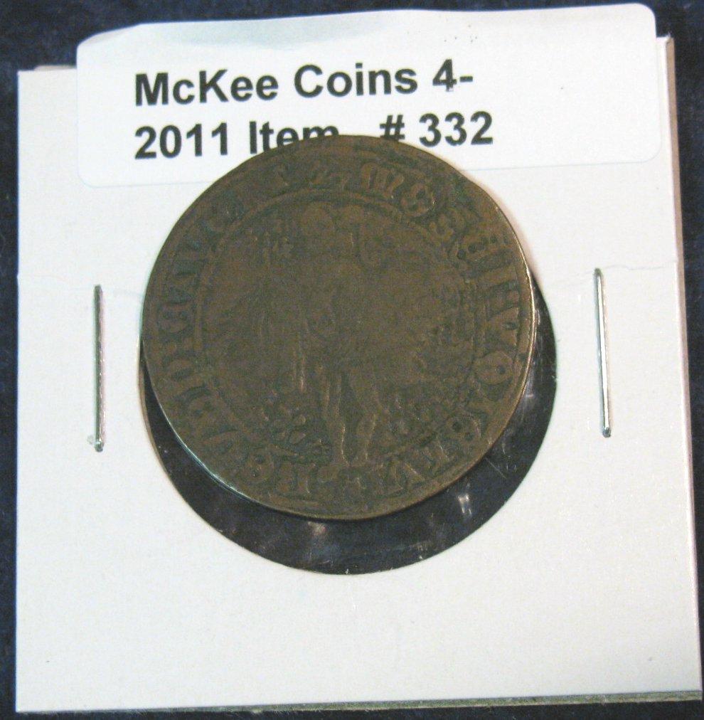 332. Early Hammered Copper with standing figure and shield. Probably German. Half-dollar size.