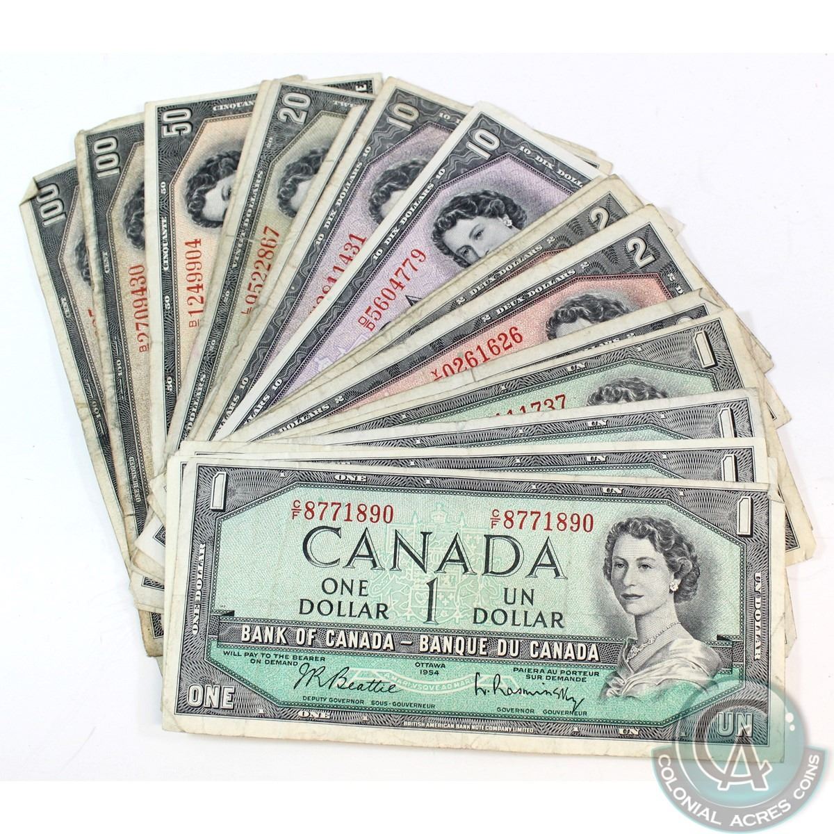 $333.00 Face Value in 1954 Modified Portrait Series Banknotes. There are 17 pieces consisting of 5 x $1, 4 x $2, 3 x $10, 2 x $20, 1 x $50 and 2 x $100. 17pcs