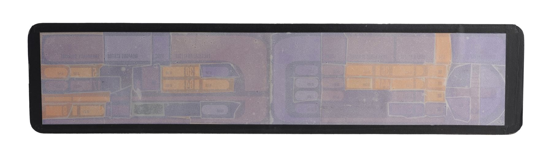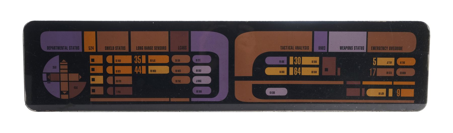 This panel, from the collection of celebrated Star Trek franchise artists and advisors Michael and Denise Okuda, is made of black acrylic with purple, red, orange, and yellow simulated touchscreen buttons featuring labels such as "Departmental Status," "Shield Status," "Long Range Sensors," and "LCARS." The acrylic exhibits scratching throughout from use and age. Dimensions: 28" x 6.5" x 0.5" (71.25 cm x 16.75 cm x 1.5 cm)Though their long and celebrated careers in the Star Trek world began in features, Michael and Denise Okuda established themselves as franchise legends while working on Star Trek: The Next Generation. Michael became art supervisor on TNG, while Denise came on as a scenic artist during Deep Space Nine, roles they would continue to perform through Voyager, Enterprise, and the Next Generation films. Married in 1993, the Okudas are known as the driving forces behind the development of many of the now-iconic 24th-century technologies seen throughout the series, including the famous "Okudagrams" they created for the LCARS (Library Computer Access and Retrieval System) interfaces . Propstore is proud to present a selection of key memorabilia from the personal collection of one of the franchise's most important creative teams to the public for the first time.