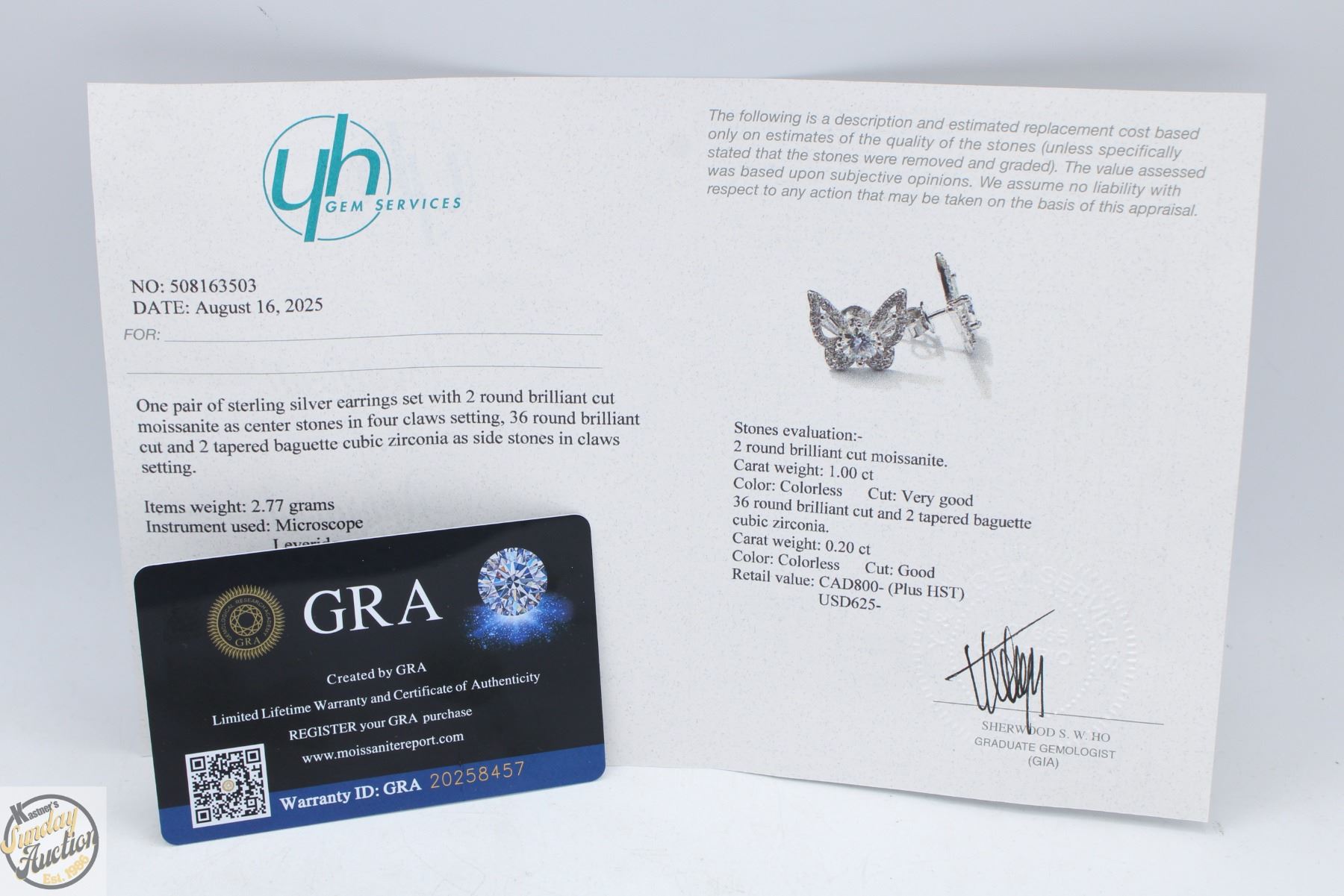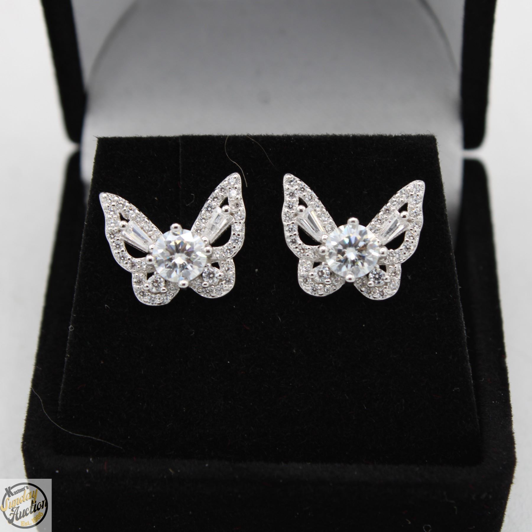 CUT MOISSANITE STONES VVS D COLOR SET IN BUTTERFLY SHAPE WITH 36 ROUND BRILLIANT CUT CUBIC ZIRCONIA SET IN 925 SILVER EARRINGS RETAIL VALUE $800.00 **ALL ITEMS MUST BE REMOVED BY 5PM SATURDAY, OCTOBER 11TH 2025. ALL REMAINING ITEMS WILL BE SUBJECT TO A $6.00 PER DAY STORAGE CHARGE. ANY ITEMS REMAINING AFTER MONDAY, NOVEMBER 3RD 2025 WILL BE CONSIDERED FORFEITED. NO REFUNDS WILL BE ISSUED FOR FORFEITED ITEMS. TO SCHEDULE A PICK UP APPOINTMENT CLICK HERE
