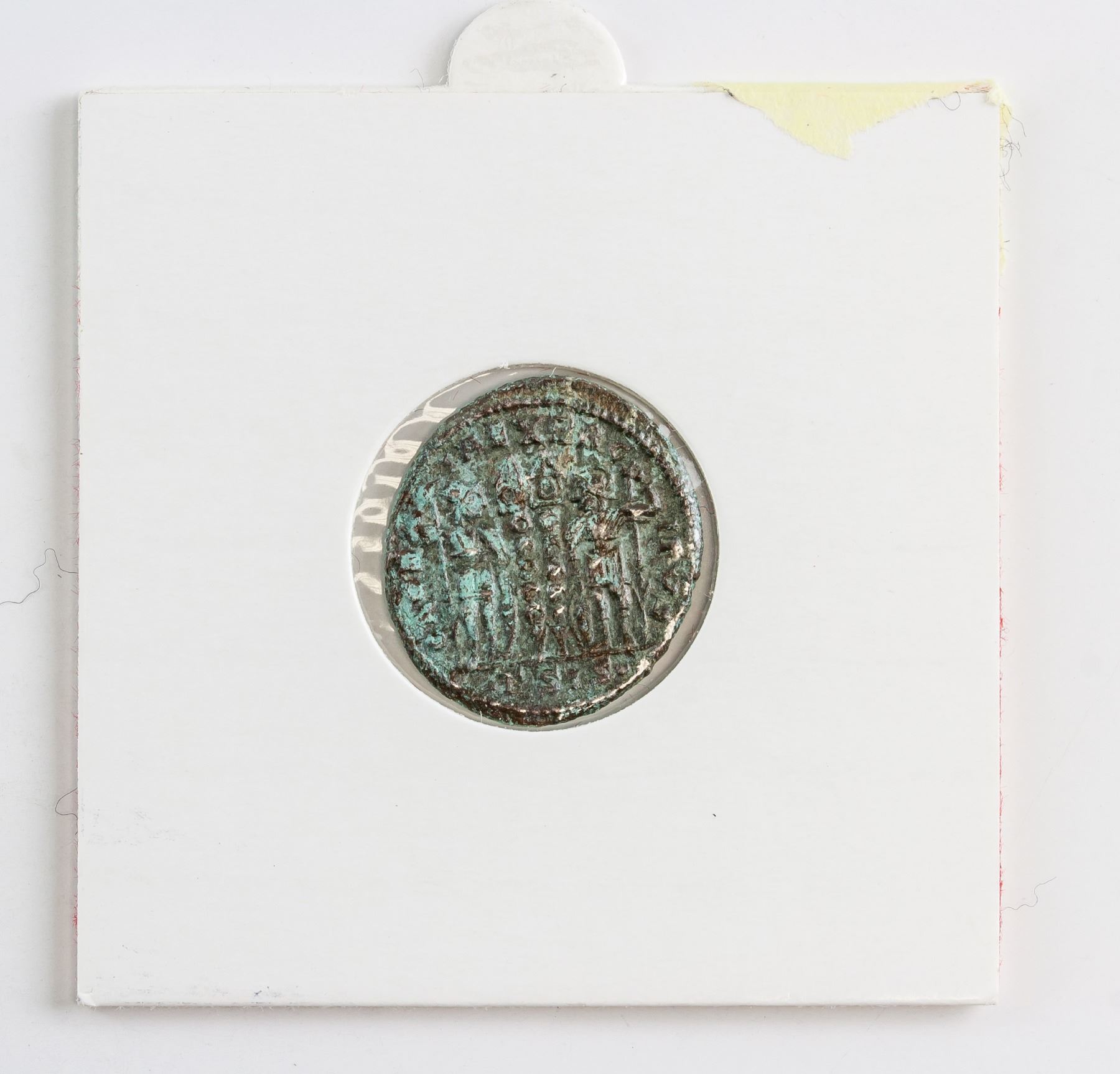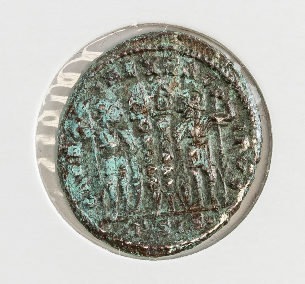 334 AD Ancient Rome Constantius II bronze coin, Siscia mint, obverse engraved bust of Canstantius II (Caesar), reverse leetering GLORIA EXERCITVS (the glory of the army), RC-17689, D: 17.39 mm
