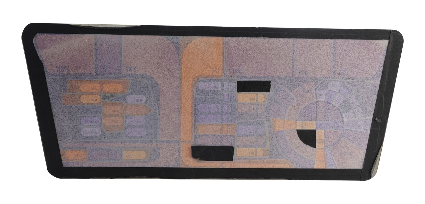This panel, from the collection of celebrated Star Trek franchise artists and advisors Michael and Denise Okuda, is made of black acrylic with purple, red, orange, and yellow simulated touchscreen buttons labeled with small letters and numbers. The acrylic exhibits scratching and some of the tape on the back is peeling. Dimensions: 25" x 10.5" x 0.5" (63.5 cm x 26.75 cm x 1.5 cm)Though their long and celebrated careers in the Star Trek world began in features, Michael and Denise Okuda established themselves as franchise legends while working on Star Trek: The Next Generation. Michael became art supervisor on TNG, while Denise came on as a scenic artist during Deep Space Nine, roles they would continue to perform through Voyager, Enterprise, and the Next Generation films. Married in 1993, the Okudas are known as the driving forces behind the development of many of the now-iconic 24th-century technologies seen throughout the series, including the famous "Okudagrams" they created for the LCARS (Library Computer Access and Retrieval System) interfaces . Propstore is proud to present a selection of key memorabilia from the personal collection of one of the franchise's most important creative teams to the public for the first time.