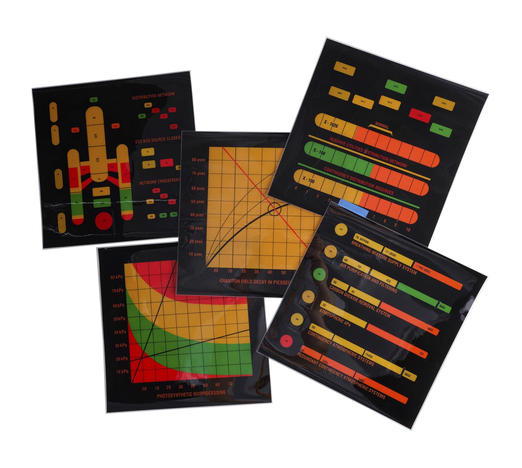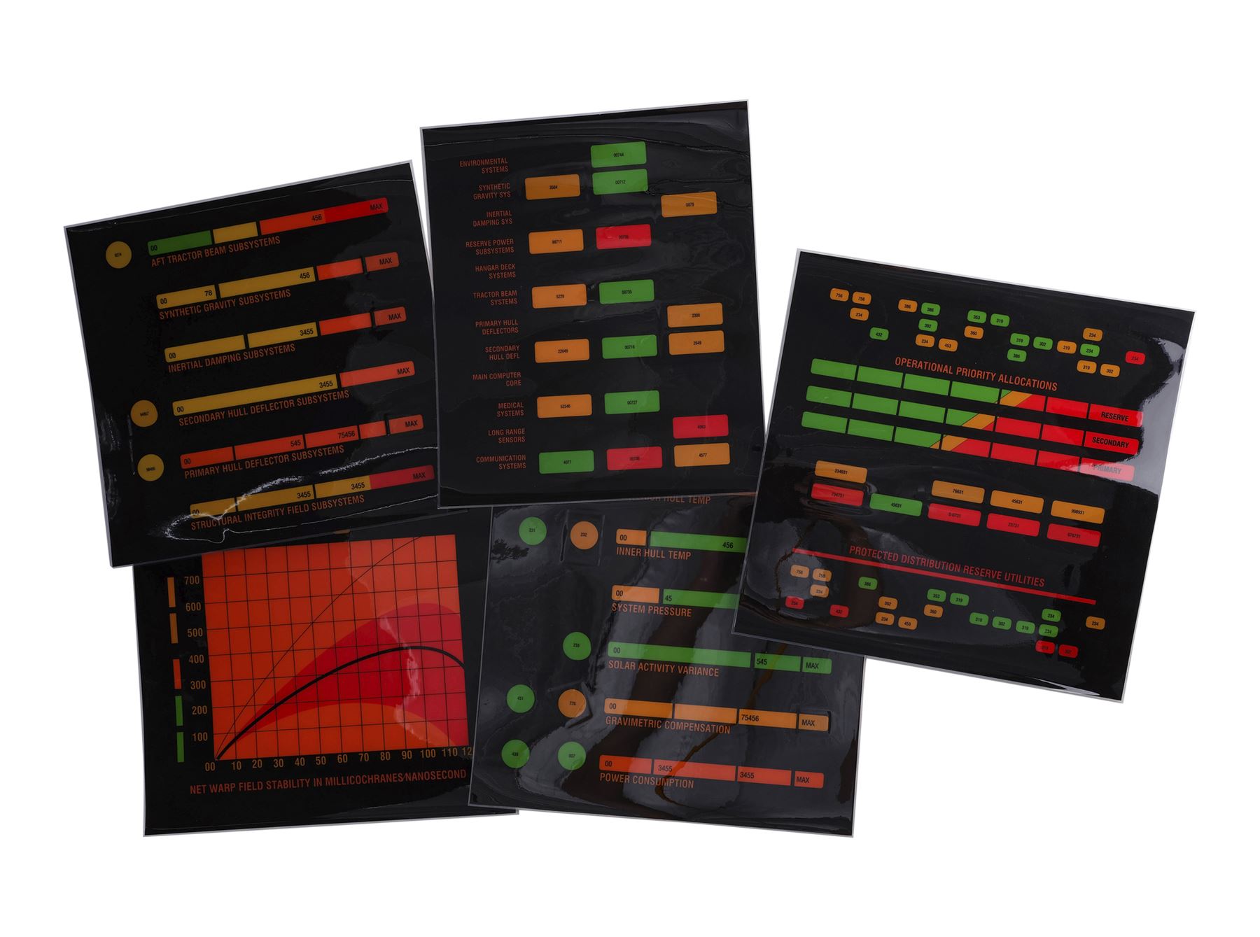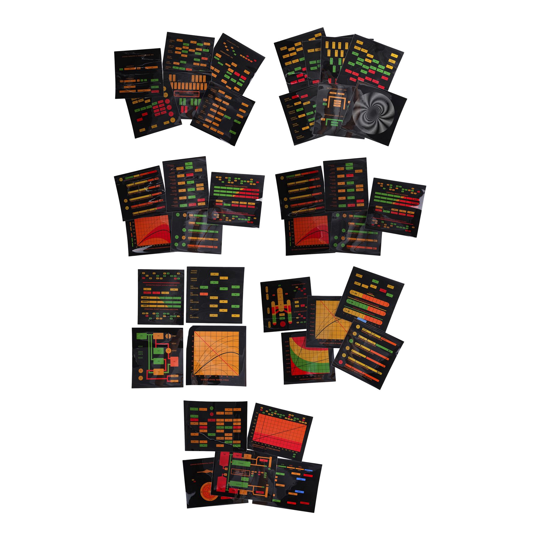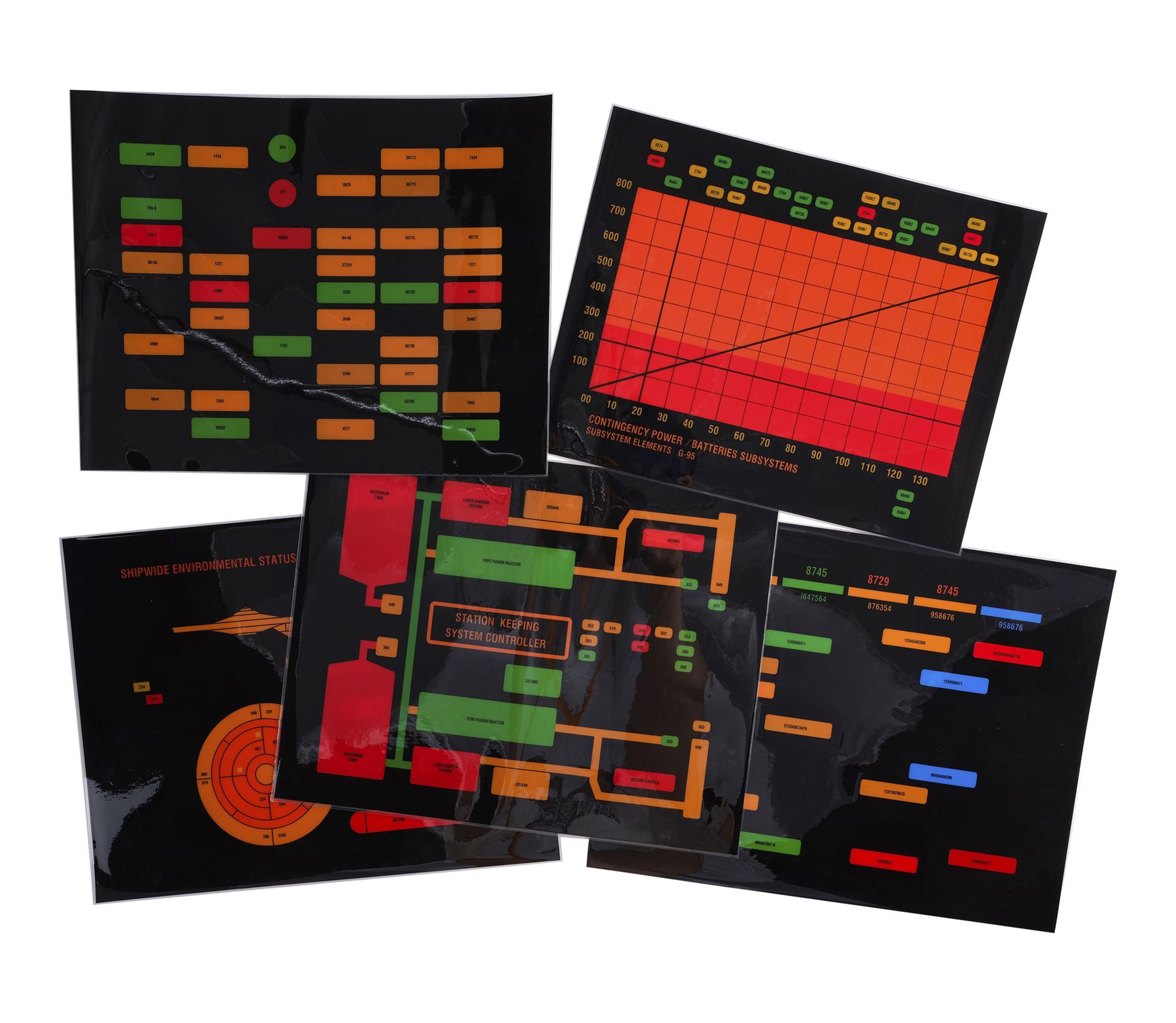 This lot comes from the collection of celebrated Star Trek franchise artists and advisors Michael and Denise Okuda. It consists of 32 black plastic transparency sheets with red, yellow, orange, and green graphics depicting the information that would appear on console panels throughout the starship, including labeled graphs and a "Shipwide Environmental Status" with top and side diagrams of the starship. They were designed to be backlit on set, with the colorful graphics appearing to glow on the ship's consoles. As these are backups, they exhibit only minor signs of wear, including light scratching. Dimensions: (largest) 14" x 11.5" (35.75 cm x 29.25 cm)Though their long and celebrated careers in the Star Trek world began in features, Michael and Denise Okuda established themselves as franchise legends while working on Star Trek: The Next Generation. Michael became art supervisor on TNG, while Denise came on as a scenic artist during Deep Space Nine, roles they would continue to perform through Voyager, Enterprise, and the Next Generation films. Married in 1993, the Okudas are known as the driving forces behind the development of many of the now-iconic 24th-century technologies seen throughout the series, including the famous "Okudagrams" they created for the LCARS (Library Computer Access and Retrieval System) interfaces . Propstore is proud to present a selection of key memorabilia from the personal collection of one of the franchise's most important creative teams to the public for the first time.