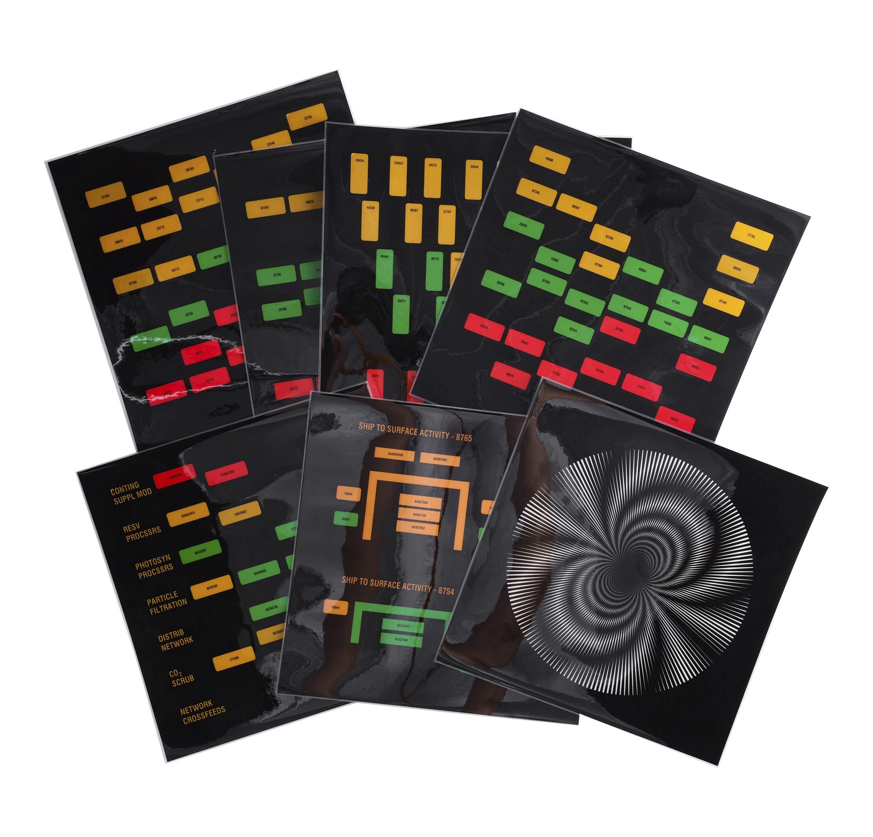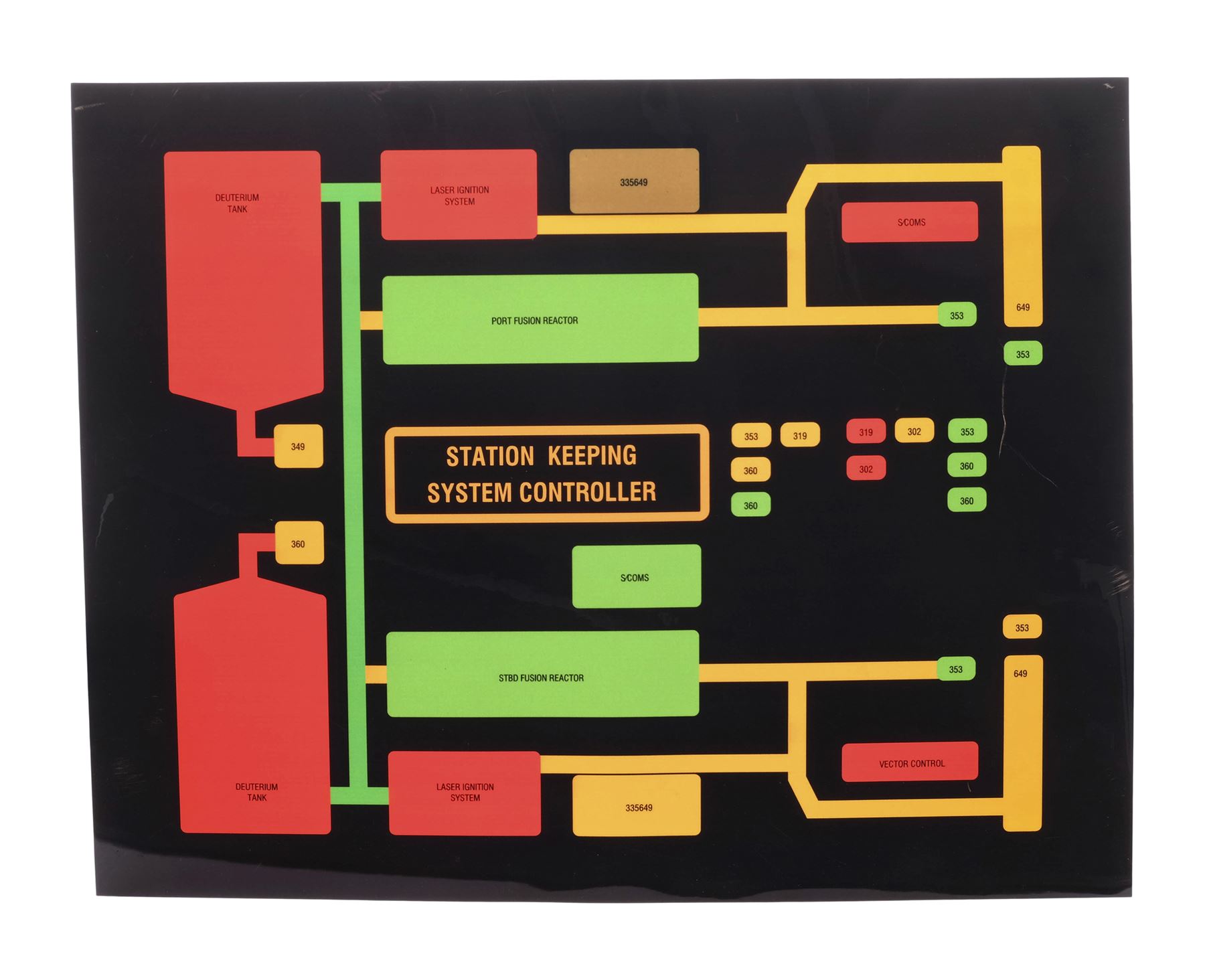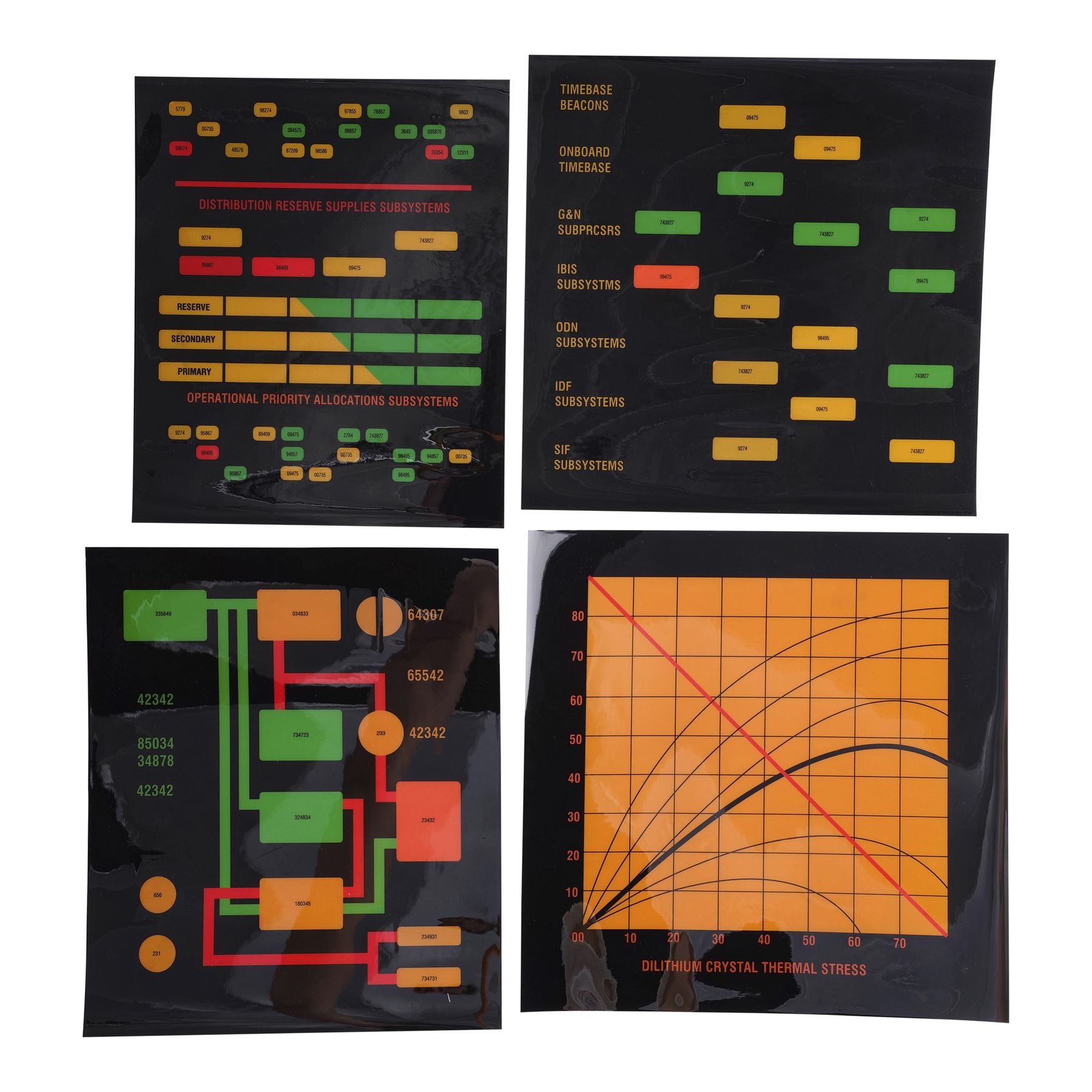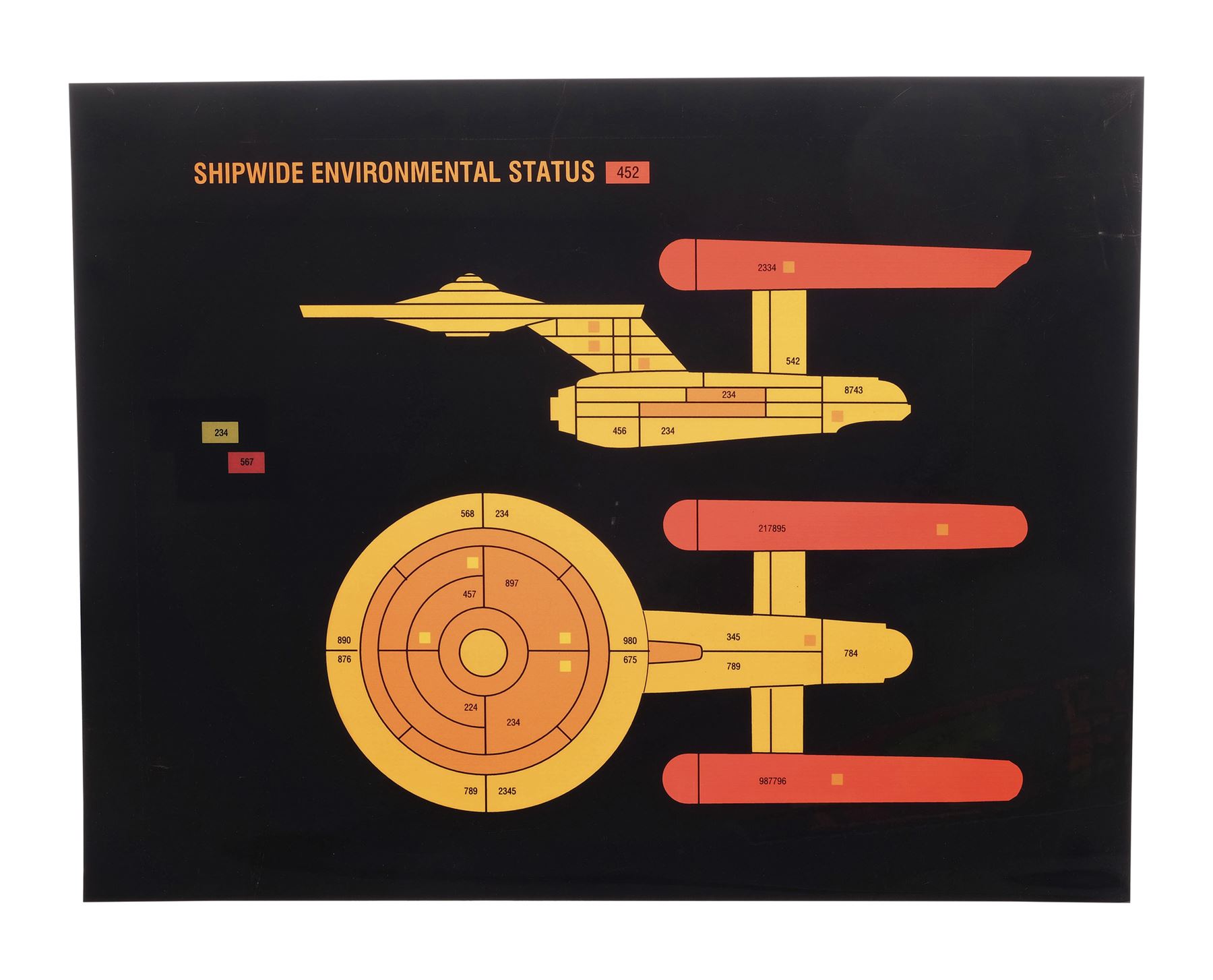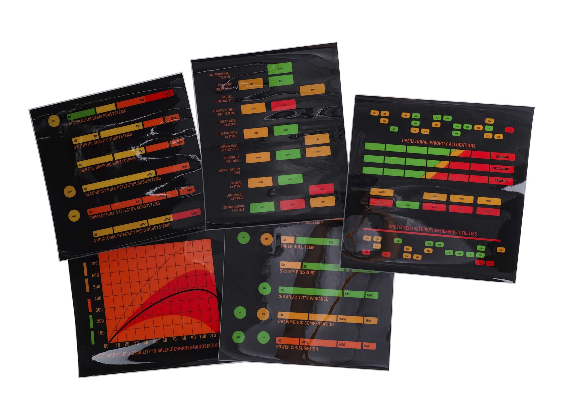 This lot comes from the collection of celebrated Star Trek franchise artists and advisors Michael and Denise Okuda. It consists of 32 black plastic transparency sheets with red, yellow, orange, and green graphics depicting the information that would appear on console panels throughout the starship, including labeled graphs and a "Shipwide Environmental Status" with top and side diagrams of the starship. They were designed to be backlit on set, with the colorful graphics appearing to glow on the ship's consoles. As these are backups, they exhibit only minor signs of wear, including light scratching. Dimensions: (largest) 14" x 11.5" (35.75 cm x 29.25 cm)Though their long and celebrated careers in the Star Trek world began in features, Michael and Denise Okuda established themselves as franchise legends while working on Star Trek: The Next Generation. Michael became art supervisor on TNG, while Denise came on as a scenic artist during Deep Space Nine, roles they would continue to perform through Voyager, Enterprise, and the Next Generation films. Married in 1993, the Okudas are known as the driving forces behind the development of many of the now-iconic 24th-century technologies seen throughout the series, including the famous "Okudagrams" they created for the LCARS (Library Computer Access and Retrieval System) interfaces . Propstore is proud to present a selection of key memorabilia from the personal collection of one of the franchise's most important creative teams to the public for the first time.