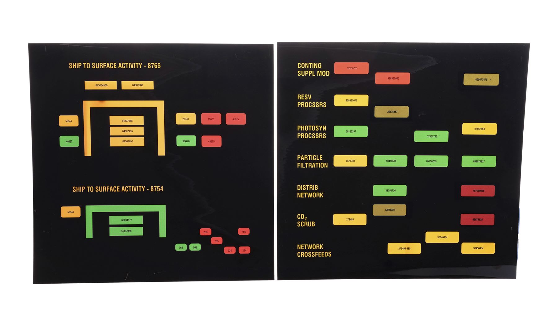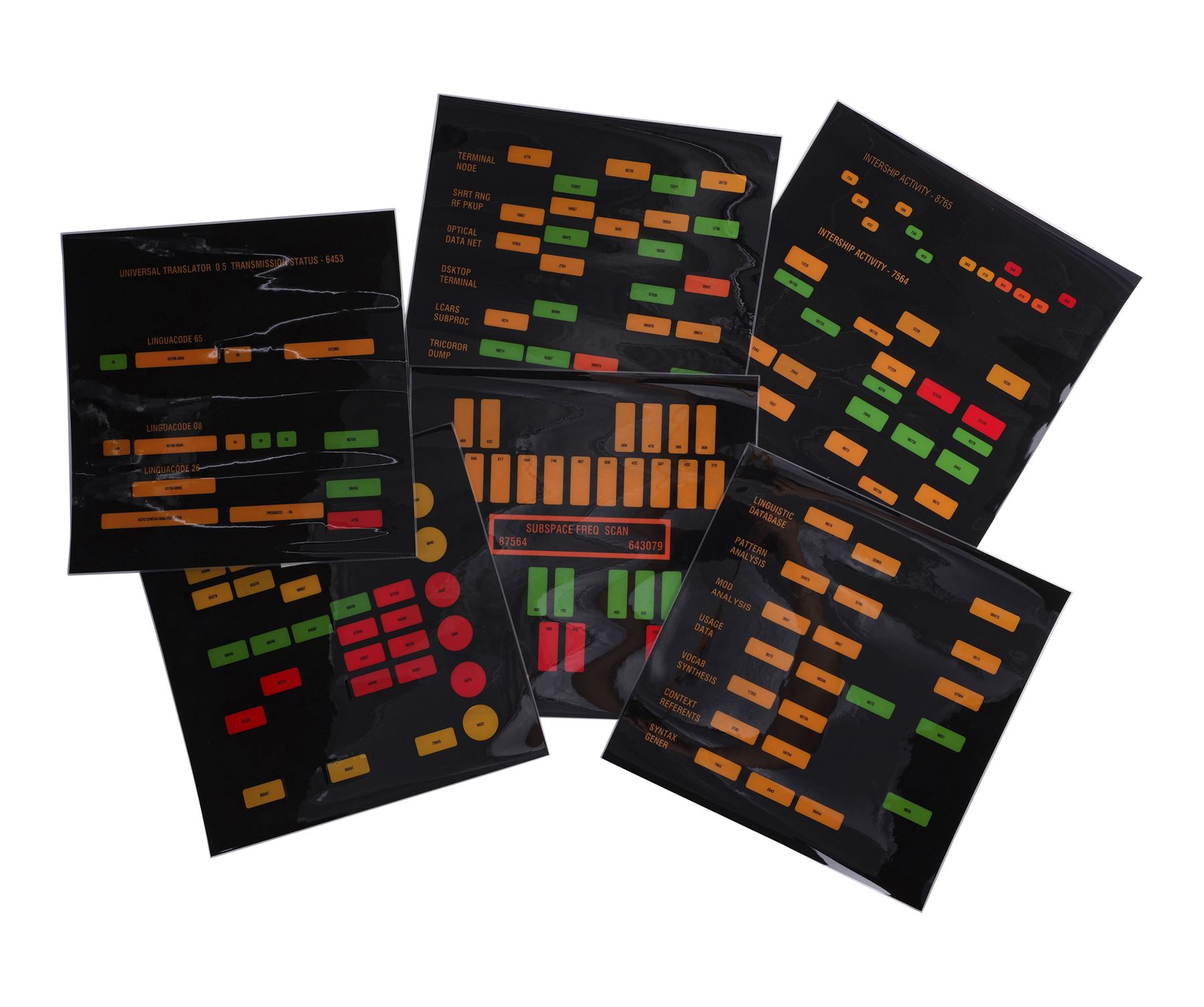 STAR TREK: ENTERPRISE (T.V. SERIES, 2005) - Michael and Denise Okuda Collection: Set of 32 Constitution-Class Console Panel Backups - A set of 32 Constitution-class console panel backups from the television series Star Trek: Enterprise. In the Season 4 two-parter, "In a Mirror, Darkly," the mirror universe Jonathan Archer (Scott Bakula) and his crew discovered the Constitution-class USS Defiant, which had been transported both from the prime universe and from the century ahead, and featured 23rd century graphics on its consoles.