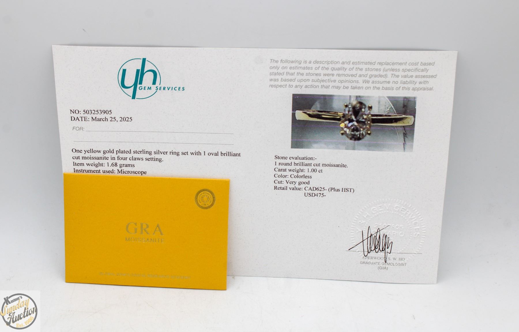 STONE VVS D COLOR SET IN 4 CLAW BASKET HEAD AND SET IN 925 SILVER RING THAT IS YELLOW GOLD PLATED IN SIZE 9 RETAIL VALUE $625.00 **ALL ITEMS MUST BE REMOVED BY 5PM SATURDAY, NOVEMBER 29TH 2025. ALL REMAINING ITEMS WILL BE SUBJECT TO A $6.00 PER DAY STORAGE CHARGE. ANY ITEMS REMAINING AFTER MONDAY, DECEMBER 15TH 2025 WILL BE CONSIDERED FORFEITED. NO REFUNDS WILL BE ISSUED FOR FORFEITED ITEMS. TO SCHEDULE A PICK UP APPOINTMENT CLICK HERE