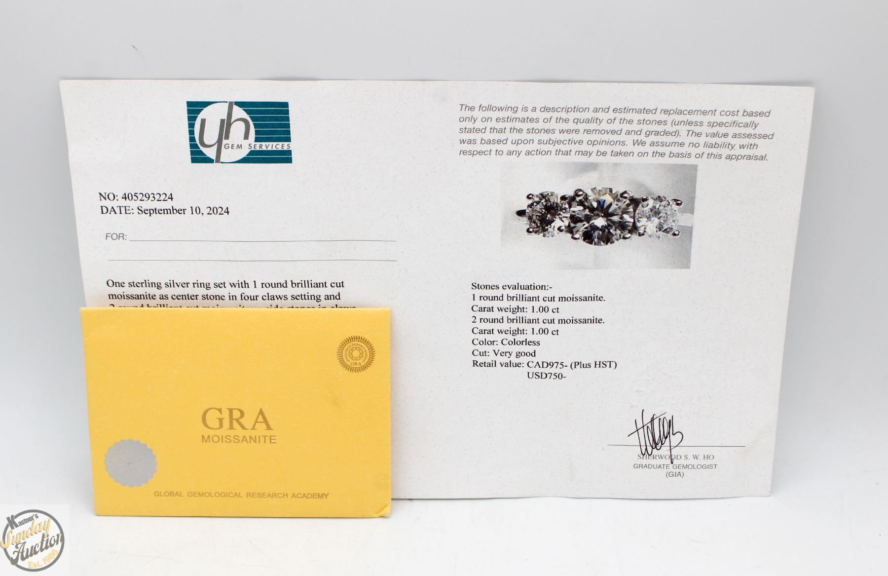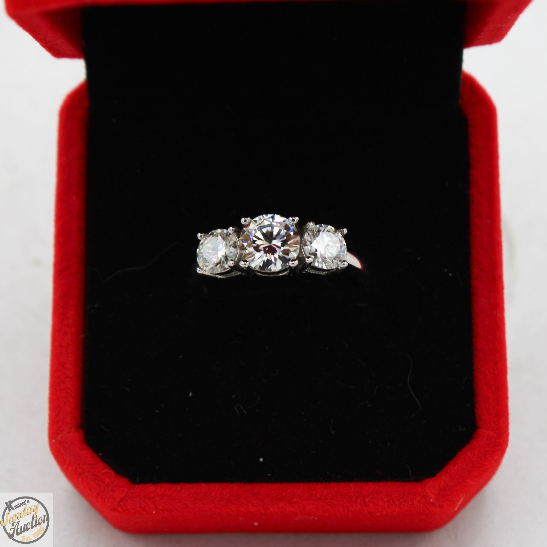 MOISSANITE STONES VVS D COLOR WITH 1.00 CT SET IN CENTER WITH 0.50 CARAT SET ON EITHER SIDE AND SET IN 925 SILVER RING SIZE 8 RETAIL VALUE $975.00 **ALL ITEMS MUST BE REMOVED BY 5PM SATURDAY, NOVEMBER 29TH 2025. ALL REMAINING ITEMS WILL BE SUBJECT TO A $6.00 PER DAY STORAGE CHARGE. ANY ITEMS REMAINING AFTER MONDAY, DECEMBER 15TH 2025 WILL BE CONSIDERED FORFEITED. NO REFUNDS WILL BE ISSUED FOR FORFEITED ITEMS. TO SCHEDULE A PICK UP APPOINTMENT CLICK HERE
