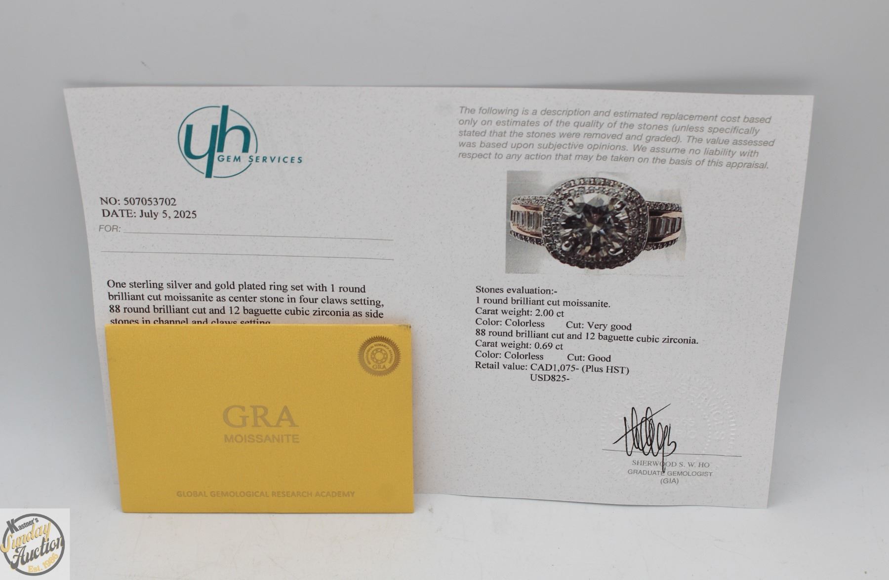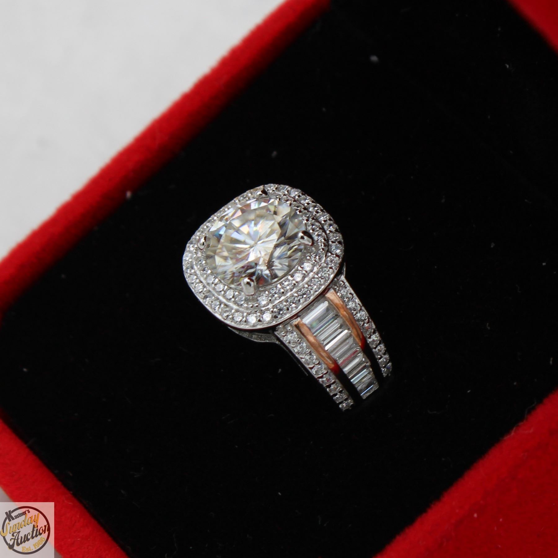 MOISSANITE STONES VVS D COLOR WITH 12 BAGUETTE CUBIC ZIRCONIA AND 88 ROUND BRILLIANT CUT CUBIC ZIRCONIA SET IN DUAL ROUND HALO AND IN SHANKS SET IN 925 SILVER RING SIZE 6 RETAIL VALUE $1,075.00 **ALL ITEMS MUST BE REMOVED BY 5PM SATURDAY, NOVEMBER 29TH 2025. ALL REMAINING ITEMS WILL BE SUBJECT TO A $6.00 PER DAY STORAGE CHARGE. ANY ITEMS REMAINING AFTER MONDAY, DECEMBER 15TH 2025 WILL BE CONSIDERED FORFEITED. NO REFUNDS WILL BE ISSUED FOR FORFEITED ITEMS. TO SCHEDULE A PICK UP APPOINTMENT CLICK HERE