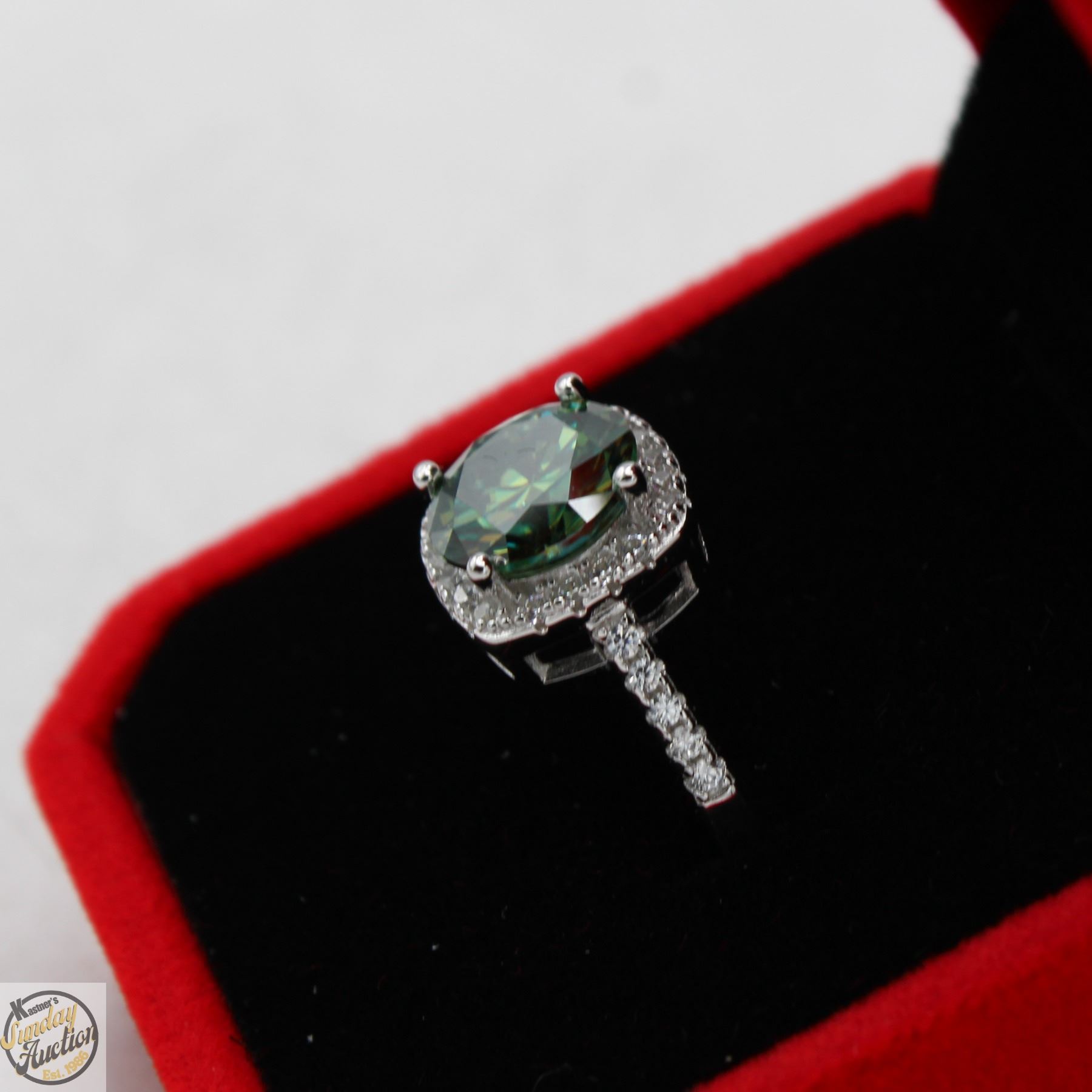 MOISSANITE STONE VVS BLUISH GREEN COLOR WITH 30 ROUND BRILLIANT CUT CUBIC ZIRCONIA SET IN SQUARE HALO AND IN SHANKS SET IN 925 SILVER RING SIZE 7 RETAIL VALUE $1,225.00 **ALL ITEMS MUST BE REMOVED BY 5PM SATURDAY, NOVEMBER 29TH 2025. ALL REMAINING ITEMS WILL BE SUBJECT TO A $6.00 PER DAY STORAGE CHARGE. ANY ITEMS REMAINING AFTER MONDAY, DECEMBER 15TH 2025 WILL BE CONSIDERED FORFEITED. NO REFUNDS WILL BE ISSUED FOR FORFEITED ITEMS. TO SCHEDULE A PICK UP APPOINTMENT CLICK HERE