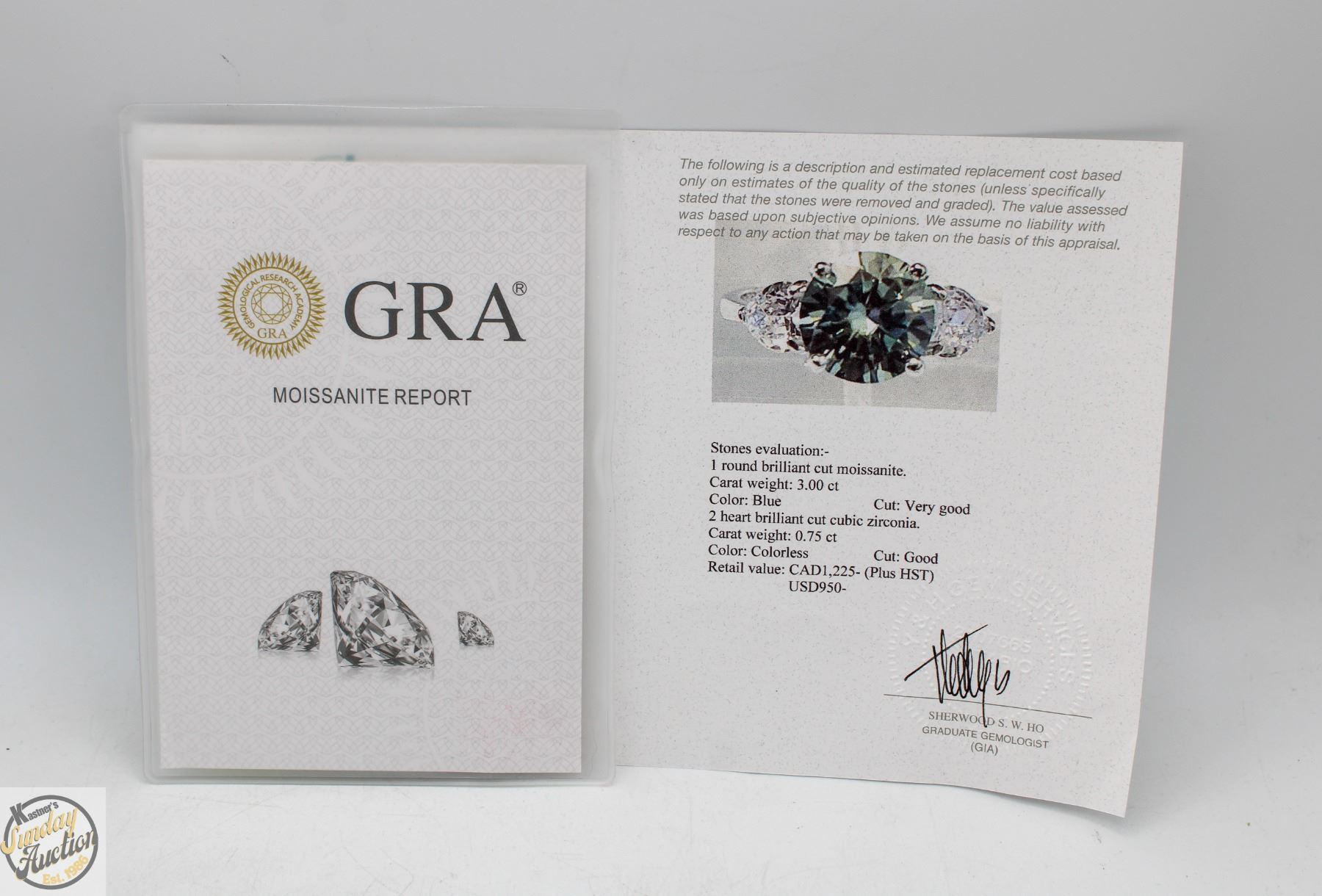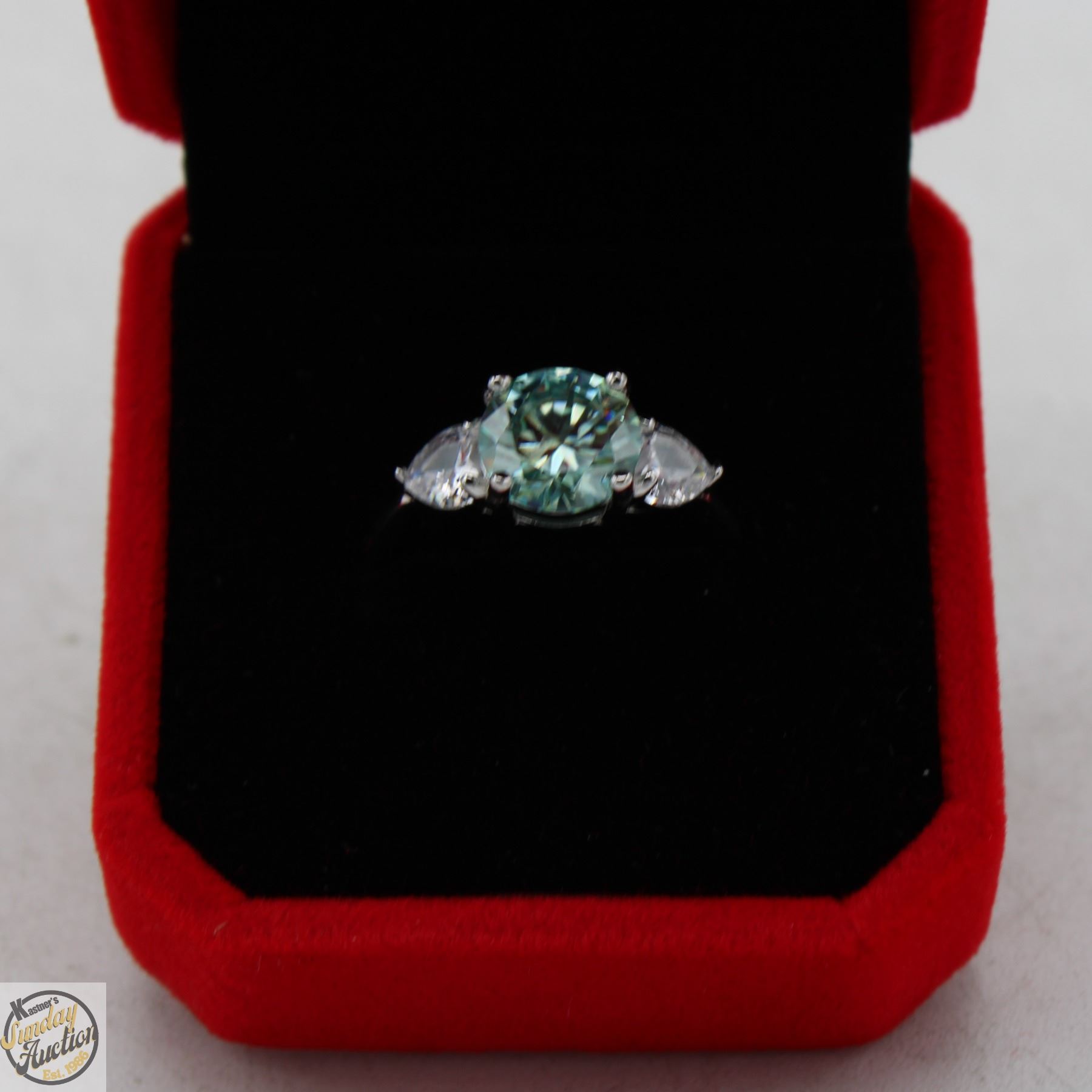 MOISSANITE STONE VVS BLUE COLOR WITH A HEART BRILLIANT CUT CUBIC ZIRCONIA SET ON EITHER SIDE SET IN 925 SILVER RING SIZE 8 RETAIL VALUE $1,225.00 **ALL ITEMS MUST BE REMOVED BY 5PM SATURDAY, NOVEMBER 29TH 2025. ALL REMAINING ITEMS WILL BE SUBJECT TO A $6.00 PER DAY STORAGE CHARGE. ANY ITEMS REMAINING AFTER MONDAY, DECEMBER 15TH 2025 WILL BE CONSIDERED FORFEITED. NO REFUNDS WILL BE ISSUED FOR FORFEITED ITEMS. TO SCHEDULE A PICK UP APPOINTMENT CLICK HERE
