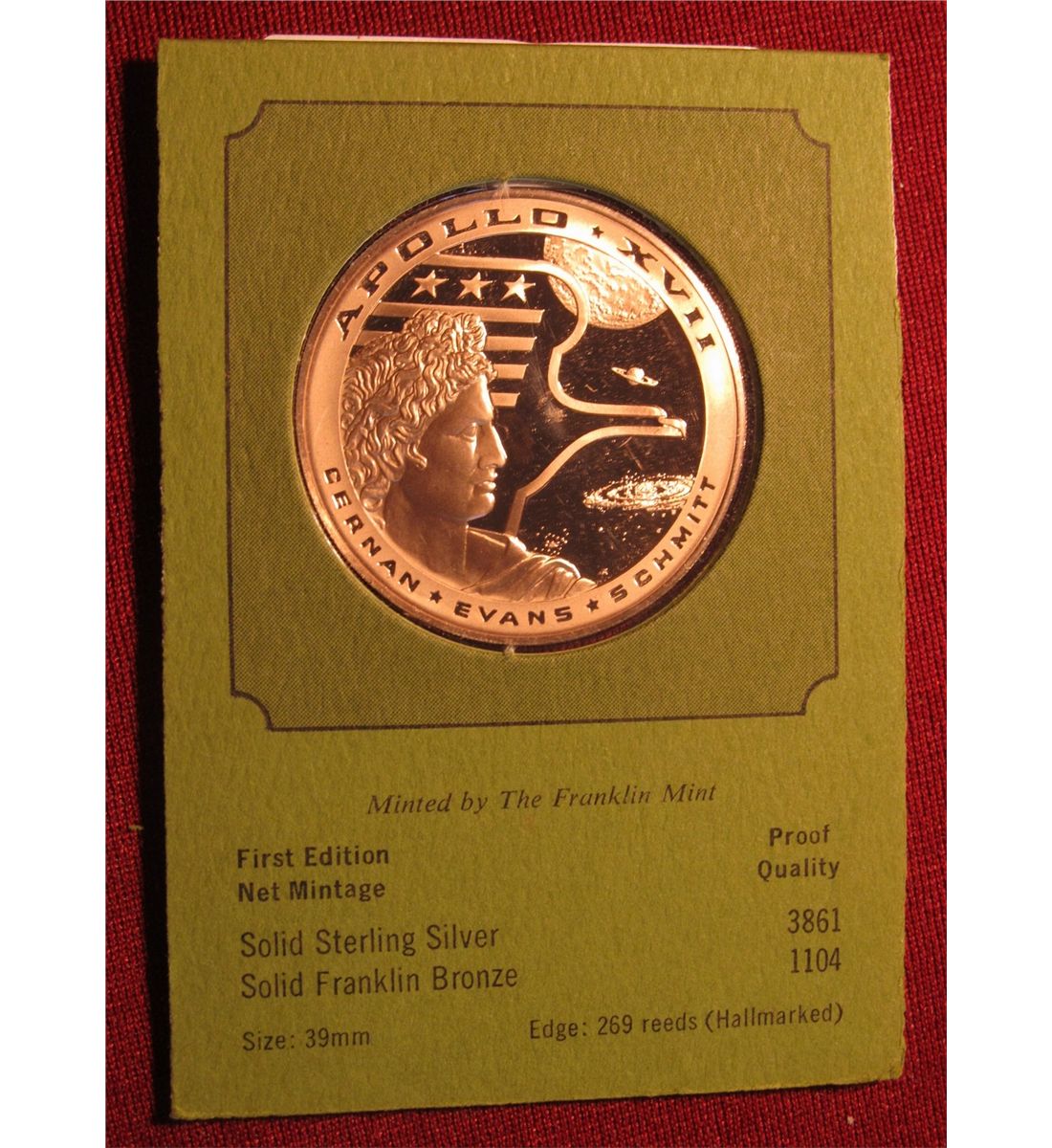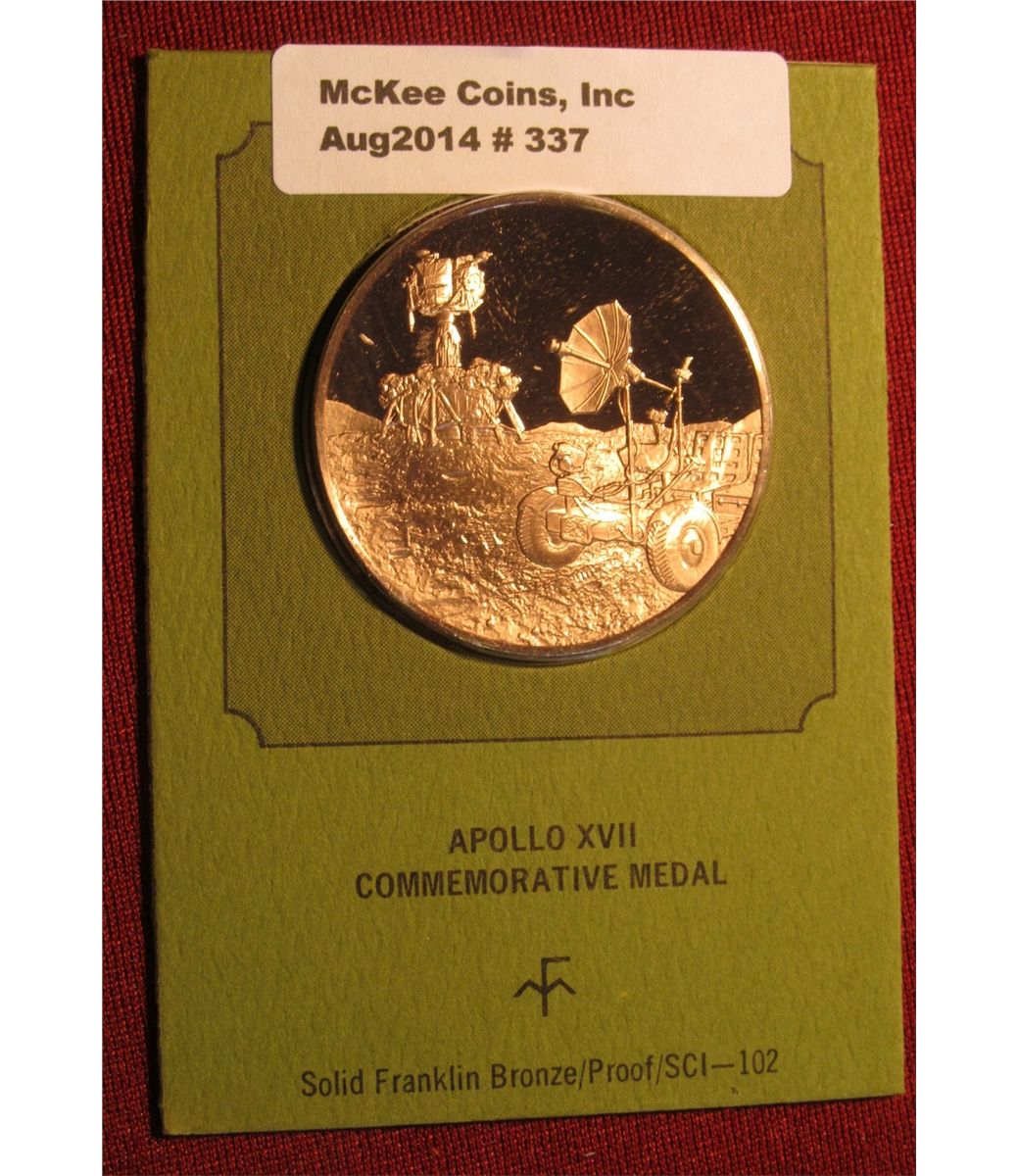 337. "Apollo XVII Commemorative" Proof Bronze Medal. 1 1/2" diameter. In original holder as issued by the Franklin Mint. Only 1,104 ever minted. Very rare.