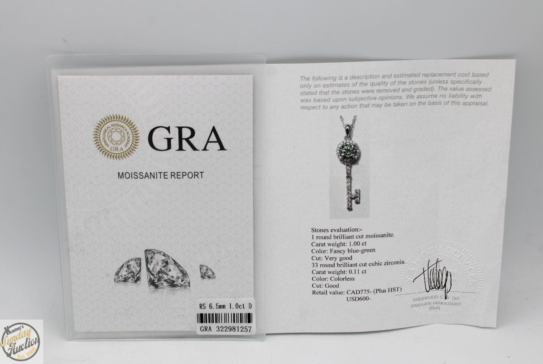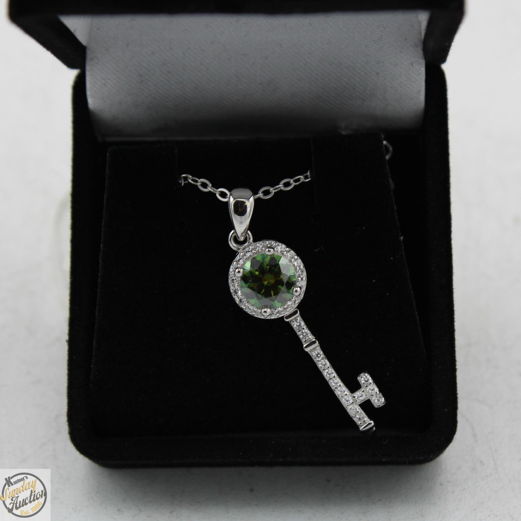 MOISSANITE STONE VVS FANCY BLUE-GREEN COLOR SET WITH 33 ROUND BRILLIANT CUT CUBIC ZIRCONIA SET IN ROUND HALO AND IN KEY SHAPE SET IN 925 SILVER PENDANT RETAIL VALUE $775.00 **ALL ITEMS MUST BE REMOVED BY 5PM SATURDAY, NOVEMBER 29TH 2025. ALL REMAINING ITEMS WILL BE SUBJECT TO A $6.00 PER DAY STORAGE CHARGE. ANY ITEMS REMAINING AFTER MONDAY, DECEMBER 15TH 2025 WILL BE CONSIDERED FORFEITED. NO REFUNDS WILL BE ISSUED FOR FORFEITED ITEMS. TO SCHEDULE A PICK UP APPOINTMENT CLICK HERE