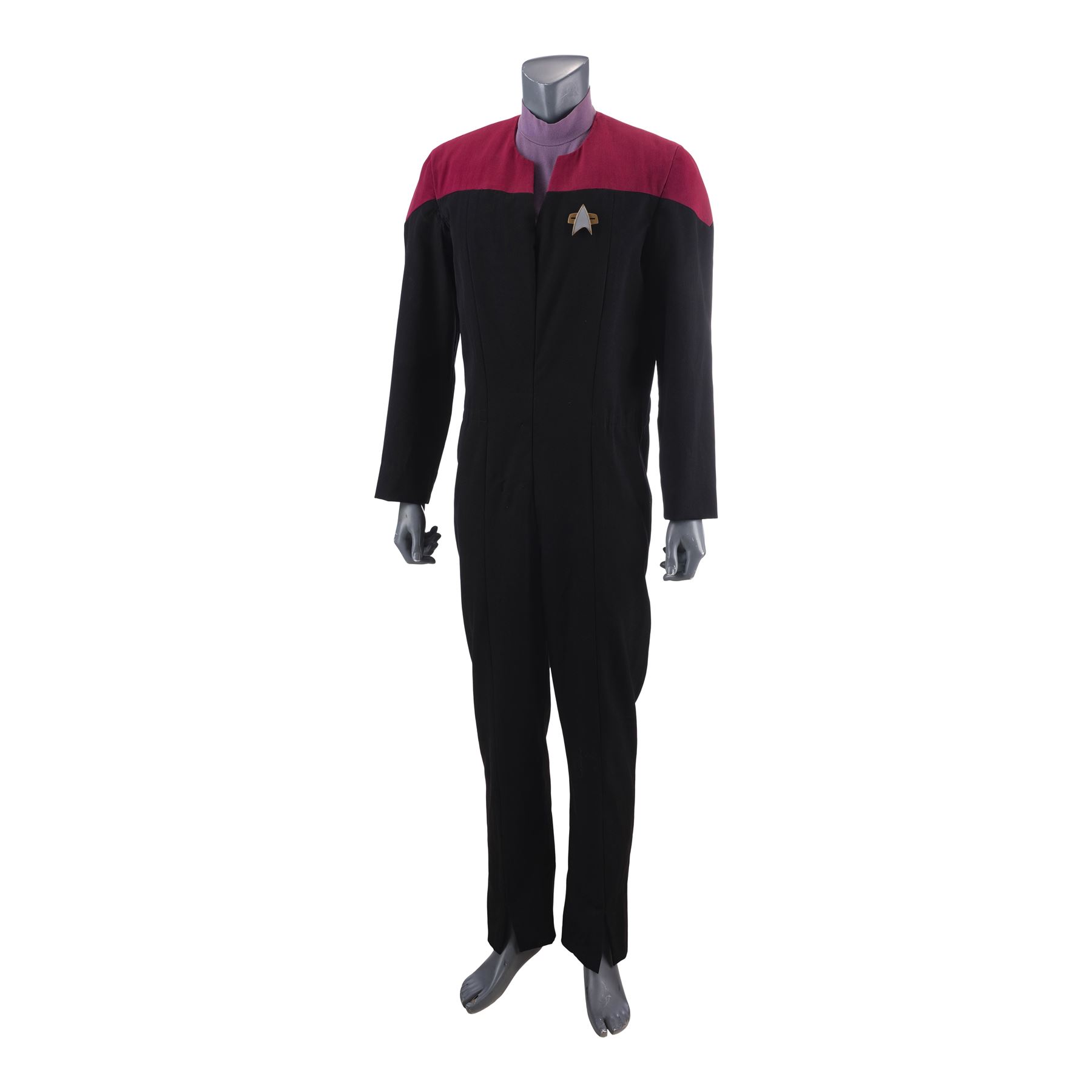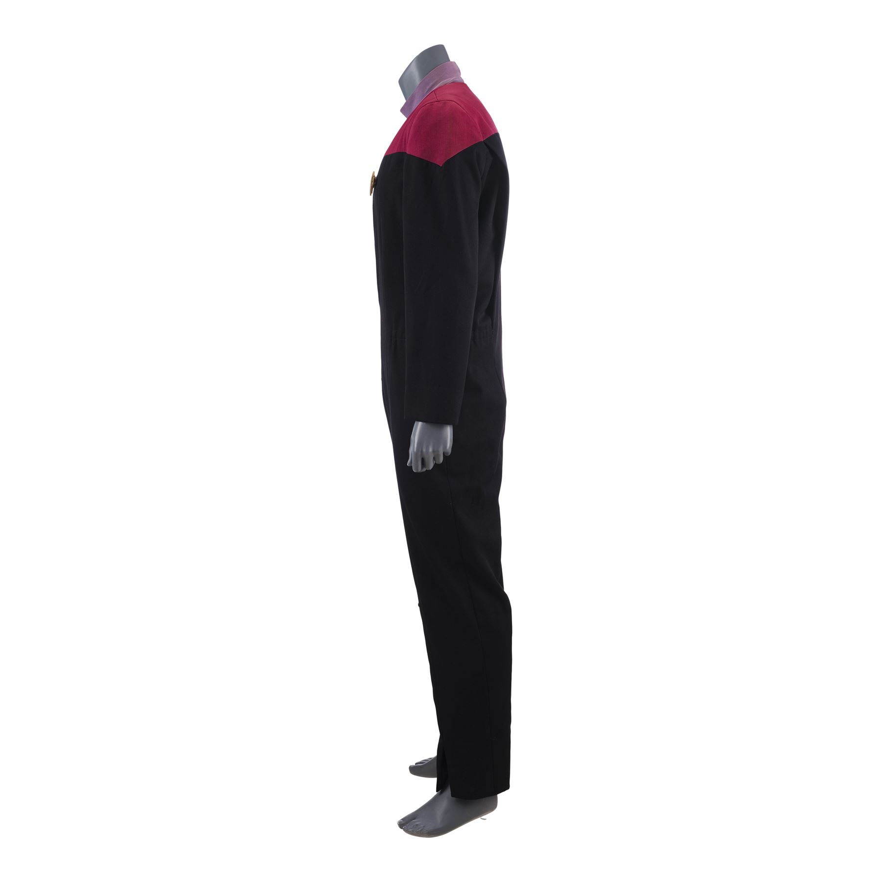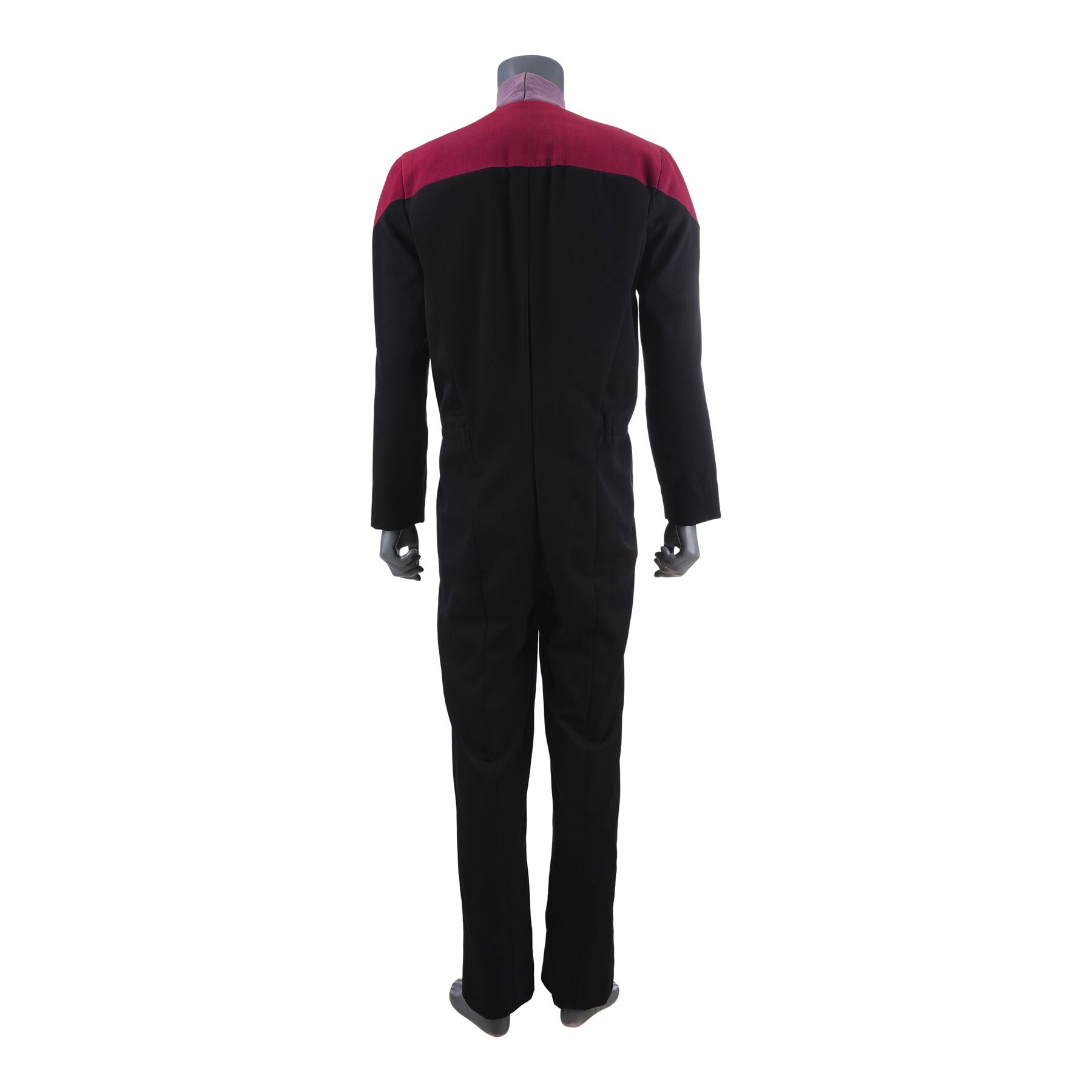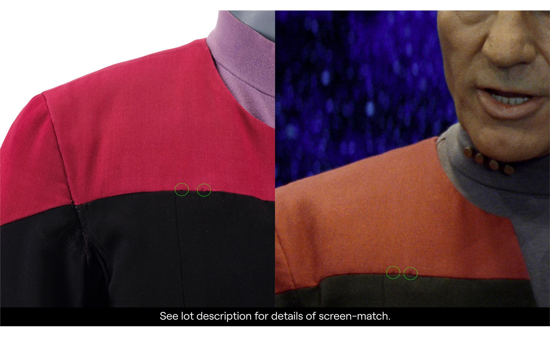 STAR TREK: GENERATIONS (1994) - Captain Jean-Luc Picard's (Patrick Stewart) Screen-Matched Starfleet Command Costume - Captain Jean-Luc Picard's (Patrick Stewart) screen-matched Starfleet command costume from David Carson's Star Trek Generations. Picard changed into his updated red-shouldered uniform before meeting with Guinan (Whoopi Goldberg) about Tolian Soran (Malcolm McDowell) and continued to wear it throughout the film. A small deformation where the yoke meets the body of the jumpsuit screen-matches this particular costume to the scene with Picard in Stellar Cartography with Data (Brent Spiner).