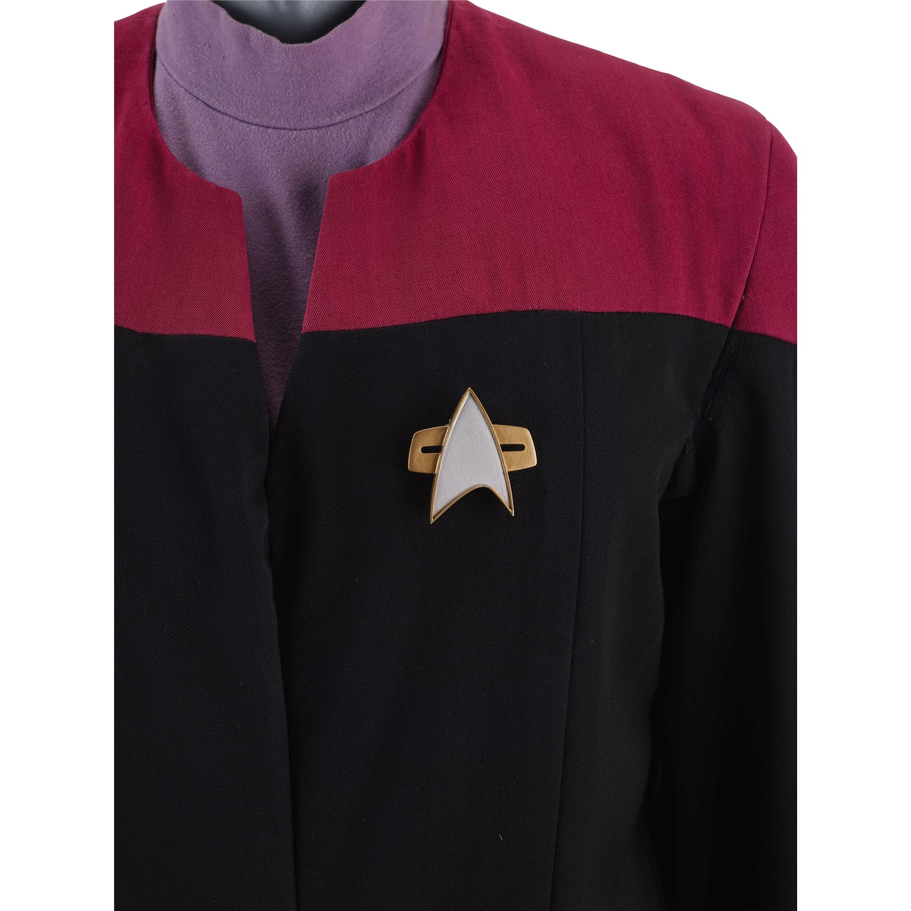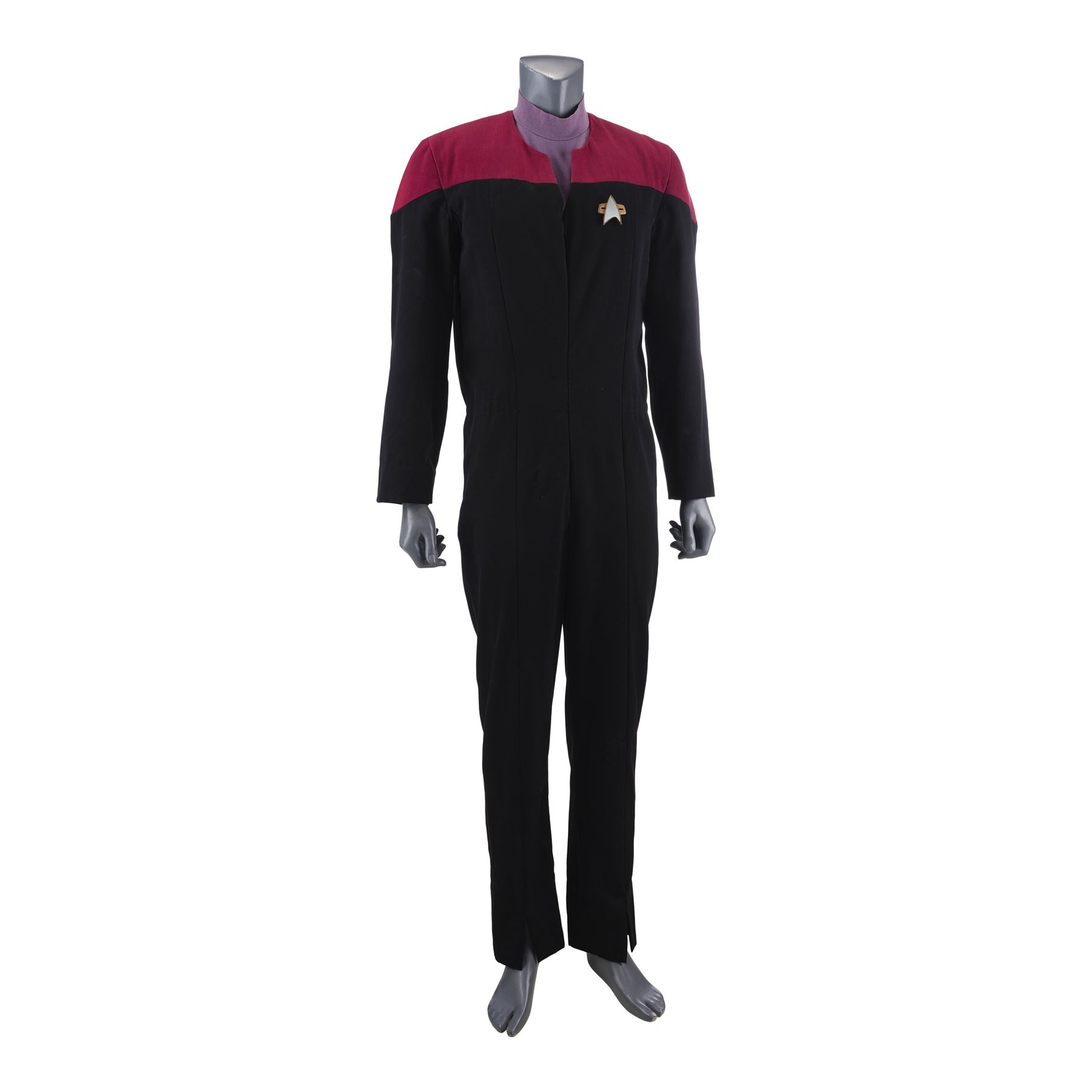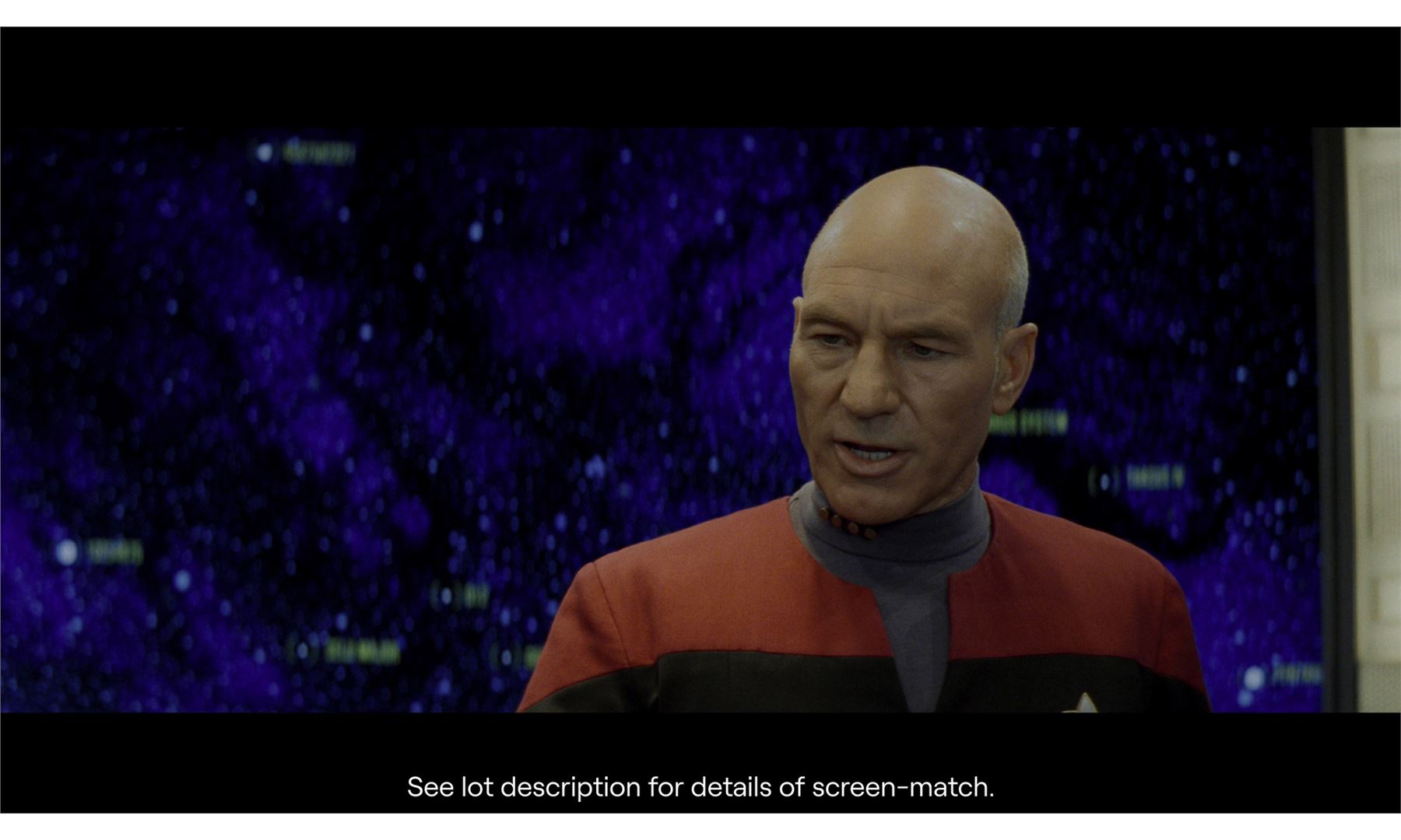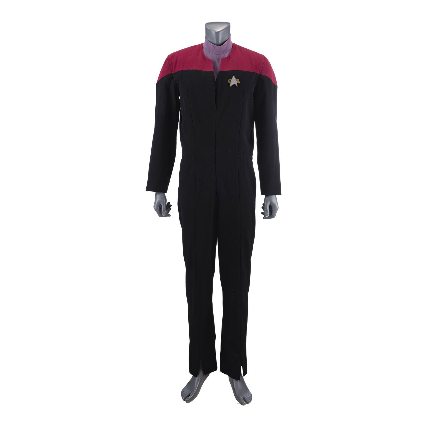 STAR TREK: GENERATIONS (1994) - Captain Jean-Luc Picard's (Patrick Stewart) Screen-Matched Starfleet Command Costume - Captain Jean-Luc Picard's (Patrick Stewart) screen-matched Starfleet command costume from David Carson's Star Trek Generations. Picard changed into his updated red-shouldered uniform before meeting with Guinan (Whoopi Goldberg) about Tolian Soran (Malcolm McDowell) and continued to wear it throughout the film. A small deformation where the yoke meets the body of the jumpsuit screen-matches this particular costume to the scene with Picard in Stellar Cartography with Data (Brent Spiner).