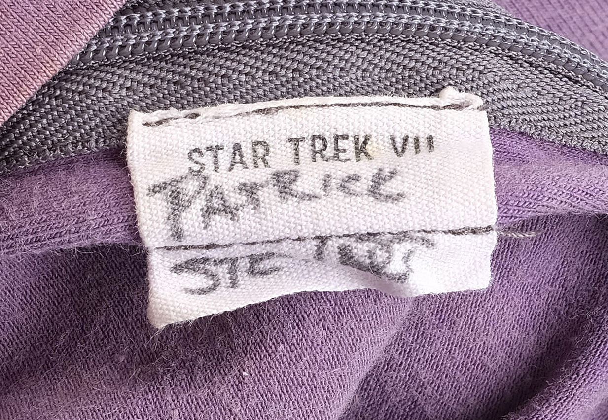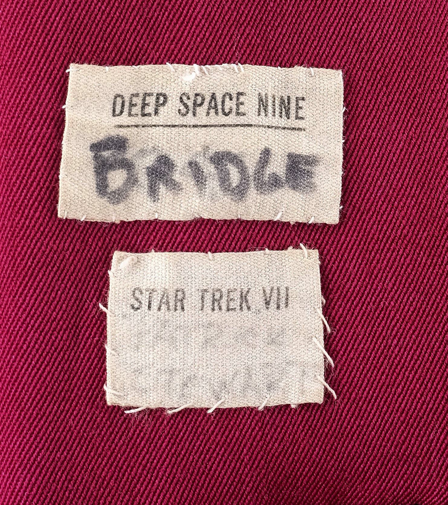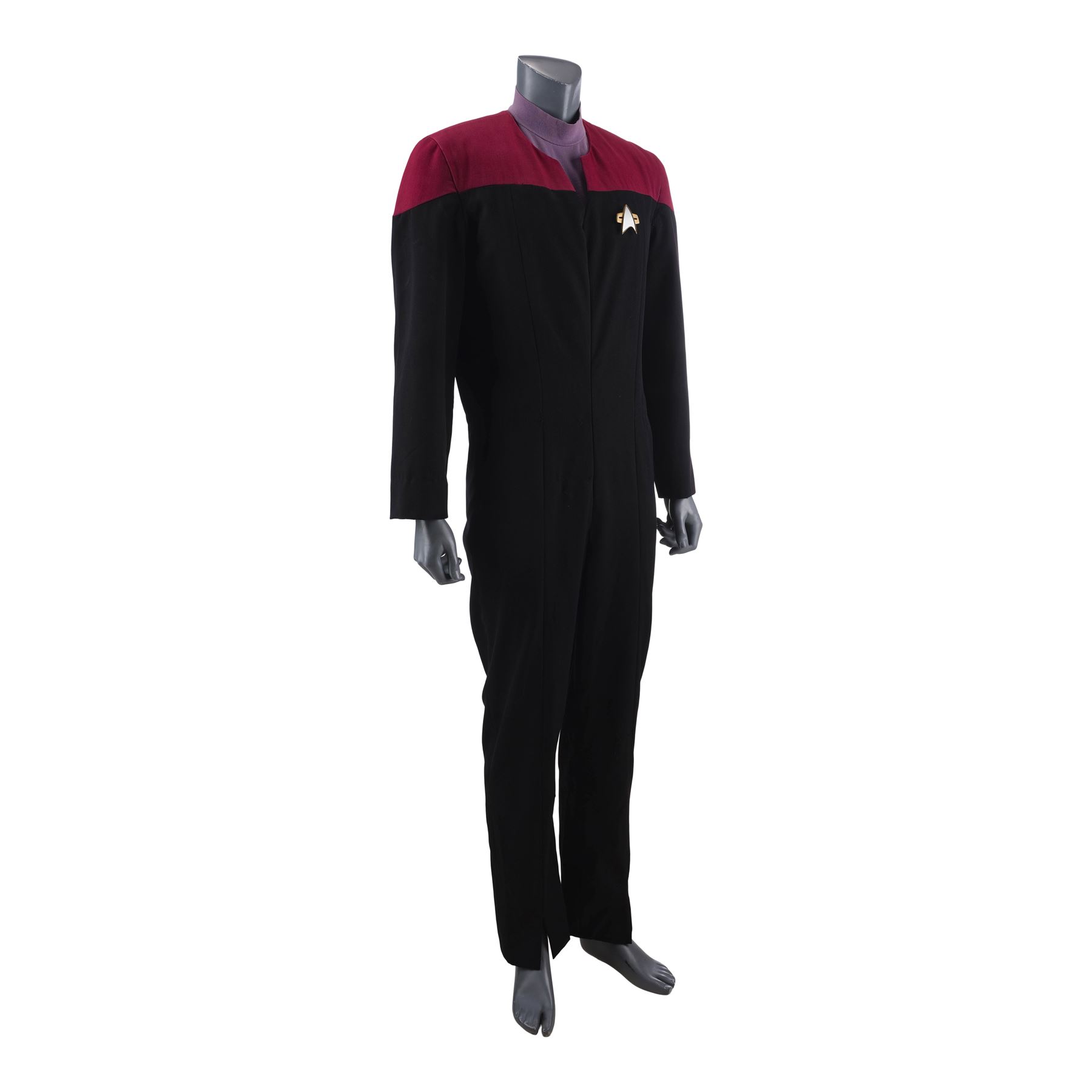 This costume consists of a black wool-blend zip-front jumpsuit with red command-division shoulders, a gold- and silver-color resin combadge attached to the left chest, and a blue-gray sleeveless zip-back mock-turtleneck undershirt with padding on the chest and shoulders to simulate musculature. Both elements feature sewn-in "Star Trek VII" tags marked "Patrick Stewart," with the jumpsuit featuring an additional "Deep Space Nine" tag marked "Bridge" as the jumpsuit was used for that series as well. The undershirt exhibits some discoloration from use and age, and the jumpsuit exhibits some small tears that were repaired with black thread.