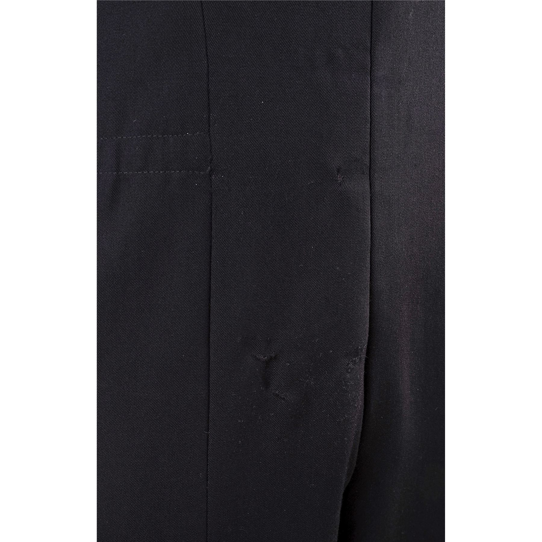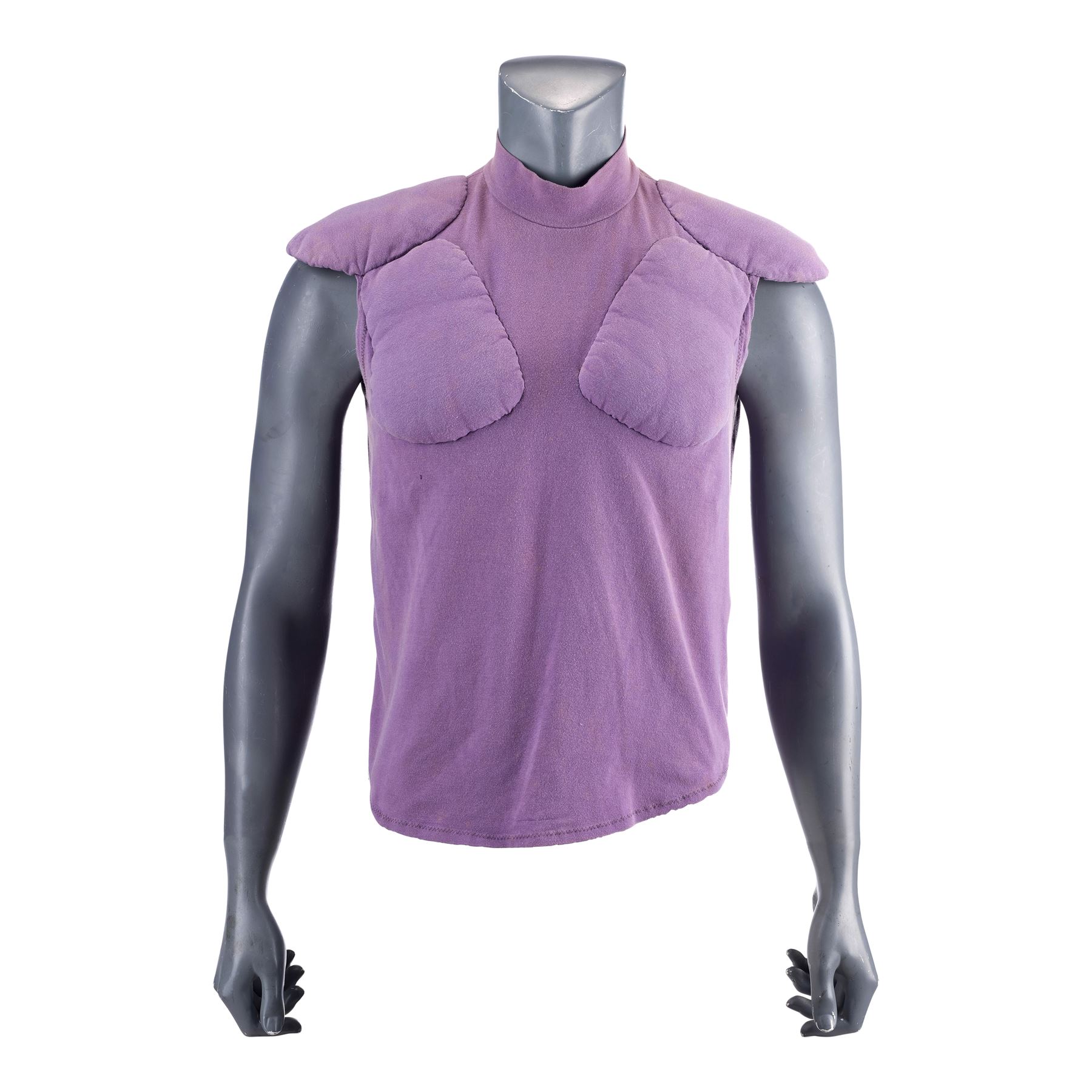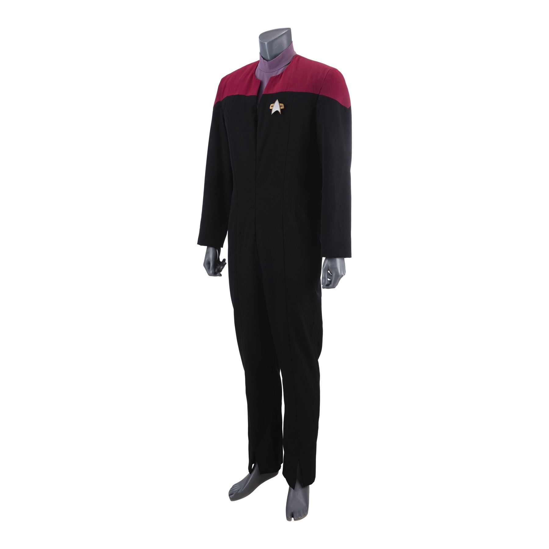 This costume consists of a black wool-blend zip-front jumpsuit with red command-division shoulders, a gold- and silver-color resin combadge attached to the left chest, and a blue-gray sleeveless zip-back mock-turtleneck undershirt with padding on the chest and shoulders to simulate musculature. Both elements feature sewn-in "Star Trek VII" tags marked "Patrick Stewart," with the jumpsuit featuring an additional "Deep Space Nine" tag marked "Bridge" as the jumpsuit was used for that series as well. The undershirt exhibits some discoloration from use and age, and the jumpsuit exhibits some small tears that were repaired with black thread.