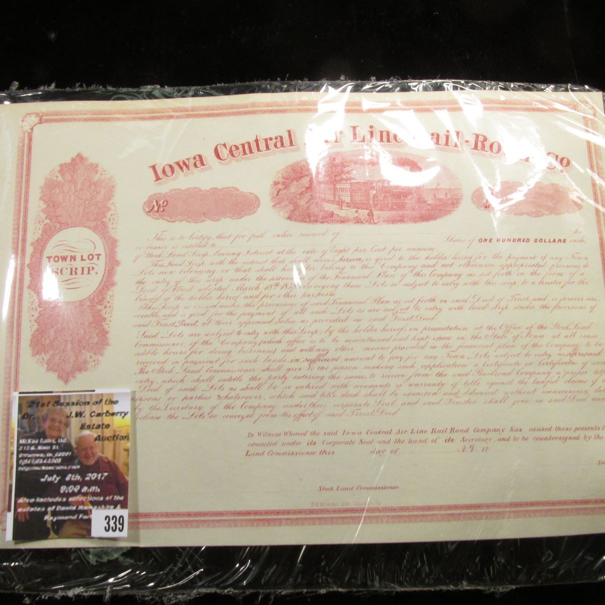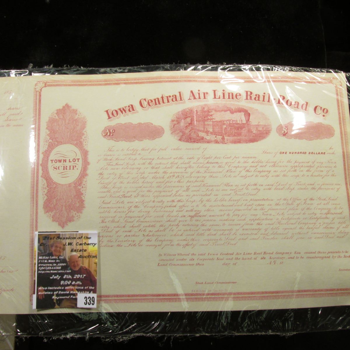 339.Unissued or signed "Town Lot Scrip" valid for land owned by the "Iowa Central Air Line Rail-Road Co.", near crisp Uncirculated.