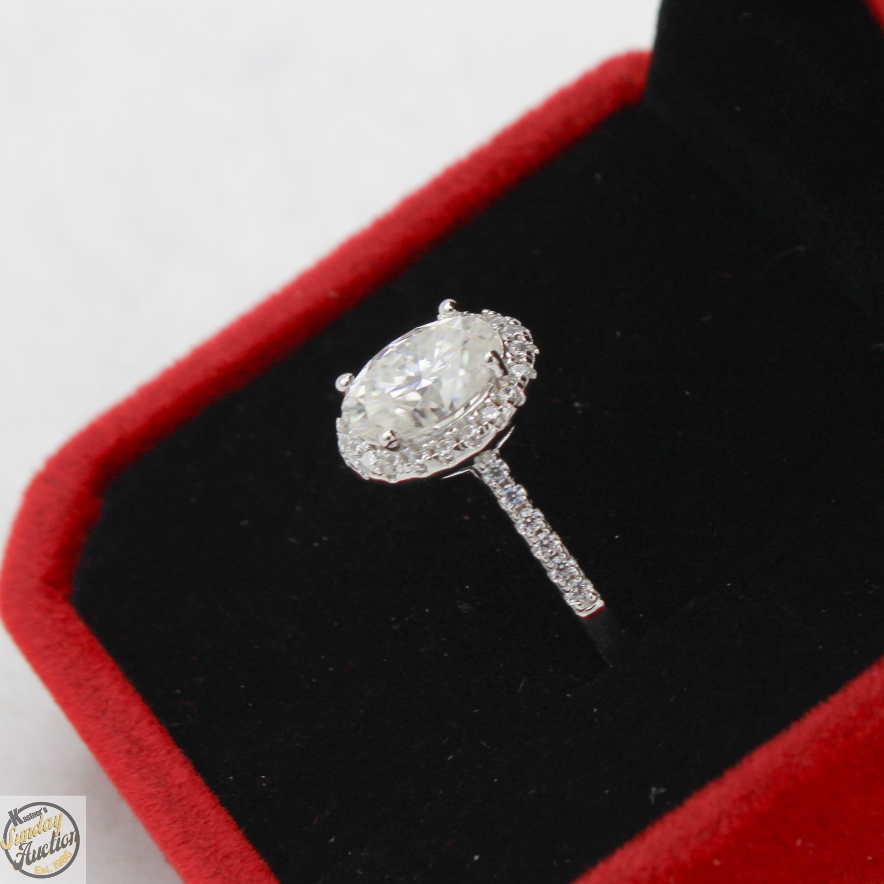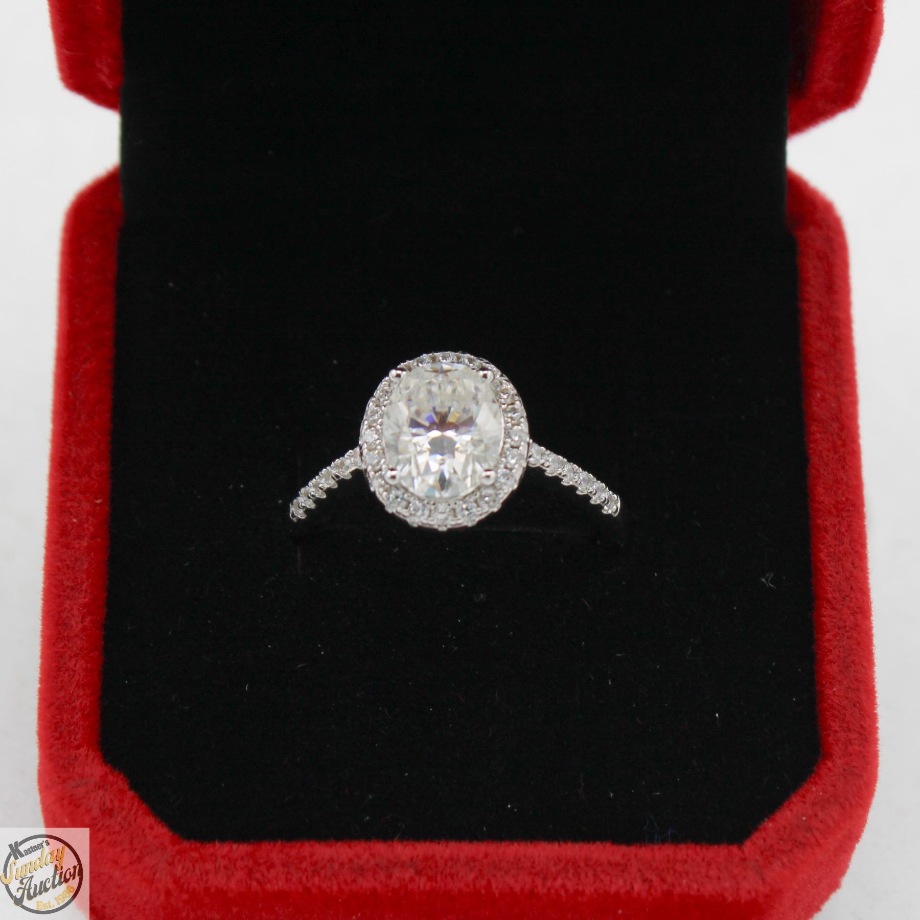 MOISSANITE STONE VVS D COLOR WITH 32 ROUND BRILLIANT CUT CUBIC ZIRCONIA SET IN OVAL SHAPED HALO AND SET IN 925 SILVER RING SIZE 7.5 RETAIL VALUE $1,025.00 **ALL ITEMS MUST BE REMOVED BY 5PM SATURDAY, DECEMBER 6TH 2025. ALL REMAINING ITEMS WILL BE SUBJECT TO A $6.00 PER DAY STORAGE CHARGE. ANY ITEMS REMAINING AFTER MONDAY, DECEMBER 22ND 2025 WILL BE CONSIDERED FORFEITED. NO REFUNDS WILL BE ISSUED FOR FORFEITED ITEMS. TO SCHEDULE A PICK UP APPOINTMENT CLICK HERE
