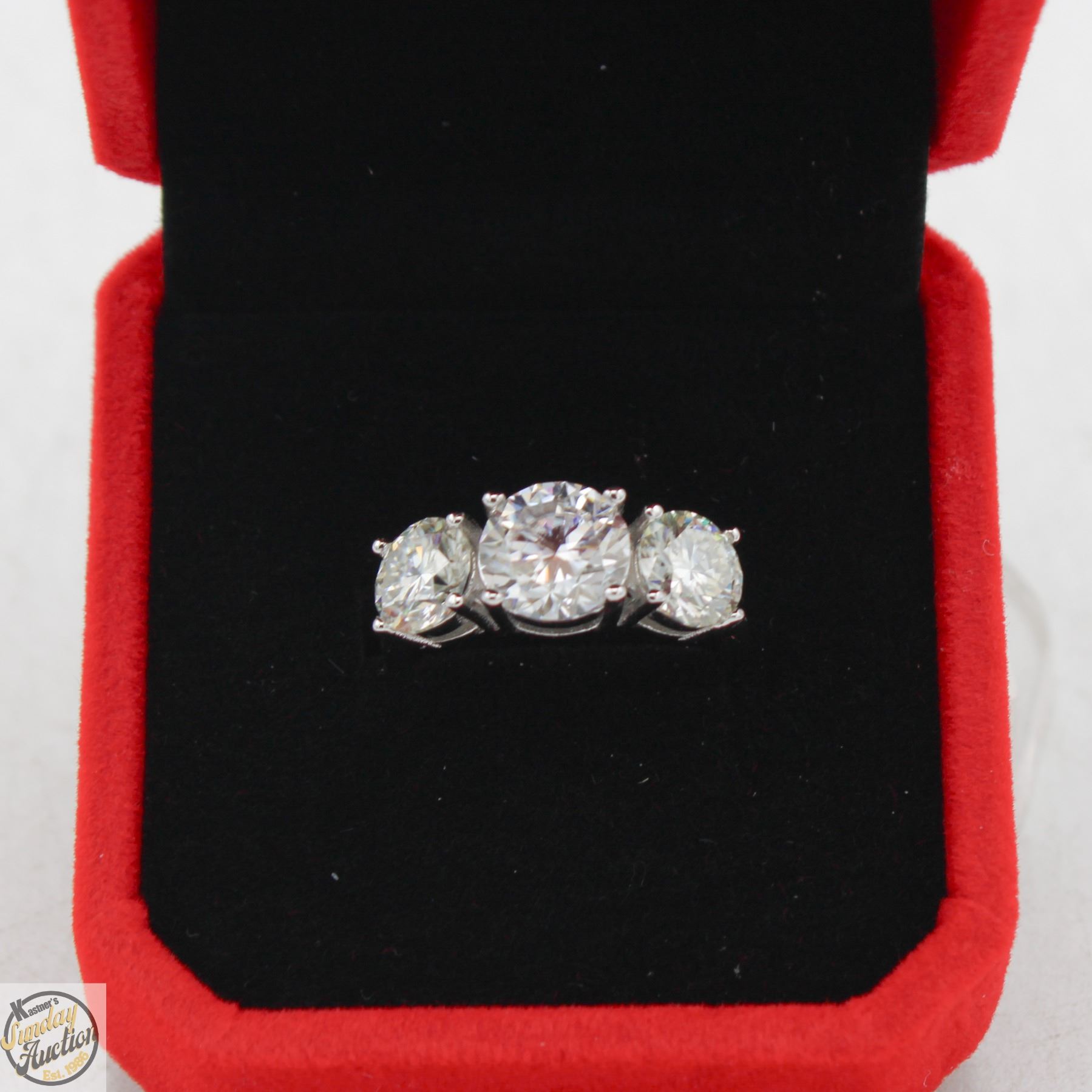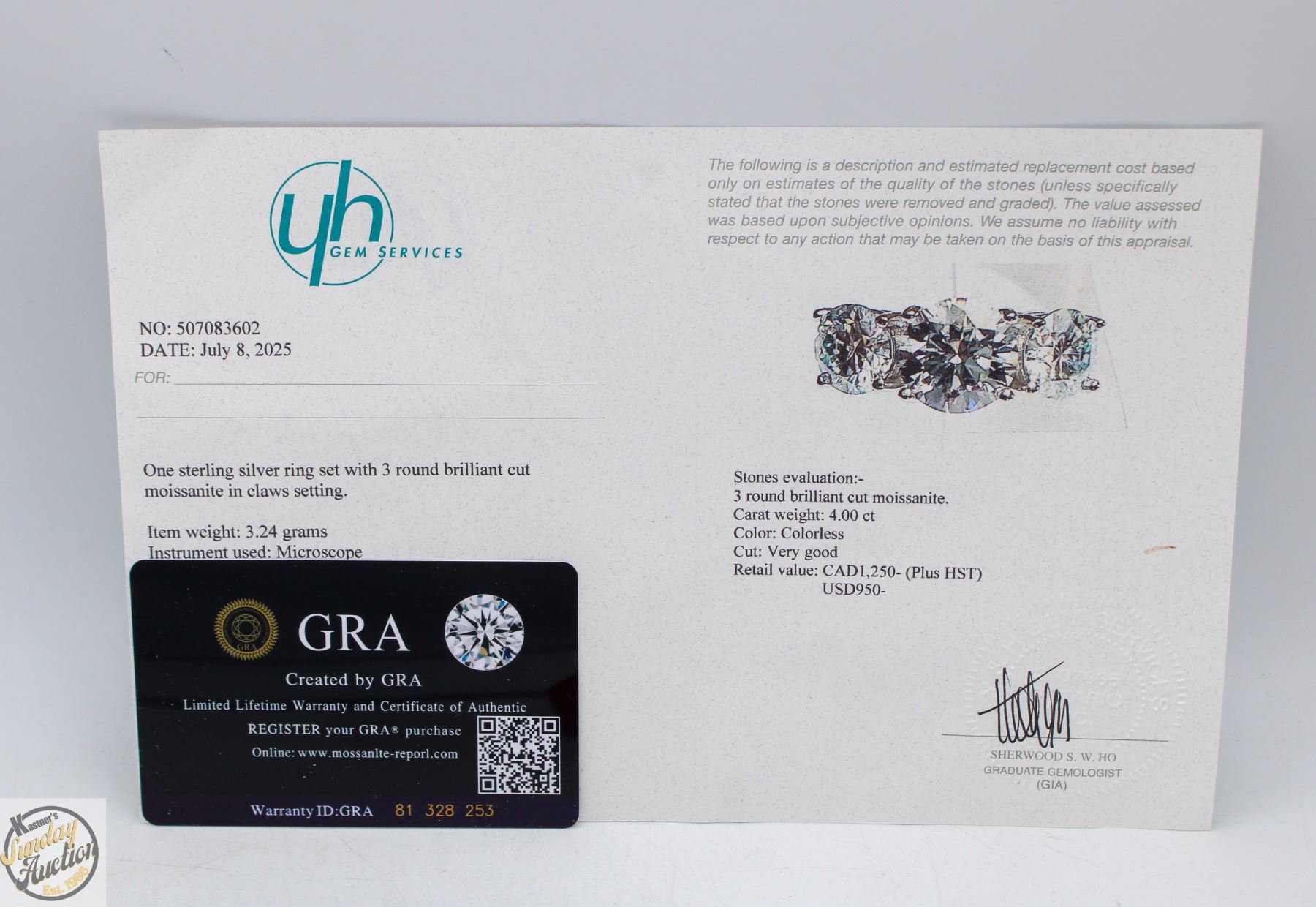 CUT MOISSANITE STONES VVS D COLOR WITH 2.00 CT SET IN CENTER WITH 1.00 CARAT SET ON EITHER SIDE AND SET IN 925 SILVER RING SIZE 6.25 RETAIL VALUE $1,250.00 **ALL ITEMS MUST BE REMOVED BY 5PM SATURDAY, DECEMBER 6TH 2025. ALL REMAINING ITEMS WILL BE SUBJECT TO A $6.00 PER DAY STORAGE CHARGE. ANY ITEMS REMAINING AFTER MONDAY, DECEMBER 22ND 2025 WILL BE CONSIDERED FORFEITED. NO REFUNDS WILL BE ISSUED FOR FORFEITED ITEMS. TO SCHEDULE A PICK UP APPOINTMENT CLICK HERE