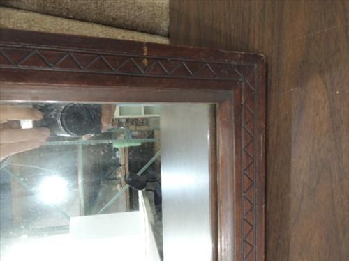 33X27 VINTAGE ARTS & CRAFT MAHOGANY HALL MIRROR. AS SHOWN. VIEW PICTURE FOR DETAIL.