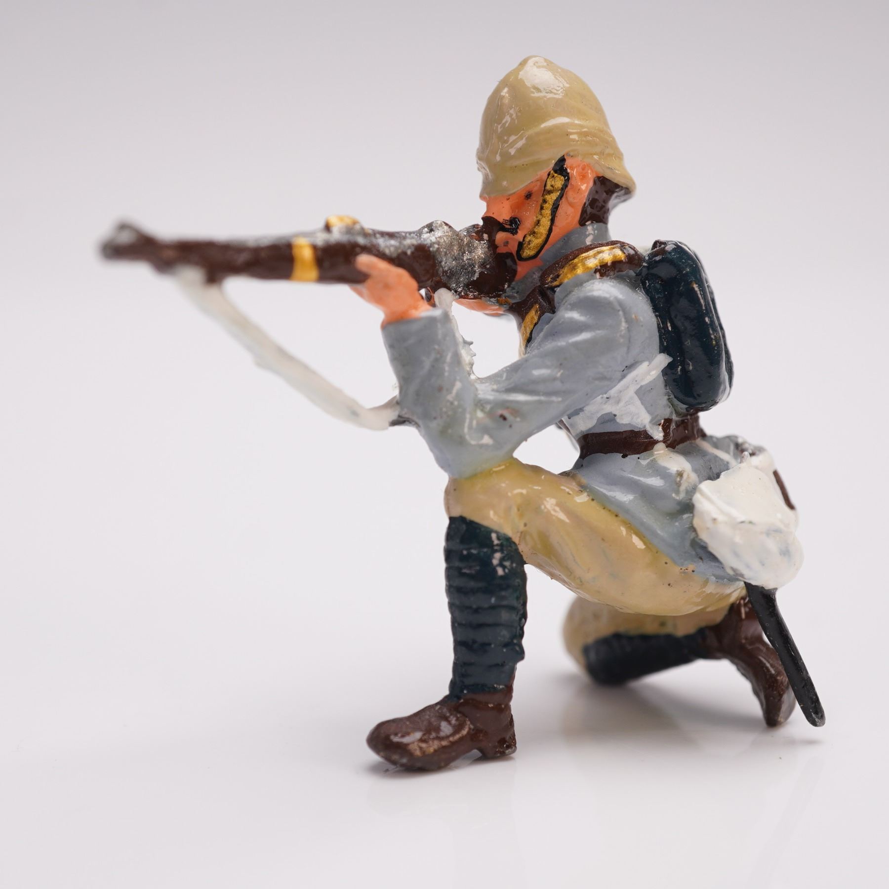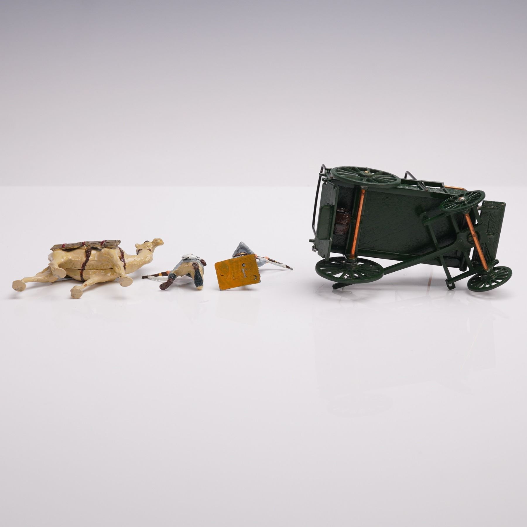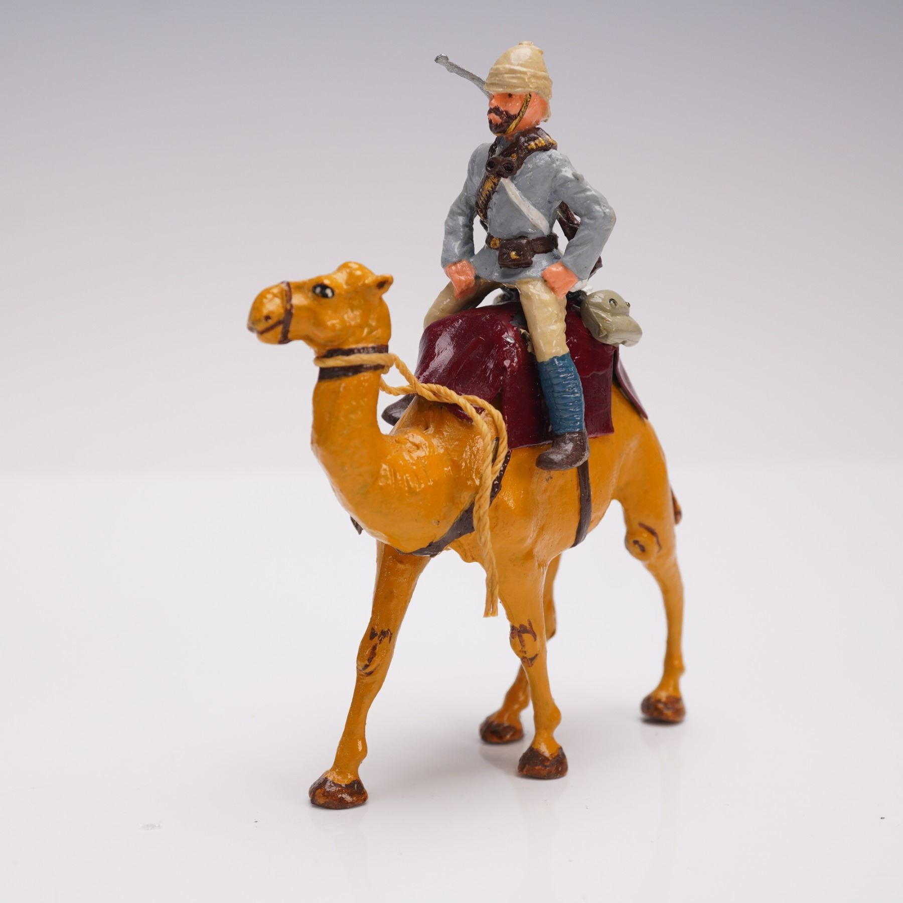 Collection of thirty-three hand-painted miniature figures depicting British colonial troops, modeled after the historical Camel Corps units used during late 19th-century desert campaigns, such as those in Egypt or Sudan. The set includes standing and kneeling riflemen, mounted camel riders, camels with packs, a green supply wagon with separate removable items, and various accessories. Several pieces are marked "El Templario" or "ET," indicating the maker. Riders are detachable from camels. The figures are crafted in metal and painted in historically styled uniforms and gear. The largest figure approximately measures: 7.25"L x 2.25"W x 3.5"H.