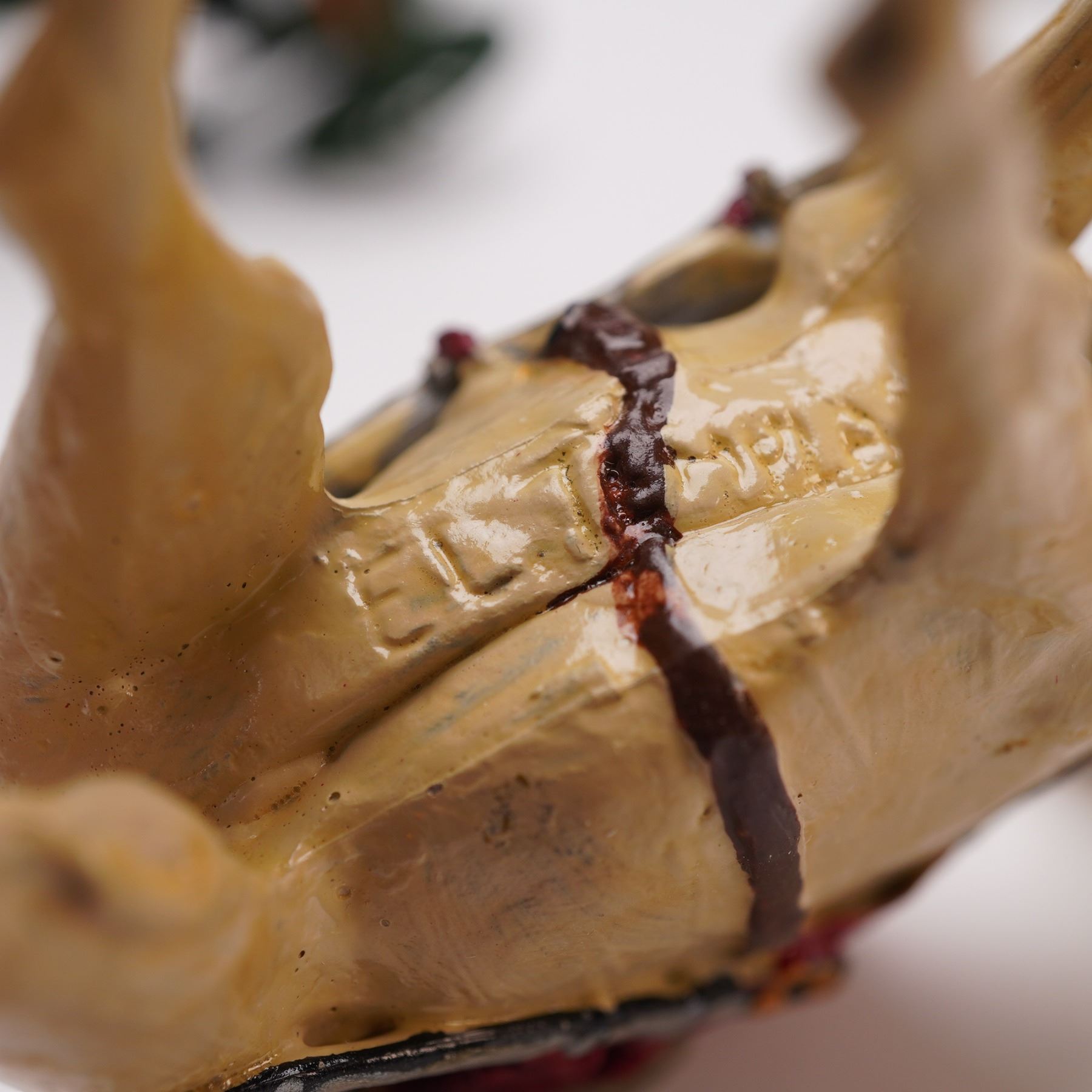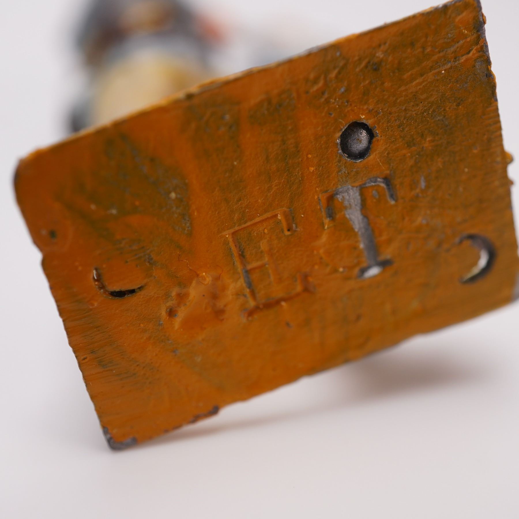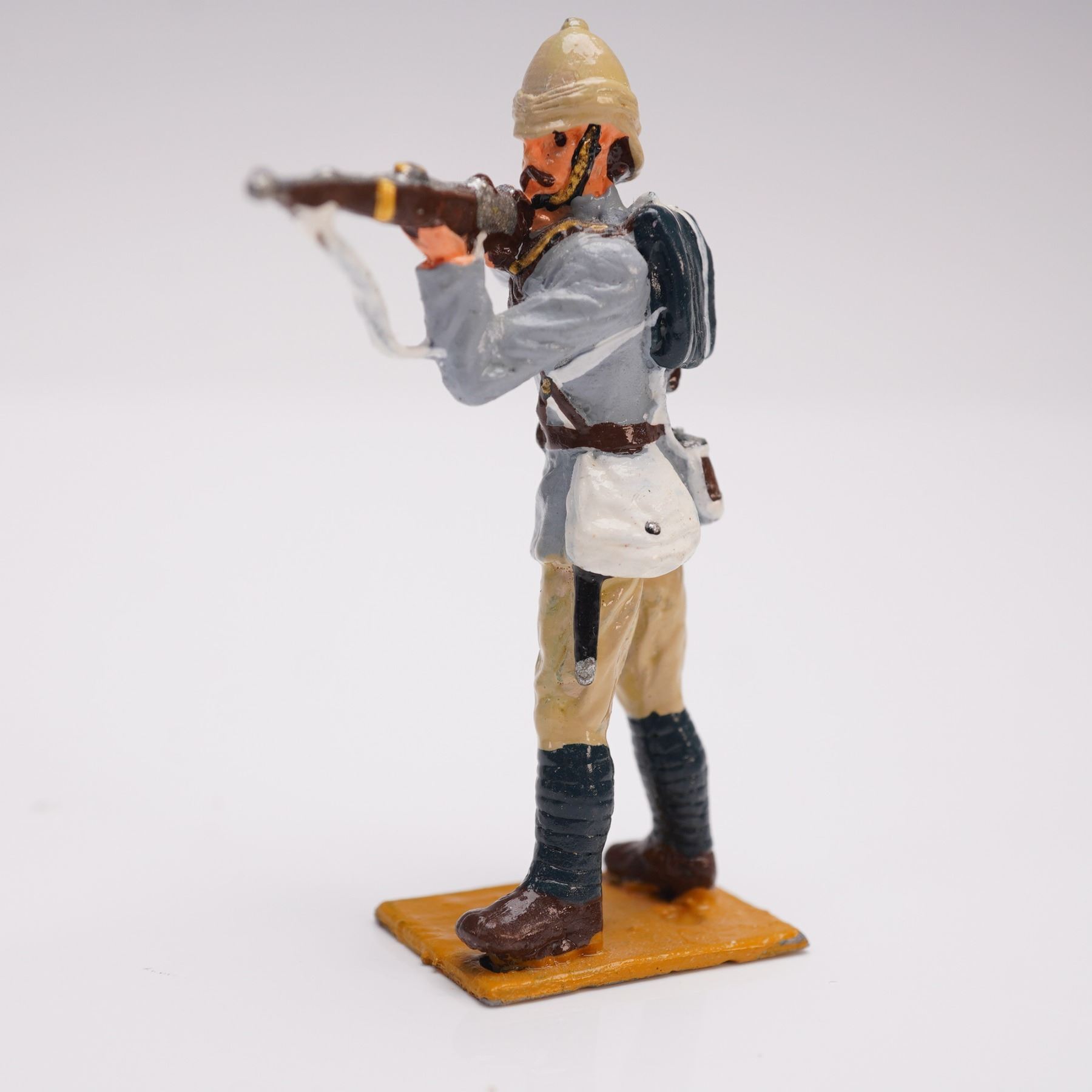 Collection of thirty-three hand-painted miniature figures depicting British colonial troops, modeled after the historical Camel Corps units used during late 19th-century desert campaigns, such as those in Egypt or Sudan. The set includes standing and kneeling riflemen, mounted camel riders, camels with packs, a green supply wagon with separate removable items, and various accessories. Several pieces are marked "El Templario" or "ET," indicating the maker. Riders are detachable from camels. The figures are crafted in metal and painted in historically styled uniforms and gear. The largest figure approximately measures: 7.25"L x 2.25"W x 3.5"H.