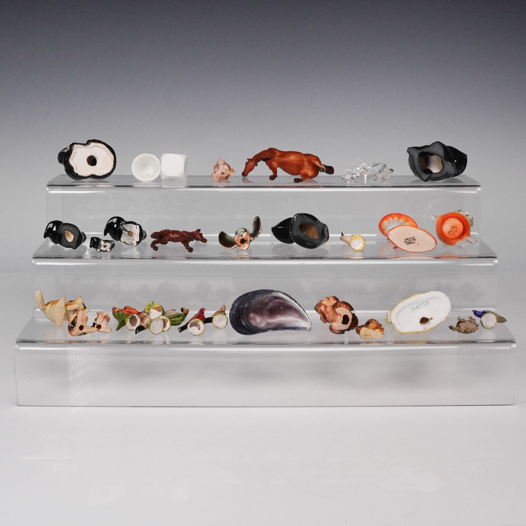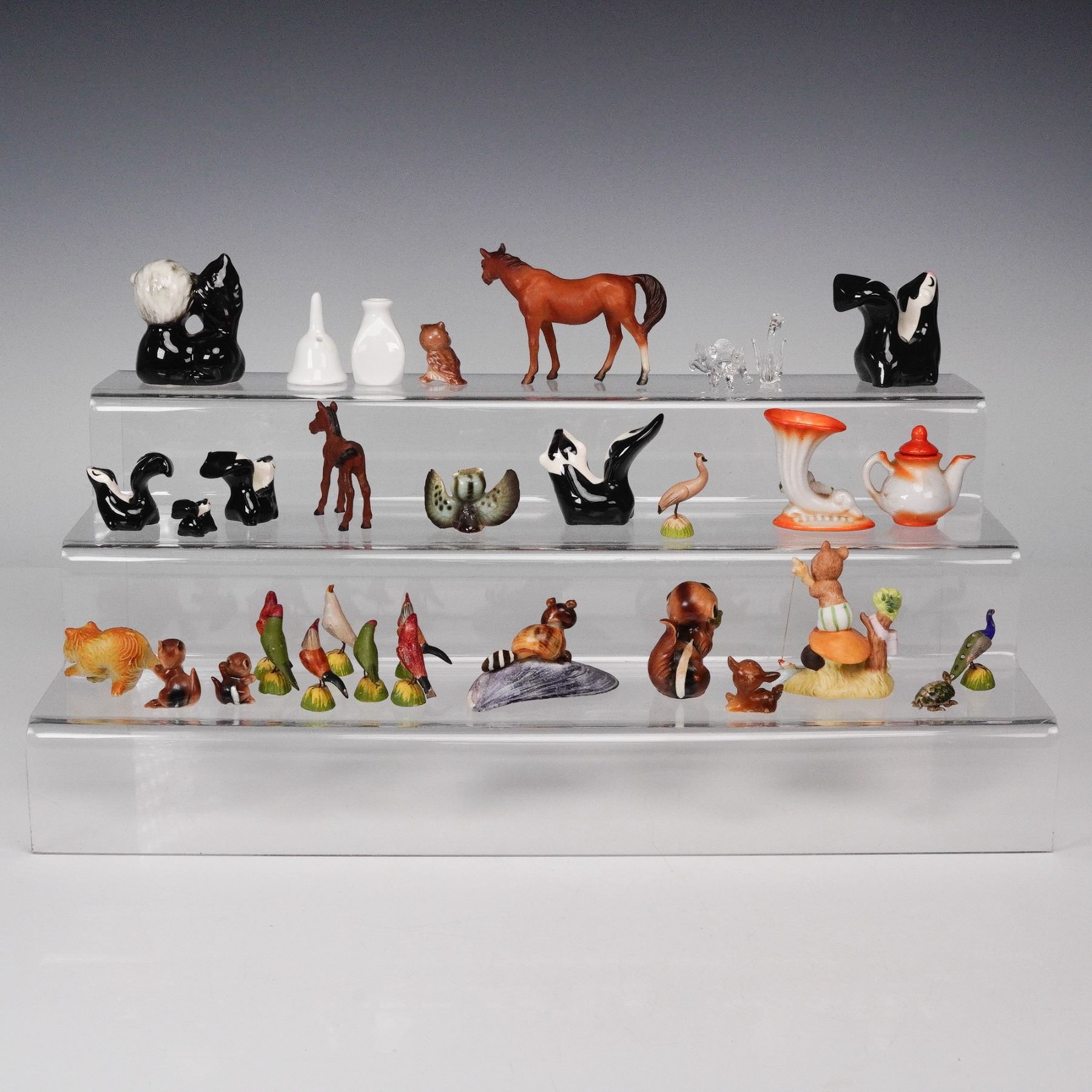 Charming assorted collection of miniature animal and bird figurines crafted from ceramic, porcelain, wood, and other materials. The grouping includes a family of six skunks, horses, owls, raccoons, squirrels, birds, and other woodland and domestic animals. Several pieces are hand-painted, with select examples featuring delicate floral embellishments or lustre accents. A delightful display of mid-century and vintage miniature craftsmanship.