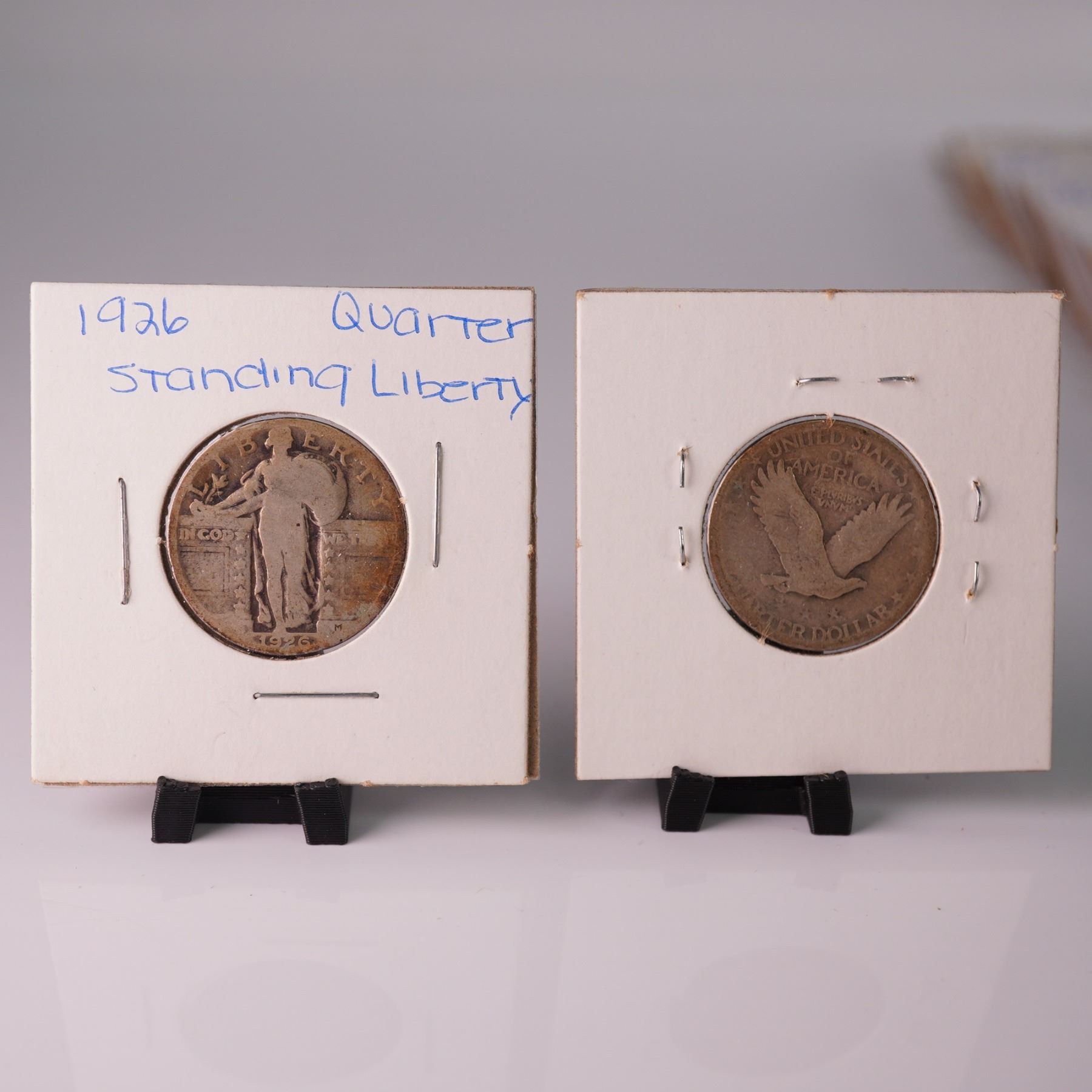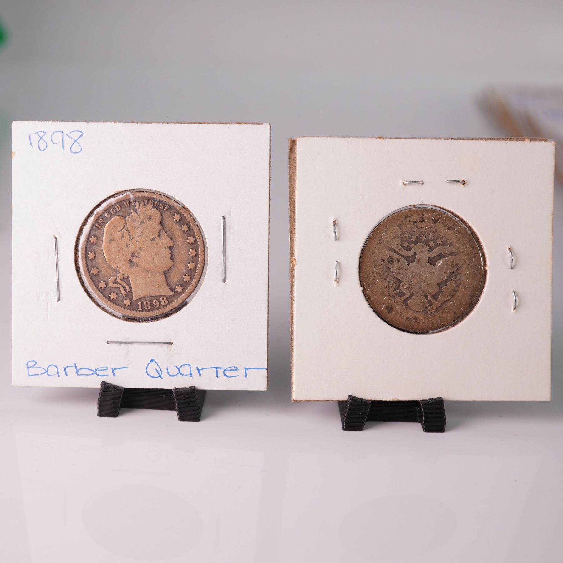Mixed lot of 33 U.S. quarters including Barber, Standing Liberty, and Washington designs, spanning various dates and mint marks. Highlights include multiple 1898 Barber quarters, a 1926 Standing Liberty quarter, and a selection of silver Washington quarters dated before 1965. Each coin is housed in a standard 2"x2" holder with handwritten labels. The lot shows a range of natural patinas and wear consistent with circulation, making it ideal for collectors seeking vintage U.S. silver coinage across multiple types and eras.