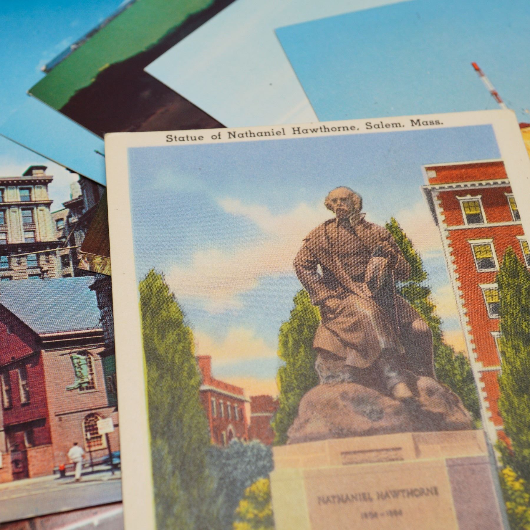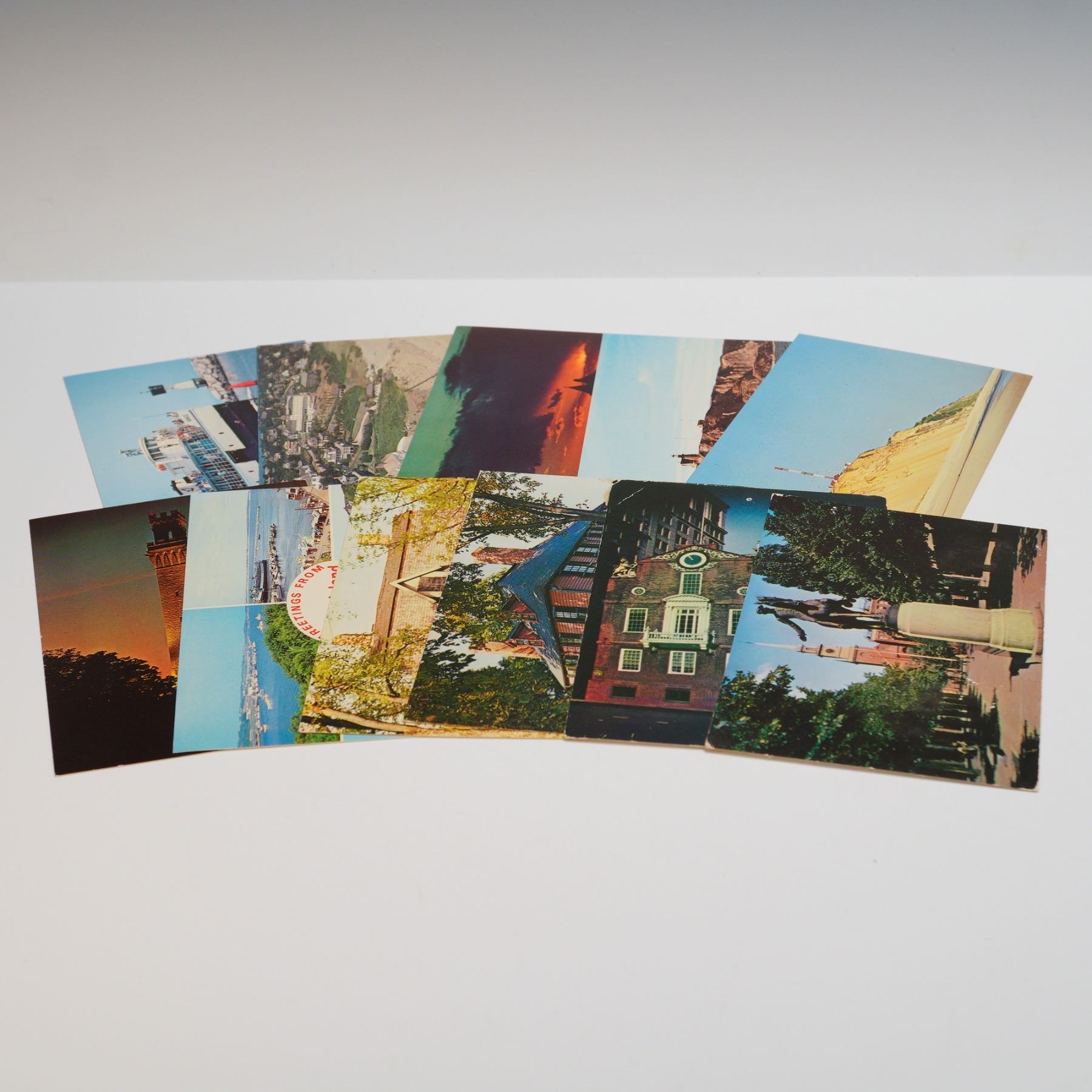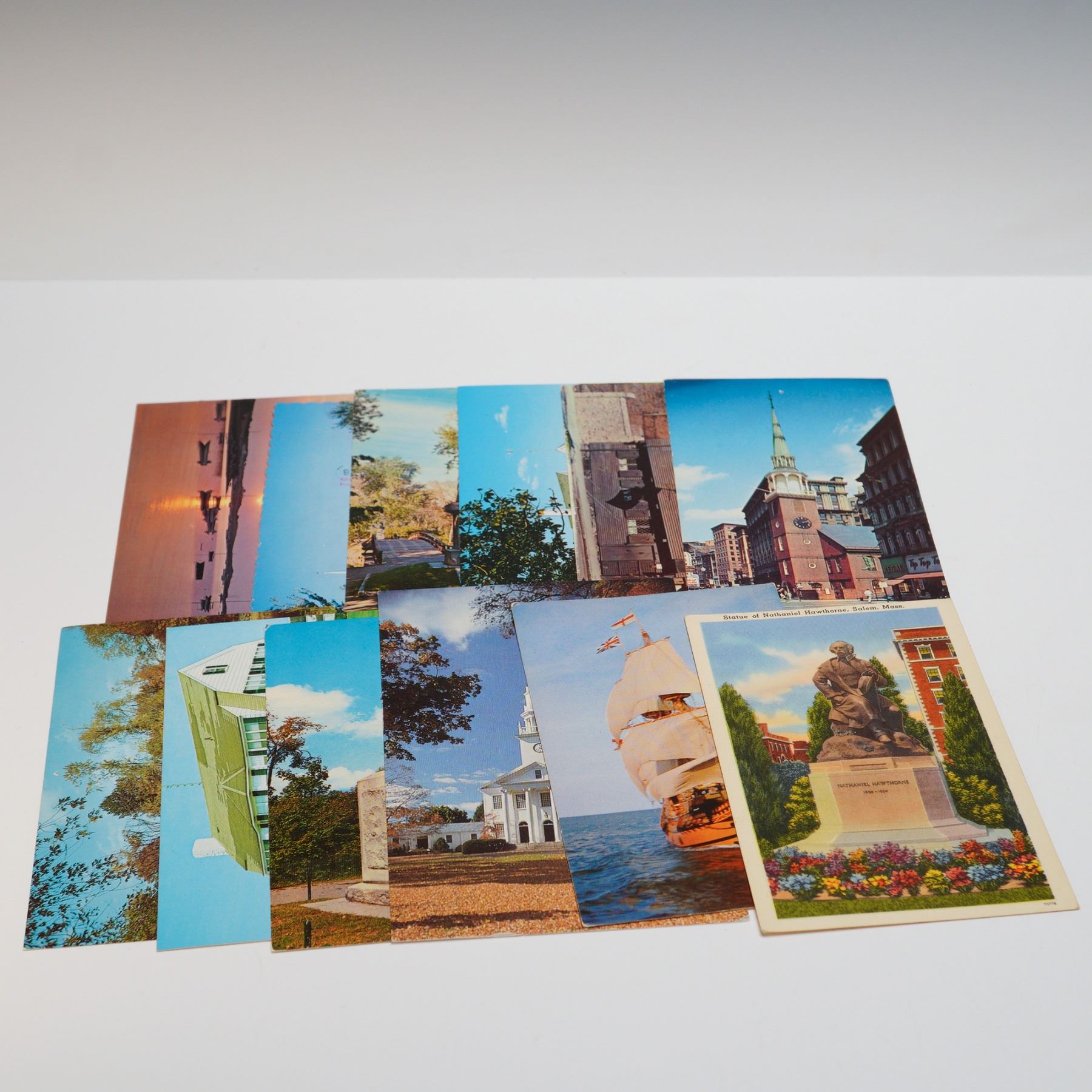 A collection of 33 vintage postcards showcasing landmarks, architecture, and scenery from Rhode Island and Massachusetts. Subjects include historic churches, monuments, harbors, ships, and notable sites such as the Nathaniel Hawthorne statue in Salem, Massachusetts. The group contains a variety of linen and color-printed postcards, all but one is unused. A diverse selection ideal for collectors of New England ephemera.