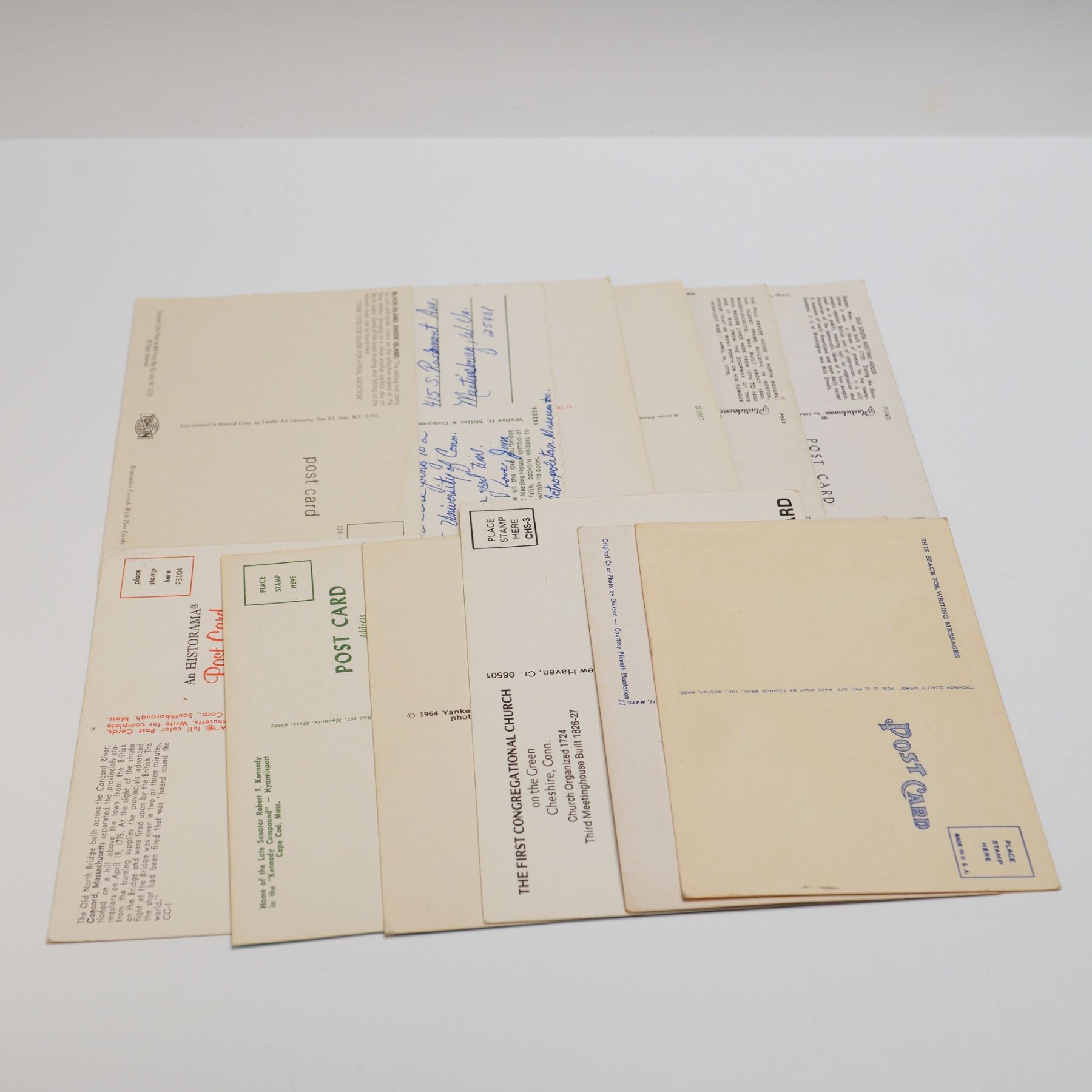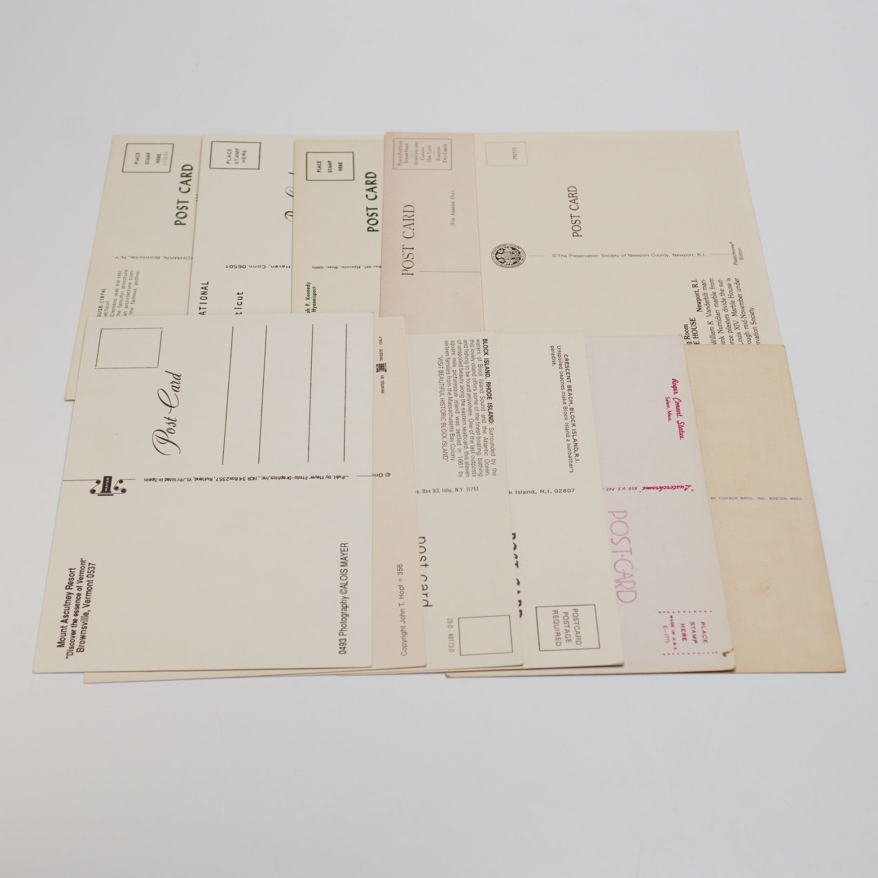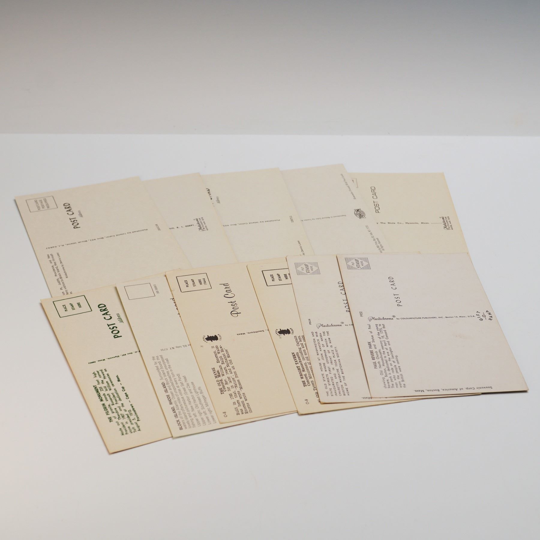 A collection of 33 vintage postcards showcasing landmarks, architecture, and scenery from Rhode Island and Massachusetts. Subjects include historic churches, monuments, harbors, ships, and notable sites such as the Nathaniel Hawthorne statue in Salem, Massachusetts. The group contains a variety of linen and color-printed postcards, all but one is unused. A diverse selection ideal for collectors of New England ephemera.