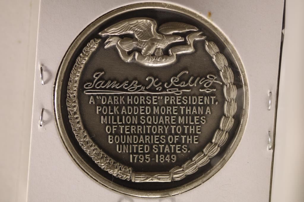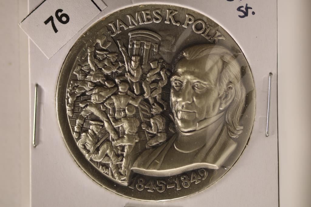 K. POLK" PRESIDENTIAL ROUND, ANTIQUE FINISH, UNC, 1.013 OZ. ASW