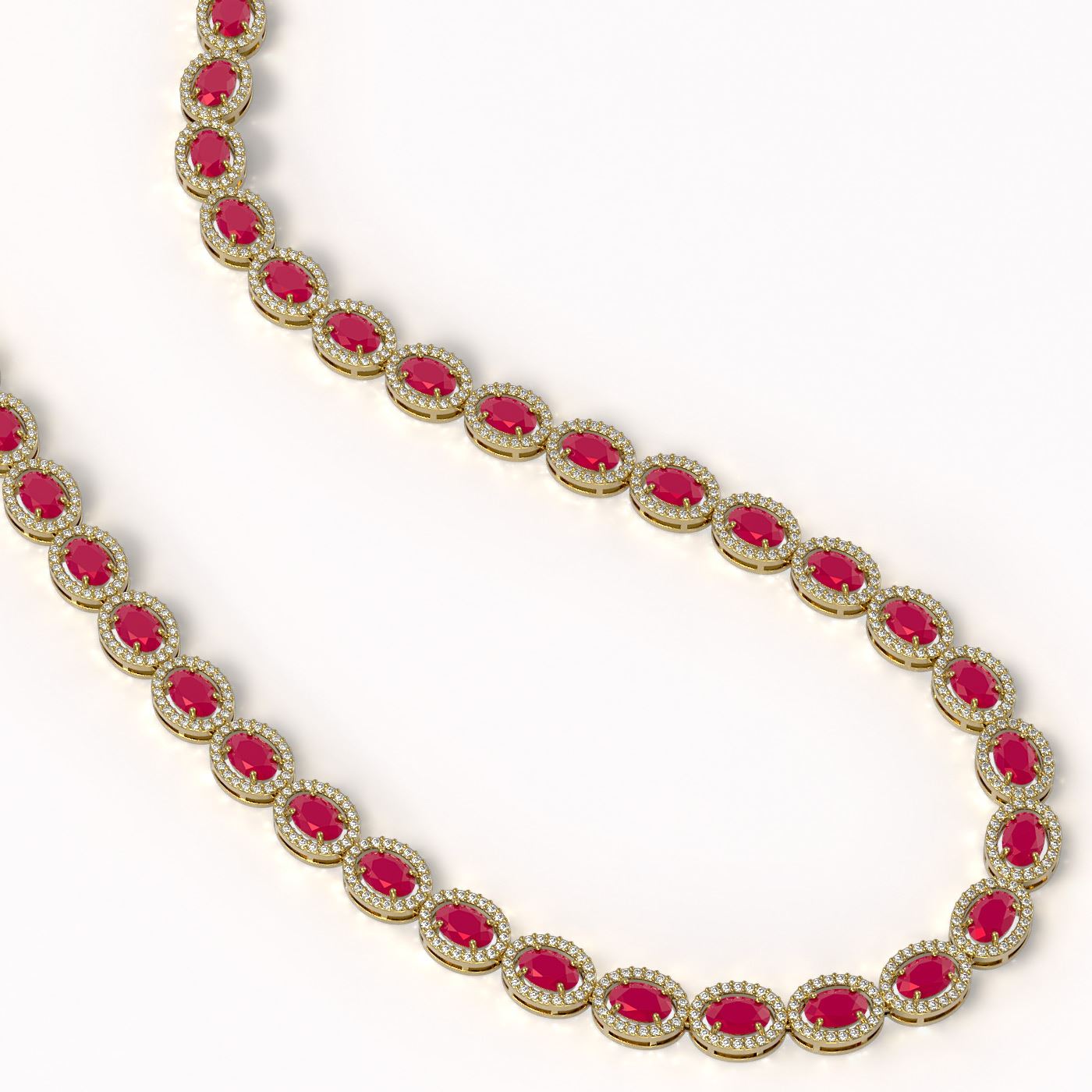 REF-562W9F -40405 ---- 34.11 CTW Ruby & Diamond Halo Necklace 10K Yellow Gold ---- Luxury Designer Brand Necklace Appraised at $30,950 Certificate Number US40405 10k Yellow gold, Necklace Size is 16 Inches, Necklace measuring approx. 8 mm x 16 Inches, weighing in total approx. 29 grams. Made in the USA and is stamped 10k, Main stone 27.95 carat total weight containing 43 pieces of Mid-Opaque-Deep Red color with AAA quality Oval shape cut Ruby , Stone #2 6.16 carat total weight containing 860 pieces of G-H color with VS/SI quality Round shape cut Diamond