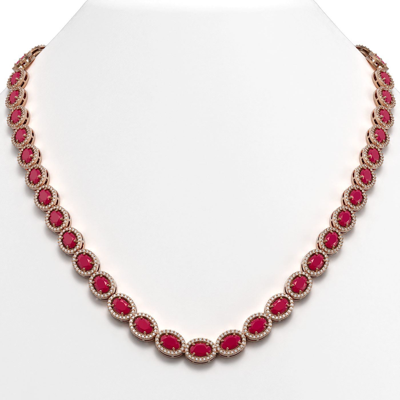 40404 - REF-562V9Y ---- 34.11 CTW Ruby & Diamond Necklace Rose Gold 10K Rose Gold ---- Luxury Designer Brand Necklace Appraised at $37,150 Certificate Number US40404  10k Rose gold,  Necklace Size is 16 Inches, Necklace measuring approx. 8 mm x 16 Inches, weighing in total approx. 29 grams. Made in the USA and is stamped 10k, Main stone 27.95 carat total weight containing 43 pieces of Mid-Opaque-Deep Red color with AAA quality Oval shape cut Ruby , Stone #2 6.16 carat total weight containing 860 pieces of G-H color with  VS/SI quality Round shape cut Diamond