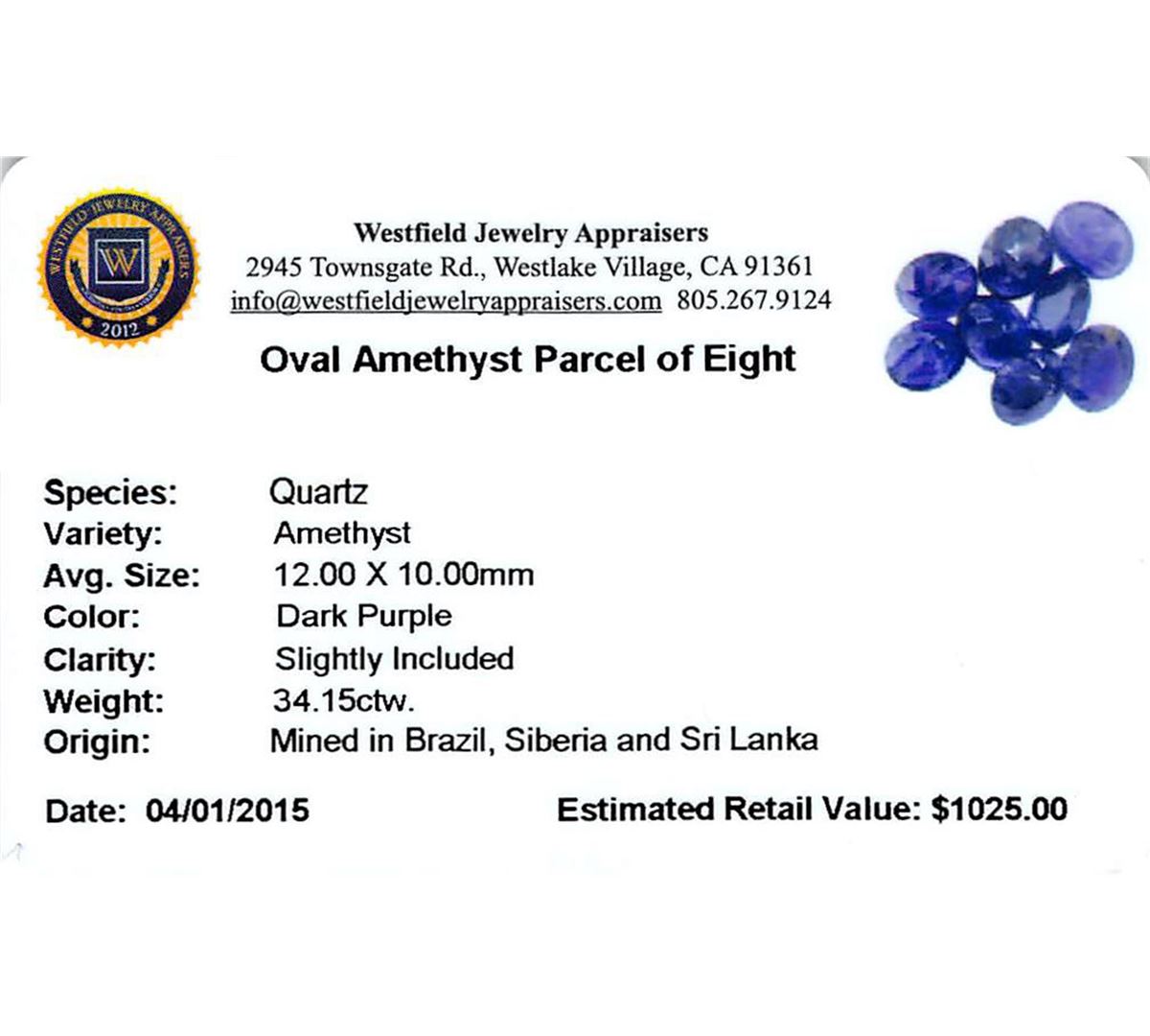 One oval cut natural amethyst exact weight 34.15ct., clarity is slightly included, type II, dark, very slightly grayish, purple color, (GIA P 7/3), cut is good. Westfield Appraised at $1,025.00.