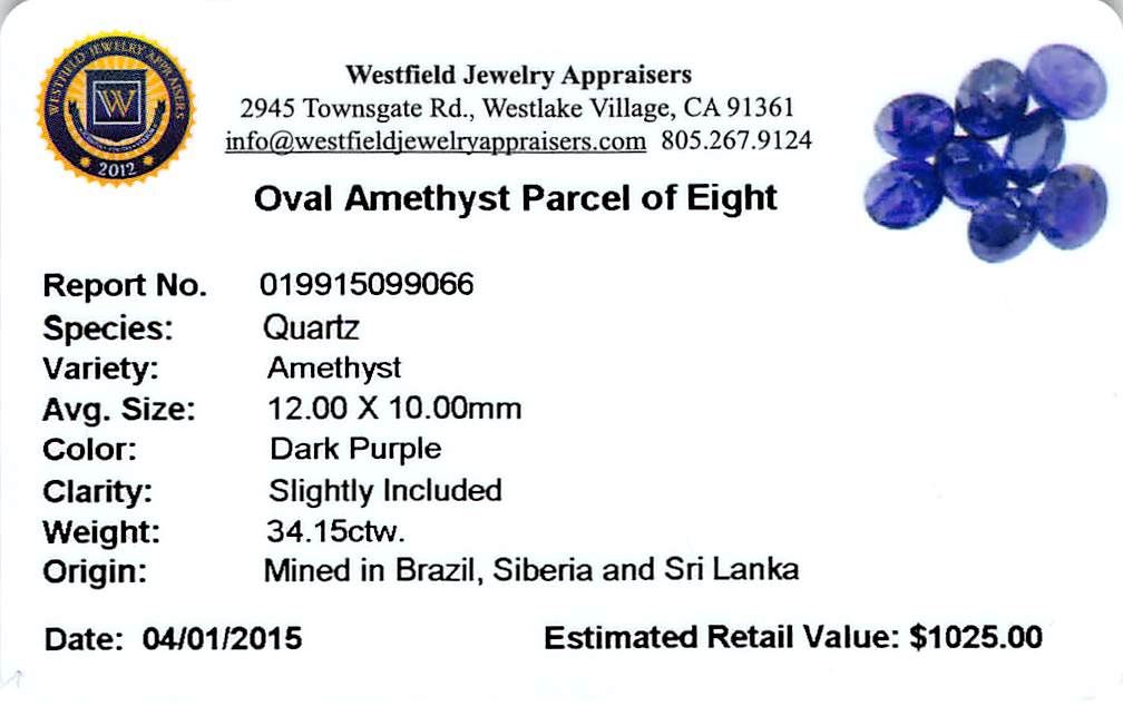 One oval cut natural amethyst exact weight 34.15ct., clarity is slightly included, type II, dark, very slightly grayish, purple color, (GIA P 7/3), cut is good. Westfield Appraised at $1,025.00.