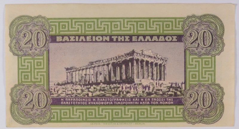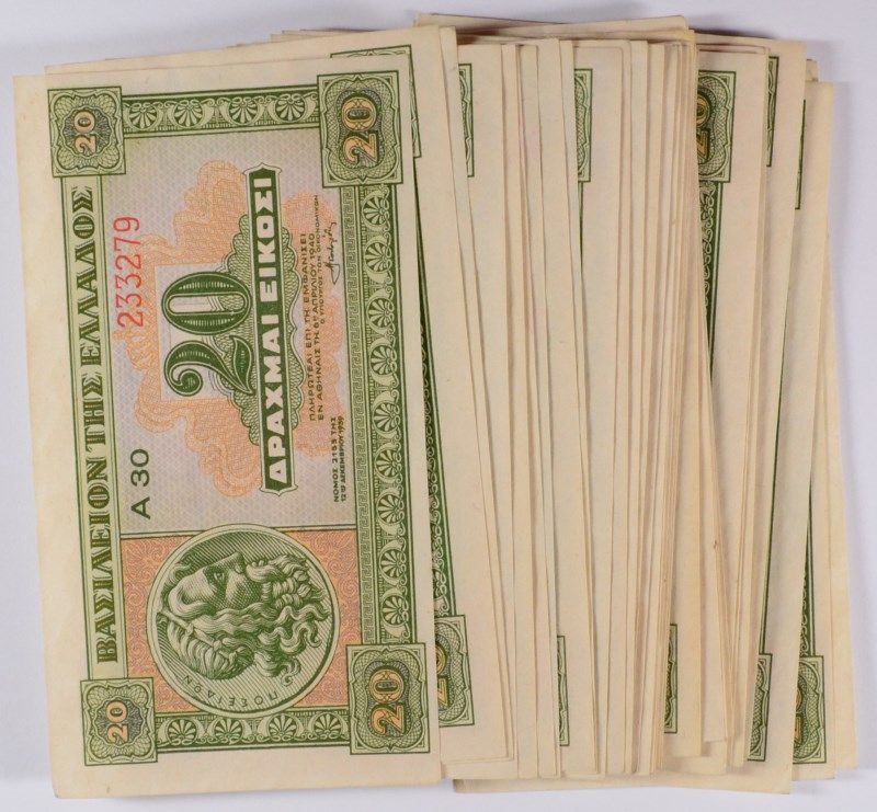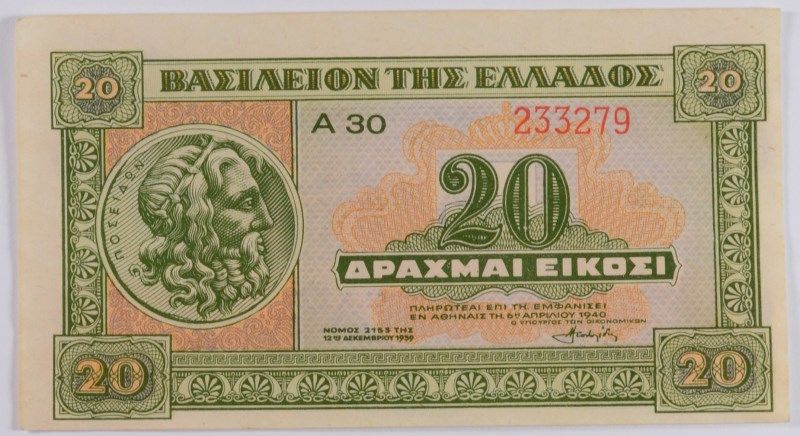 ( 34 ) 1940 20 DRACHMAI GREECE, CHOICE UNCIRCULATED, BEAUTIFUL NOTES!!
