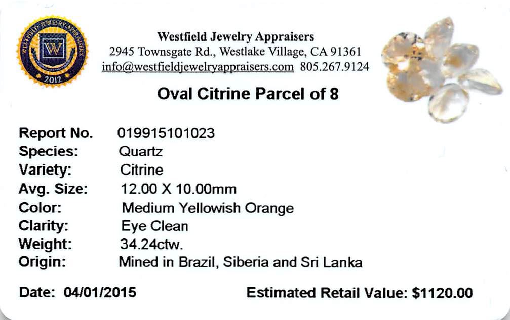 Eight oval mixed cut natural citrine quartzs exact total weight 34.24ct., clarity is eye clean, type I, medium, slightly brownish, yellowish orange color, (GIA yO 5/2), cut is good. Westfield Appraised at $1,120.00.