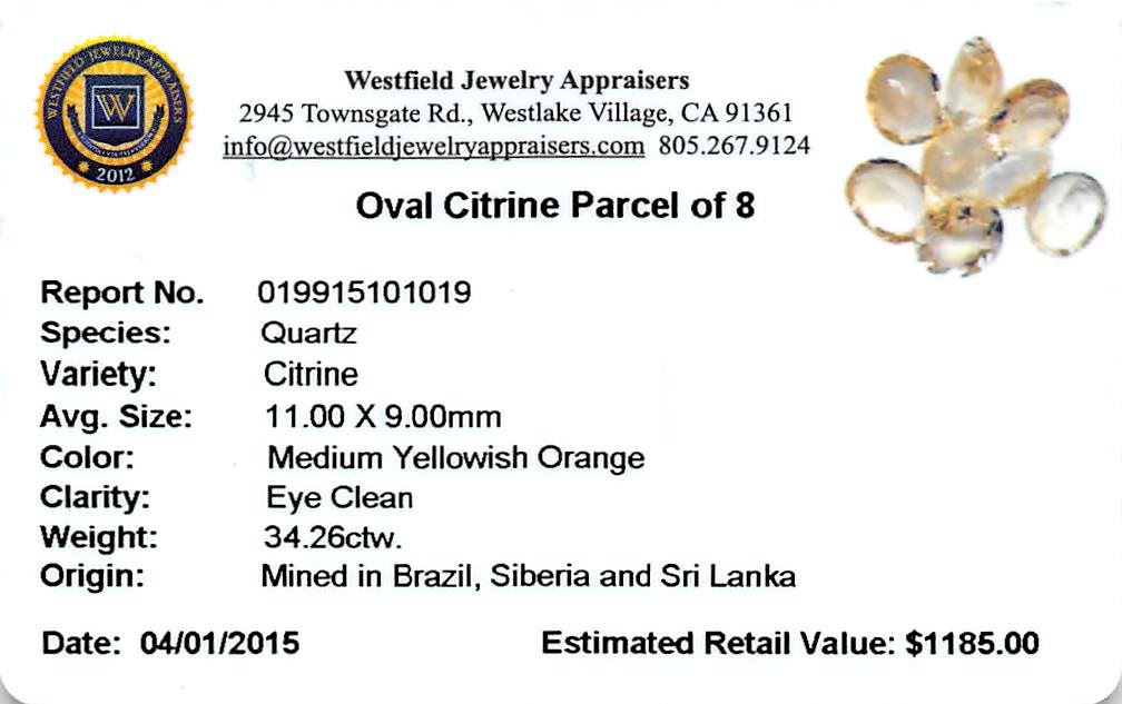 Eight oval mixed cut natural citrine quartzs exact total weight 34.26ct., clarity is eye clean, type I, medium, slightly brownish, yellowish orange color, (GIA yO 5/2), cut is good. Westfield Appraised at $1,185.00.