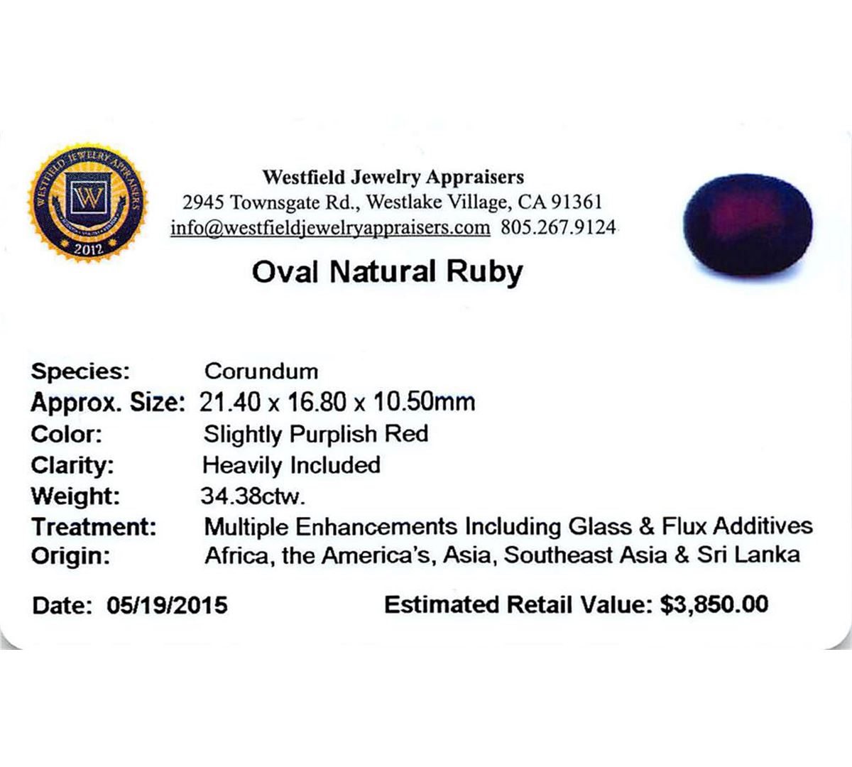 One oval mixed cut natural ruby, measuring 21.40 x 16.80 x 10.50mm, exact weight 34.38ct., clarity is heavily included, type II, very dark, very slightly brownish, slightly purplish red color, (GIA slpR 8/3), cut is good. Transmitting light somewhat diffusely, translucent. Naturally occurring internal & external characteristics are present. Indications of laboratory high temperature heat treatment, with glass & flux additives. Westfield Appraised at $3,850.00.
