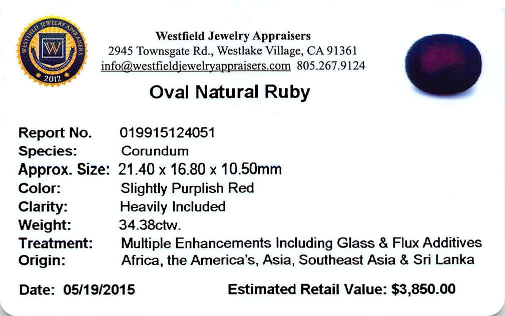 One oval mixed cut natural ruby, measuring 21.40 x 16.80 x 10.50mm, exact weight 34.38ct., clarity is heavily included, type II, very dark, very slightly brownish, slightly purplish red color, (GIA slpR 8/3), cut is good. Transmitting light somewhat diffusely, translucent. Naturally occurring internal & external characteristics are present. Indications of laboratory high temperature heat treatment, with glass & flux additives. Westfield Appraised at $3,850.00.