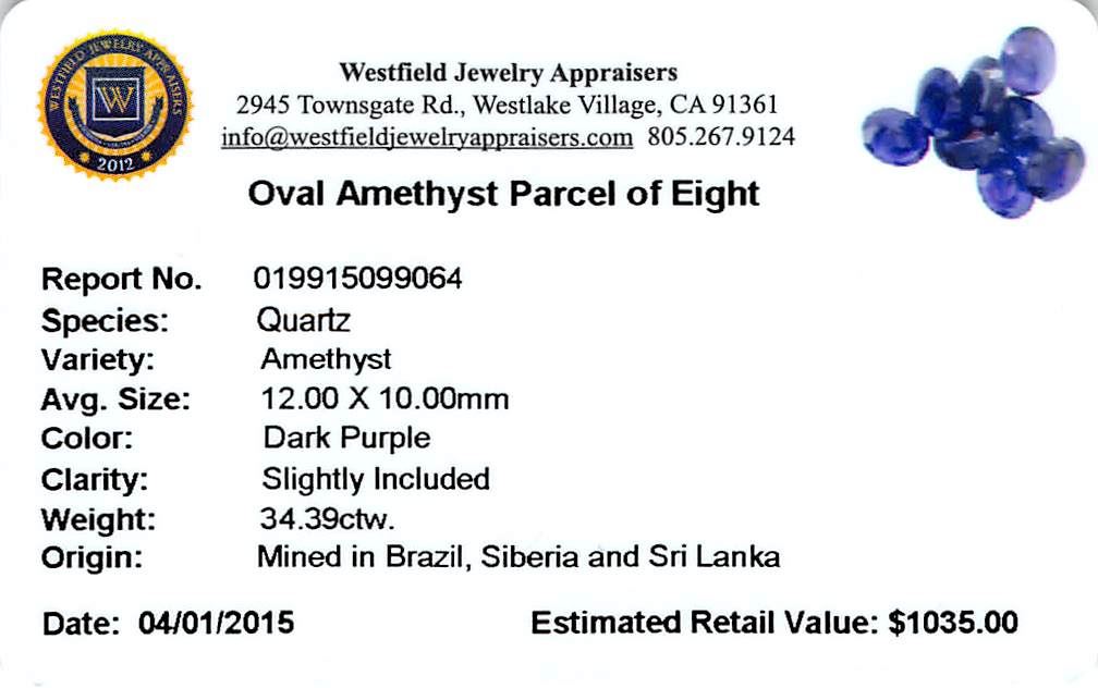 Eight oval mixed cut natural amethysts exact total weight 34.39ct., clarity is slightly included, type II, dark, very slightly grayish, purple color, (GIA P 7/3), cut is good. Westfield Appraised at $1,035.00.