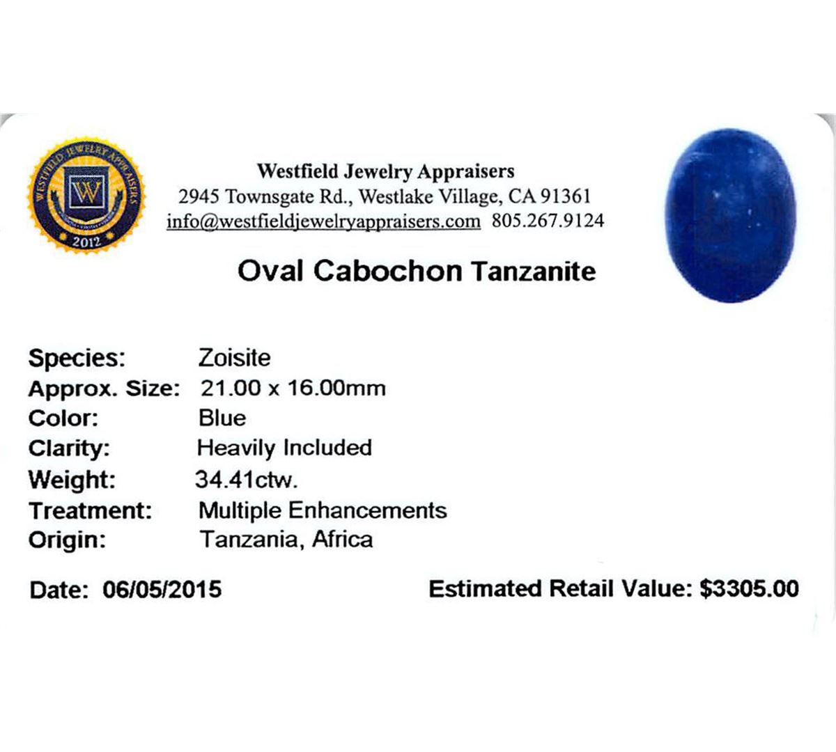 One oval cabochon cut natural tanzanite, measuring 21.00 x 16.00 x 10.00mm, exact weight 34.41ct., clarity is heavily included, type I, dark, very slightly grayish, blue color, (GIA B 7/3), cut is good. Transmitting light somewhat diffusely, transparent to translucent. Naturally occurring internal & external characteristics are present. Indications of heat treatment. Westfield Appraised at $3,305.00.