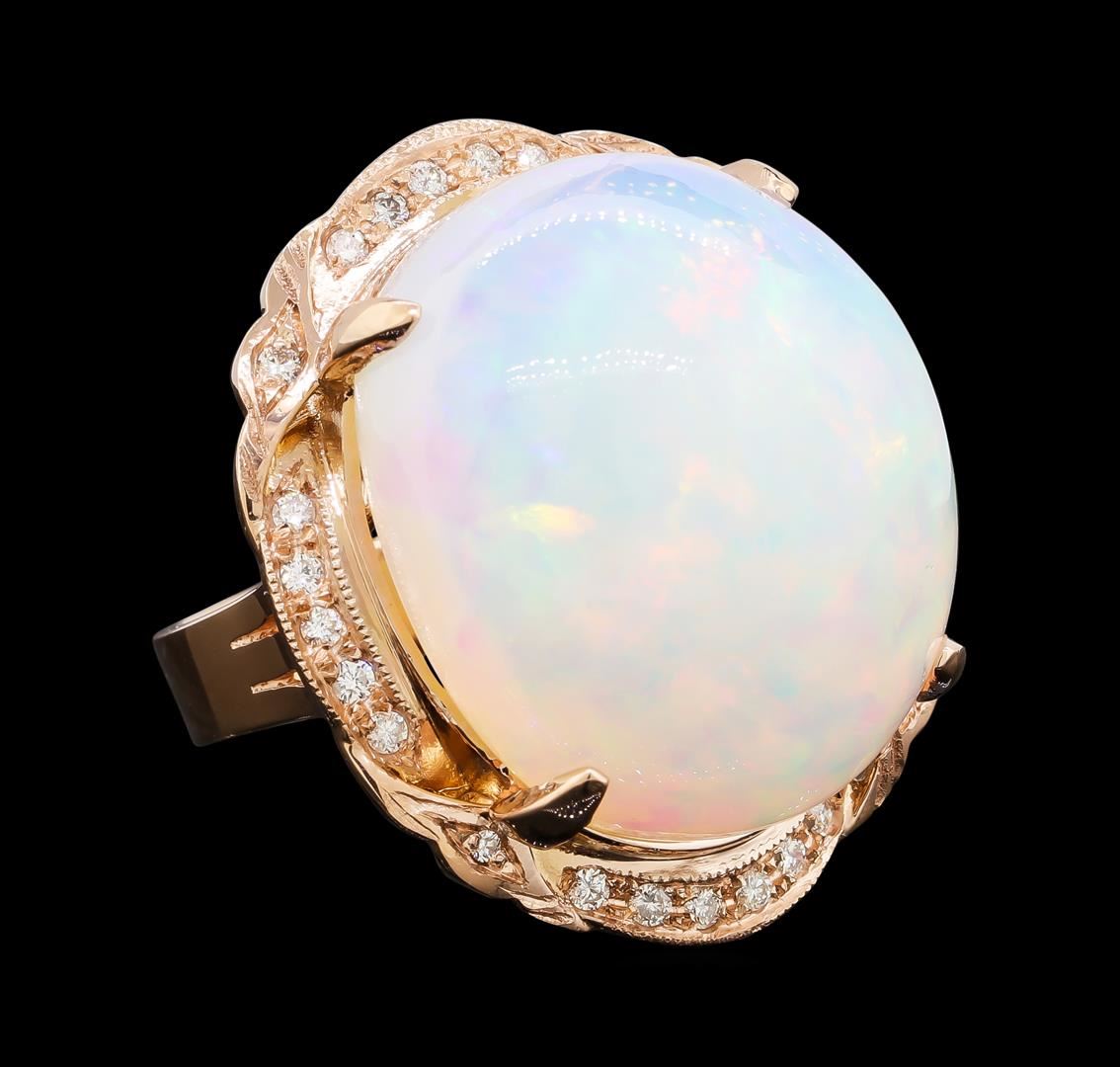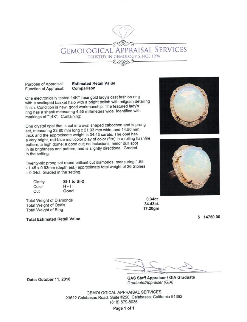 One electronically tested 14KT rose gold lady's cast fashion ring with a scalloped basket halo with a bright polish with milgrain detailing finish. The featured lady's ring has a shank measuring 4.55 millimeters wide. Identified with markings of '14K'. Condition is new, good workmanship. Containing: One crystal opal that is cut in a oval shaped cabochon and is prong set, measuring 23.80 mm long x 21.03 mm wide, and 14.50 mm thick and the approximate weight is 34.43 carats. The opal has a very bright, red-blue multicolor play of color (fire) in a rolling flashfire pattern; a high dome; a good cut; no inclusions; minor dull spot in its brightness and pattern; and is slightly directional. Graded in the setting. Twenty-Six prong set round brilliant cut diamonds, measuring 1.55 - 1.45 x 0.93mm (depth est.) approximate total weight of 26 Stones = 0.34ct. Graded in the setting. Clarity SI-1 to SI-2. Color: H - I Cut Good. Total Weight of Diamonds 0.34ct.. Total Weight of Opals 34.43ct.. Total Weight of Ring 17.20gm. GAS Appraised at $14,750.00.