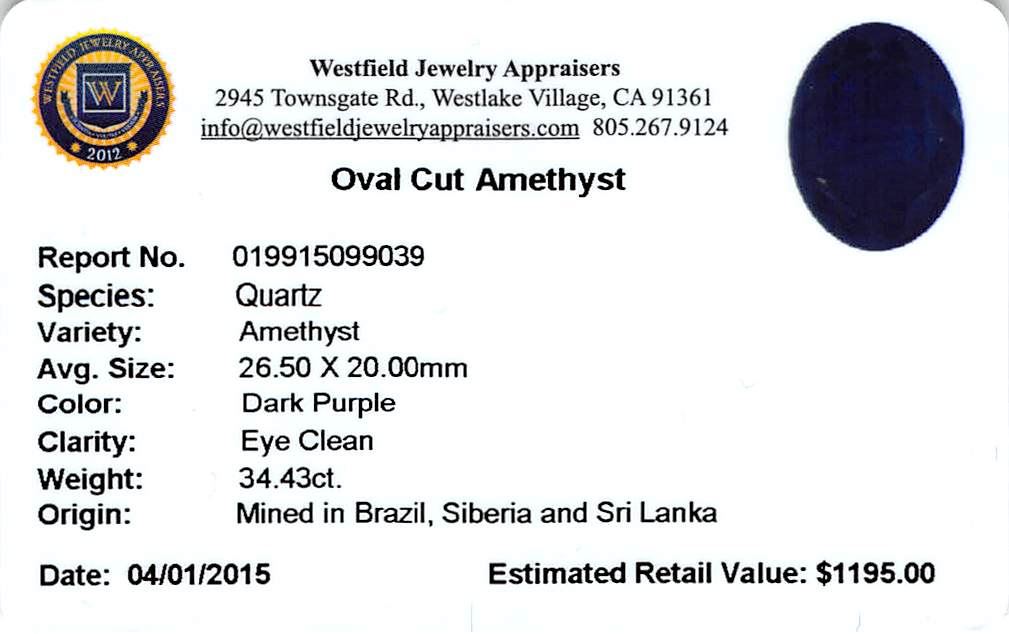 One oval cut natural amethyst exact weight 34.43ct., clarity is eye clean, type II, dark, very slightly grayish, purple color, (GIA P 7/3), cut is good. Westfield Appraised at $1,195.00.