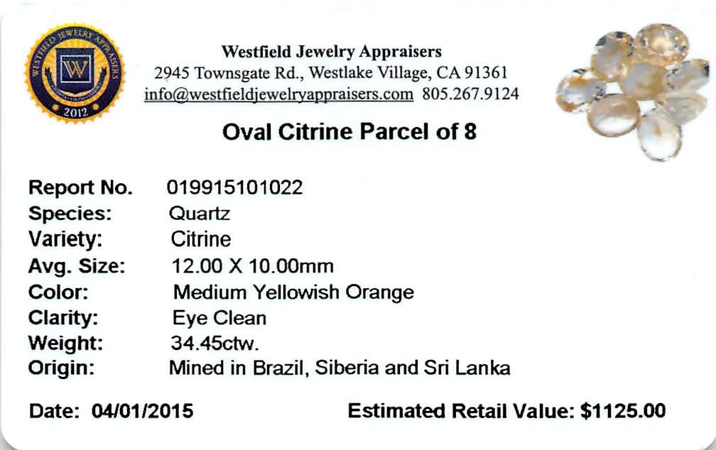 Eight oval mixed cut natural citrine quartzs exact total weight 34.45ct., clarity is eye clean, type I, medium, brownish, yellowish orange color, (GIA yO 5/3), cut is good. Westfield Appraised at $1,125.00.